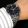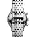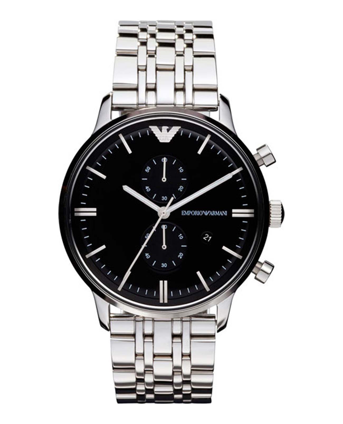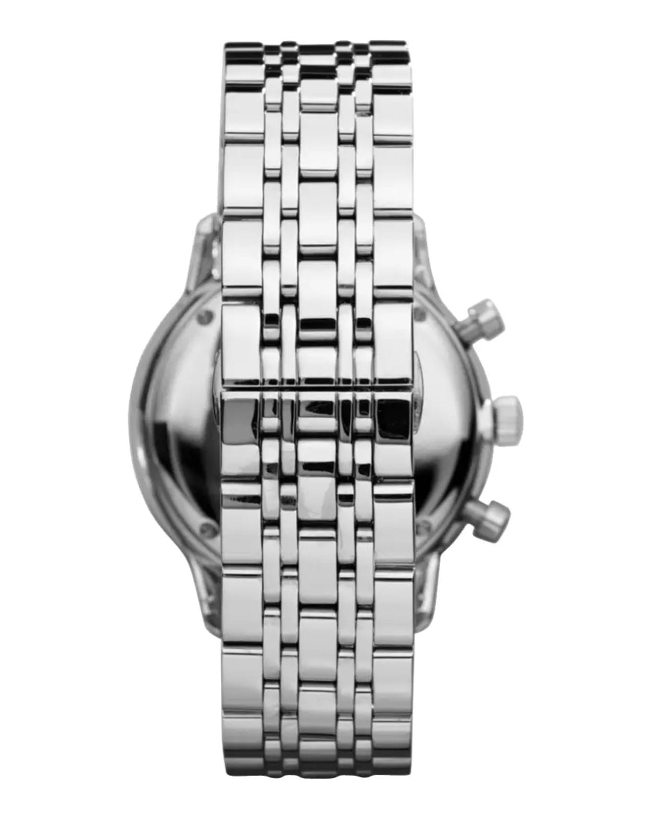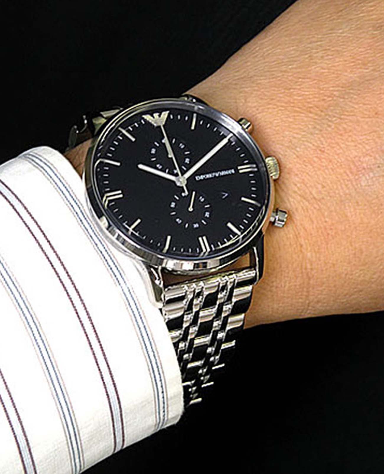 Мужские наручные часы-хронографХронографФункция позволяет измерять отрезки времени с особой точностью: часы, минуты, секунды. Верным признаком хронографа является наличие на циферблате 3 дополнительных окошек-счётчиков. с секундомеромСекундомерСекундоме́р — прибор, способный измерять интервалы времени с точностью до долей секунды. и минеральным стекломМинеральное стеклоМинеральное стекло представляет собой искусственно выращенный минерал кварца. Такое стекло отличается особой устойчивостью к повреждениям и царапинам. Уступает по некоторым качествам сапфировому стеклу. Emporio Armani Classics AR0389, кварцевый механизм с высокой точностью. Корпус часов изготовлен из стали. Окошко даты находится в положении 4 часа. Стрелки и метки с люминесцентным покрытиемЛюминесцентное покрытиеПозволяет считывать показания времени в темноте. Производители наносят на стрелки, часовые индексы, безель или поверхность циферблата светонакопительный состав, дающий холодное свечение.. Класс водозащиты: 50 метров, позволит защитить корпус от случайных брызг или капель дождя. Стальной браслет на застёжке-бабочке с кнопкамиЗастёжка "бабочка"Такой вид застёжки дополняется предохранителями, помогающими избежать случайного раскрытия браслета. Обладают изящным исполнением. .