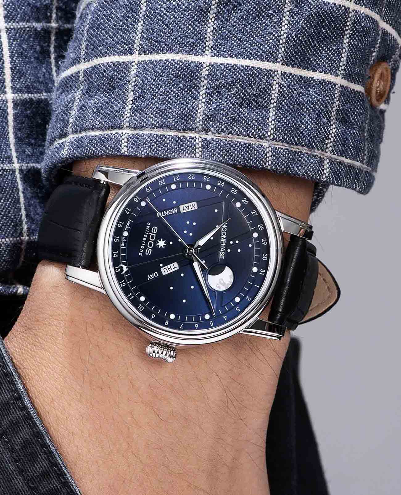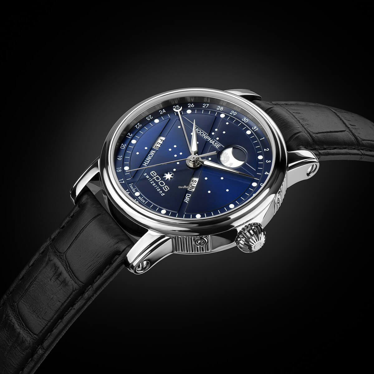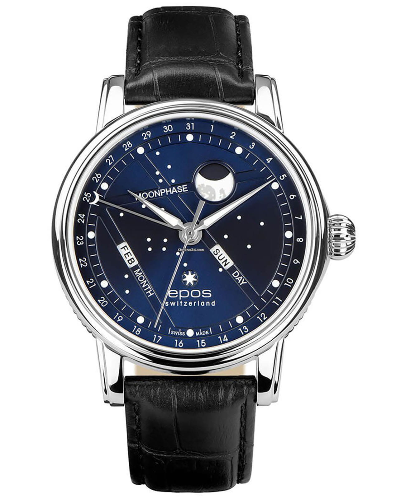 Мужские швейцарские механические часы с автоподзаводом Epos Oeuvre d'art 3439.322.20.16.25. Сапфировое стеклоСапфировое стеклоПрочный и надёжный материал из кристалла сапфира синтетического происхождения, характеризующийся особой твёрдостью и устойчивостью к царапинам и повреждениям. устойчивое к появлению царапин, обладающее высокой прозрачностью. Корпус часов изготовлен из нержавеющей стали. Стрелки и метки с люминесцентной подсветкойЛюминесцентное покрытиеПозволяет считывать показания времени в темноте. Производители наносят на стрелки, часовые индексы, безель или поверхность циферблата светонакопительный состав, дающий холодное свечение.. Часы с автоподзаводом и фазой луны с люминесцентной полярной звездой. Циферблат выполнен по технологии Sunray (солнечные лучи). Календарь. Прозрачная задняя крышка. Класс водозащиты: 50 метров, позволит защитить корпус от случайных брызг или капель дождя. Кожаный ремешок на стандартной застёжке.