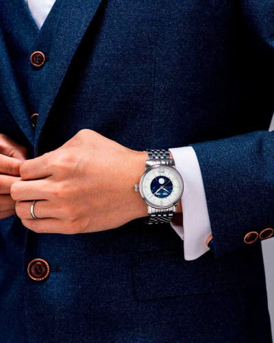 Мужские швейцарские механические часы с автоподзаводом Epos Oeuvre d'art 3439.322.20.18.30. Сапфировое стеклоСапфировое стеклоПрочный и надёжный материал из кристалла сапфира синтетического происхождения, характеризующийся особой твёрдостью и устойчивостью к царапинам и повреждениям. устойчивое к появлению царапин, обладающее высокой прозрачностью. Корпус и браслет часов изготовлен из нержавеющей стали. Стрелки и метки с люминесцентной подсветкойЛюминесцентное покрытиеПозволяет считывать показания времени в темноте. Производители наносят на стрелки, часовые индексы, безель или поверхность циферблата светонакопительный состав, дающий холодное свечение.. В механизме 25 камней, частота 28800 полуколебаний в час. Запас хода 42 часа. Механизм декорирован узором Cotes de Geneve. Циферблат выполнен по технологии Sunray (солнечные лучи). В центре циферблат дополнен изображением ночного неба со светящимися звездами и большой светящейся луной. Накладные метки в виде штрихов. Дата отображается центральной стрелкой. Окошко дня недели и месяца. Автоматический указатель фазы луны. Винтажная заводная головка. Прозрачная задняя крышка. Класс водозащиты: 50 метров, позволит защитить корпус от случайных брызг или капель дождя. Стальной браслет на раскладной застёжкеРаскладная застёжкаТакой тип застёжки используется только на браслетах из металла. Она никогда не раскрывается полностью, происходит разделение на 2 и более частей. Раскладывающая застёжка снизит вероятность потери часов к минимуму..