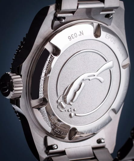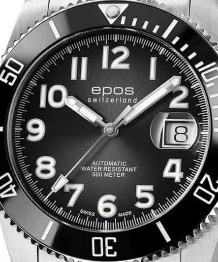 Мужские механические часы с автоподзаводом Epos из коллекции Sportive — это профессиональный дайверский инструмент с швейцарским качеством. Корпус диаметром 41,5 мм и толщиной 13,3 мм выполнен из титана, что обеспечивает лёгкость и высокую прочность. Циферблат чёрного цвета оформлен арабскими цифрами и метками. Циферблат защищён сапфировым стекломСапфировое стеклоПрочный и надёжный материал из кристалла сапфира синтетического происхождения, характеризующийся особой твёрдостью и устойчивостью к царапинам и повреждениям.. Стрелки и метки с люминесцентным покрытиемЛюминесцентное покрытиеПозволяет считывать показания времени в темноте. Производители наносят на стрелки, часовые индексы, безель или поверхность циферблата светонакопительный состав, дающий холодное свечение., обеспечивающим отличную читаемость в темноте. Механизм — швейцарский калибр Sellita SW200 с запасом хода 38 часов. Окошко даты с увеличительным стеклом расположено в положении 3 часов. БезельБезельВнешний ободок, закрепляющий стекло. В спортивных часах так называется поворотное кольцо с делениями на циферблате, выполняет роль таймера – замеряет отрезки времени на шкале. Неподвижный безель – элемент декора. Однонаправленно вращающийся безель на дайверских часах позволяет фиксировать моменты погружения и выныривания на поверхность. — однонаправленный вращающийся. Завинчивающаяся коронка и автоматический гелиевый клапан позволяют использовать часы при глубоководных погружениях. Часы оснащены титановым браслетом с раскладной застёжкойРаскладная застёжкаТакой тип застёжки используется только на браслетах из металла. Она никогда не раскрывается полностью, происходит разделение на 2 и более частей. Раскладывающая застёжка снизит вероятность потери часов к минимуму.. Водонепроницаемость 500 м соответствует требованиям для профессионального дайвинга. Гарантия — 24 месяца. Идеальный выбор для тех, кто ценит надёжность, точность и экстремальные испытания.