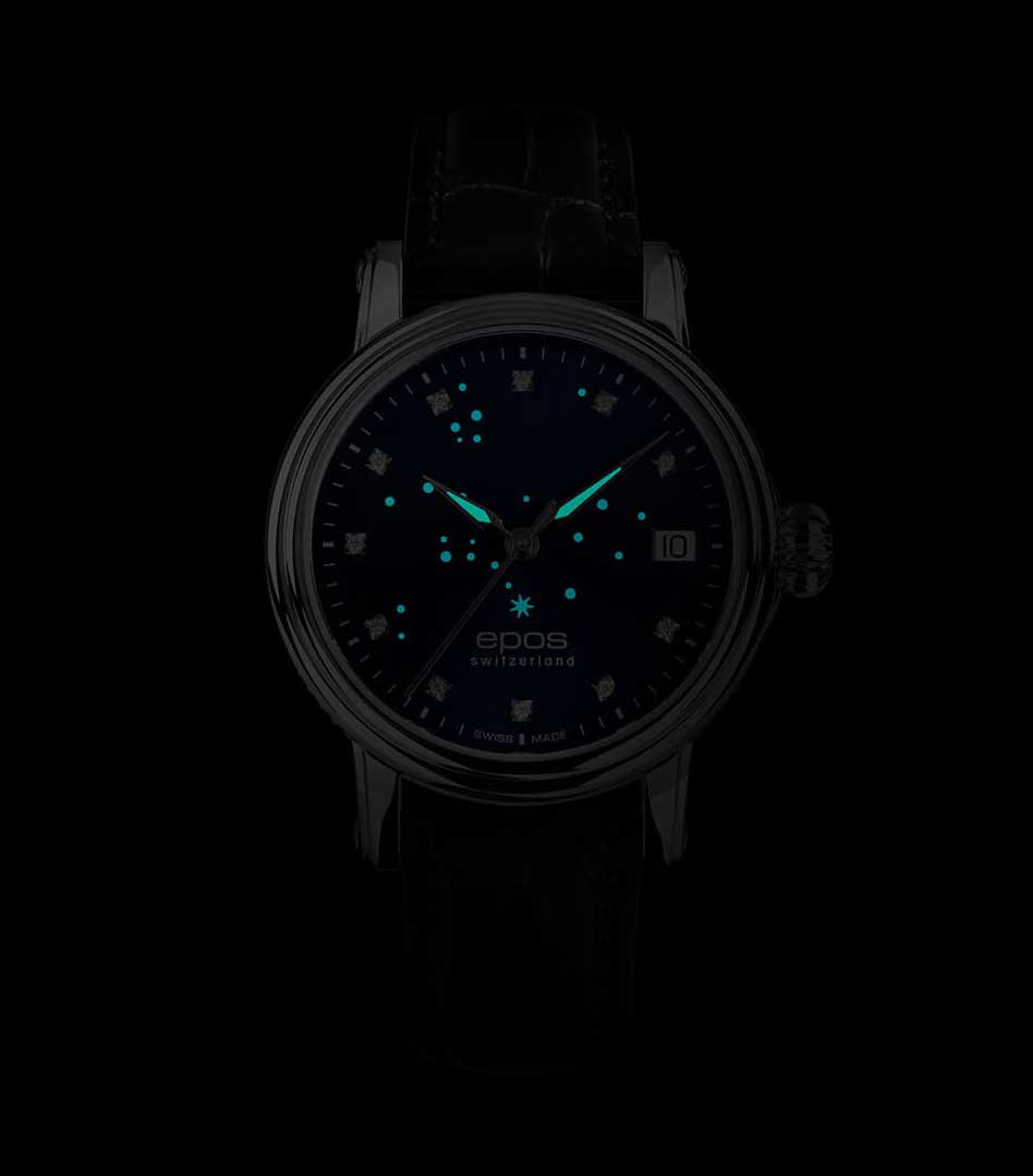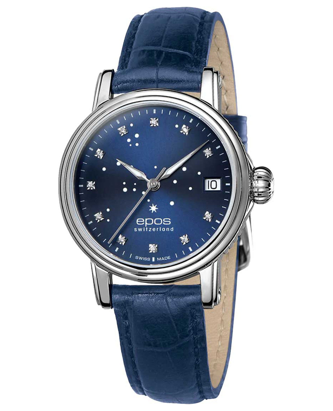 Женские механические часы с автоподзаводом Epos Ladies 4390.152.20.96.16. Сапфировое стеклоСапфировое стеклоПрочный и надёжный материал из кристалла сапфира синтетического происхождения, характеризующийся особой твёрдостью и устойчивостью к царапинам и повреждениям. устойчивое к появлению царапин, обладающее высокой прозрачностью. Корпус часов изготовлен из нержавеющей стали. В механизме 21 камень, частота 28800 полуколебаний в час. Запас хода 42 часа. Циферблат украшен 11 бриллиантами. Метки в виде точек. Окошко даты находится в положении 3 часа. Часовой механизм декорирован. Прозрачная задняя крышка с минеральным стекломМинеральное стеклоМинеральное стекло представляет собой искусственно выращенный минерал кварца. Такое стекло отличается особой устойчивостью к повреждениям и царапинам. Уступает по некоторым качествам сапфировому стеклу.. Крупная рельефная заводная головка. Водостойкость: 50 метров, позволит защитить корпус от случайных брызг или капель дождя. Кожаный ремешок на стандартной застёжке.