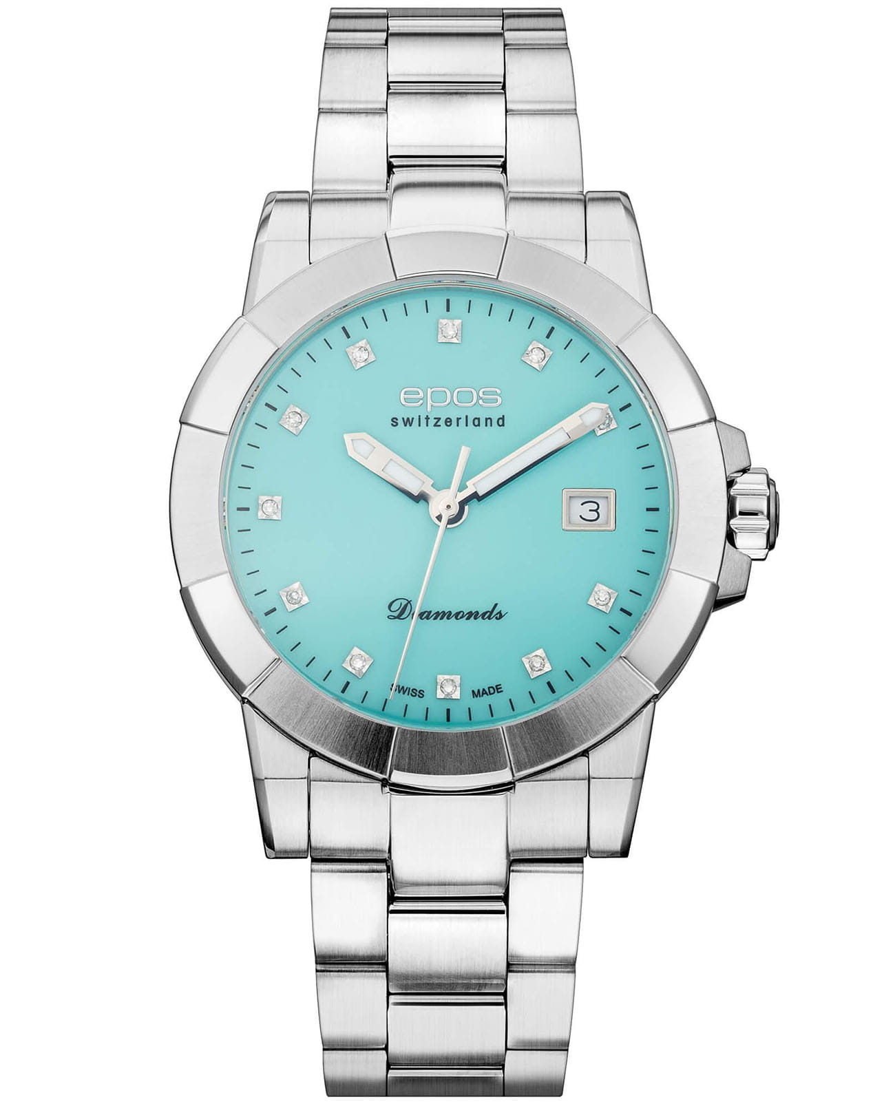 Женские кварцевые часы Epos из коллекции Ladies Diamonds — это элегантный аксессуар, сочетающий швейцарское качество и изысканный дизайн. Корпус диаметром 36 мм и толщиной 9 мм выполнен из нержавеющей стали 316L. Циферблат бирюзового цвета выполнен по технологии «солнечные лучи» и украшен синтетическими бриллиантами. Циферблат защищён сапфировым стекломСапфировое стеклоПрочный и надёжный материал из кристалла сапфира синтетического происхождения, характеризующийся особой твёрдостью и устойчивостью к царапинам и повреждениям.. Метки в виде точек инкрустированы бриллиантами. Стрелки с люминесцентным покрытиемЛюминесцентное покрытиеПозволяет считывать показания времени в темноте. Производители наносят на стрелки, часовые индексы, безель или поверхность циферблата светонакопительный состав, дающий холодное свечение., обеспечивающим хорошую читаемость в темноте. Окошко даты расположено в положении 3 часов. Механизм — швейцарский кварцевый калибр Ronda 705. Часы оснащены стальным браслетом на раскладной застёжкеРаскладная застёжкаТакой тип застёжки используется только на браслетах из металла. Она никогда не раскрывается полностью, происходит разделение на 2 и более частей. Раскладывающая застёжка снизит вероятность потери часов к минимуму.. Водонепроницаемость 50 м позволяет использовать часы в повседневных условиях. Гарантия — 24 месяца. Идеальный выбор для тех, кто ценит роскошь, стиль и точность.