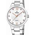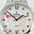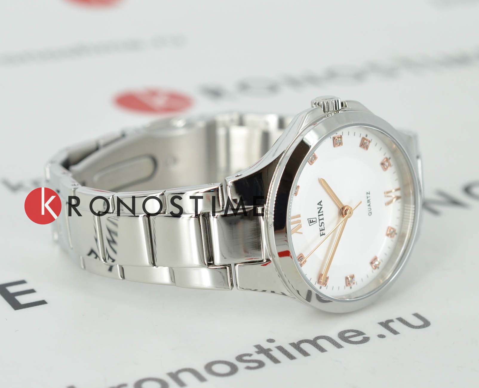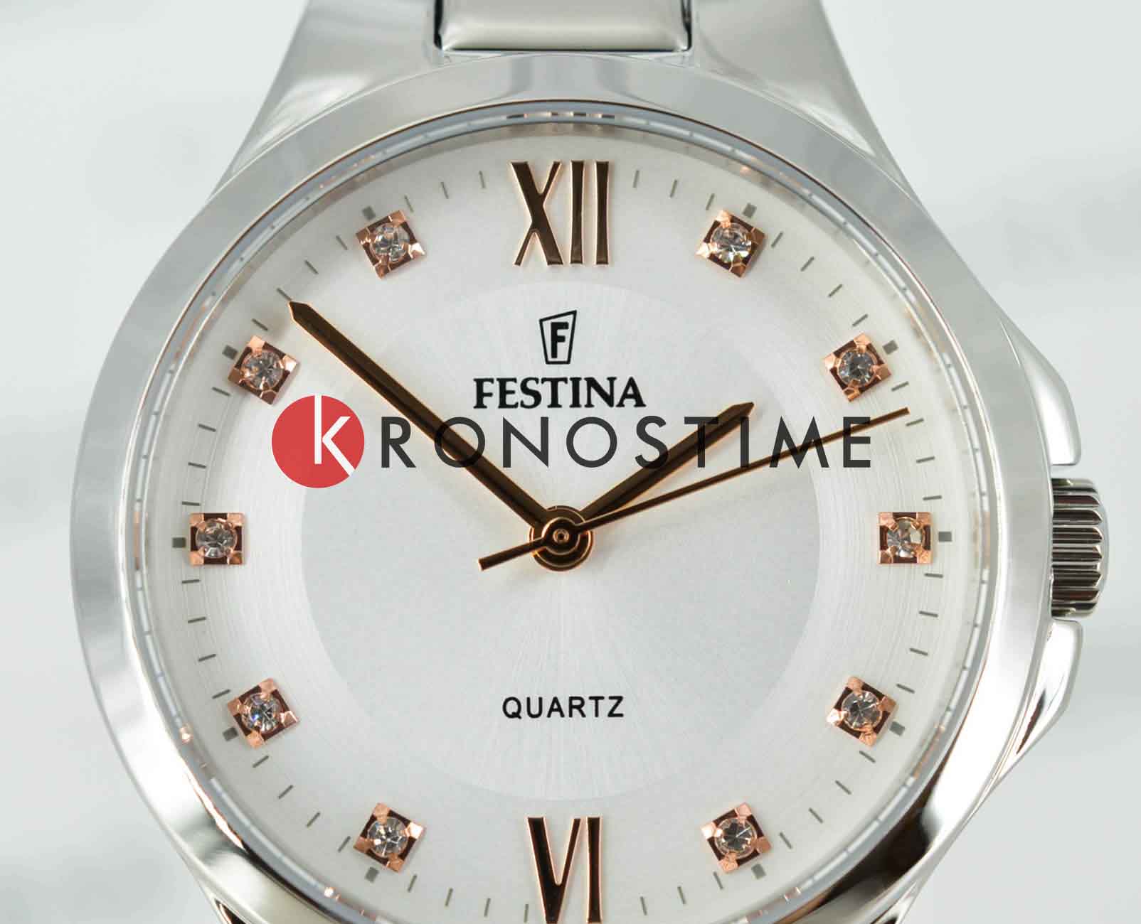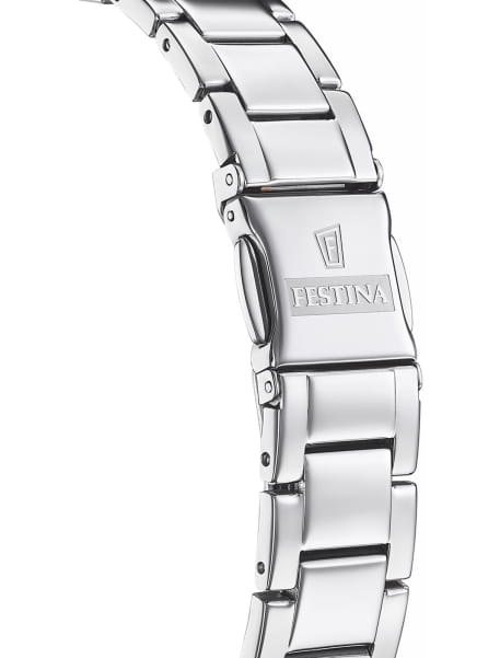Часы Festina F20582/1 из коллекции Mademoiselle — элегантная женская модель, сочетающая изысканный дизайн и надёжность. Корпус диаметром 34 мм выполнен из нержавеющей стали, украшен декоративными кристаллами на безелеБезельВнешний ободок, закрепляющий стекло. В спортивных часах так называется поворотное кольцо с делениями на циферблате, выполняет роль таймера – замеряет отрезки времени на шкале. Неподвижный безель – элемент декора. Однонаправленно вращающийся безель на дайверских часах позволяет фиксировать моменты погружения и выныривания на поверхность.. Серебристый циферблат с изящными стрелками, маркерами, украшенными цирконами, и римскими цифрами защищён минеральным стекломМинеральное стеклоМинеральное стекло представляет собой искусственно выращенный минерал кварца. Такое стекло отличается особой устойчивостью к повреждениям и царапинам. Уступает по некоторым качествам сапфировому стеклу.. Модель оснащена кварцевым механизмом, обеспечивающим высокую точность хода. Водозащита до 50 метров позволяет использовать часы для ежедневного ношения, включая умывание или приём душа. Удобный браслет с раскладной застёжкойРаскладная застёжкаТакой тип застёжки используется только на браслетах из металла. Она никогда не раскрывается полностью, происходит разделение на 2 и более частей. Раскладывающая застёжка снизит вероятность потери часов к минимуму. плотно фиксируется на запястье и добавляет комфорта при носке. Эти часы подчёркивают утончённый вкус своей обладательницы и идеально подходят как для повседневного ношения, так и для особых случаев.