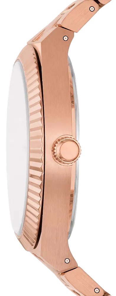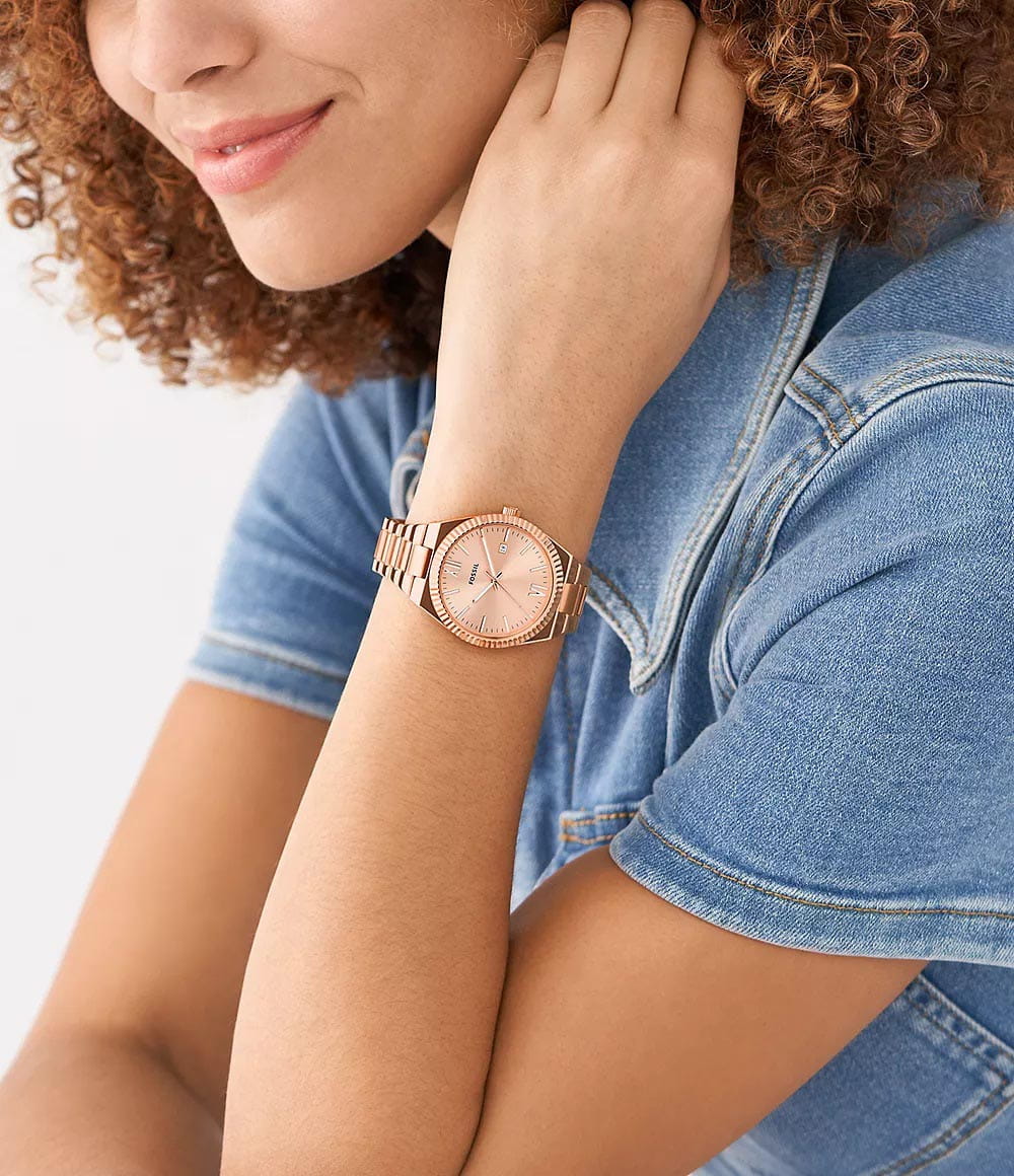 Женские американские кварцевые часы с минеральным стекломМинеральное стеклоМинеральное стекло представляет собой искусственно выращенный минерал кварца. Такое стекло отличается особой устойчивостью к повреждениям и царапинам. Уступает по некоторым качествам сапфировому стеклу. Fossil Scarlette ES5258, кварцевый механизм с высокой точностью. Класс водозащиты: 50 метров, позволит защитить корпус от случайных брызг или капель дождя. Корпус часов изготовлен из стали с IP-покрытиемIP-покрытиеМетод ионного напыления. Демонстрирует повышенную устойчивость к истиранию, окислению и химическим веществам. Под воздействием высокого давления и температуры около 1500°C молекулы металла надёжно соединяются с частицами корпуса часов.. БезельБезельВнешний ободок, закрепляющий стекло. В спортивных часах так называется поворотное кольцо с делениями на циферблате, выполняет роль таймера – замеряет отрезки времени на шкале. Неподвижный безель – элемент декора. Однонаправленно вращающийся безель на дайверских часах позволяет фиксировать моменты погружения и выныривания на поверхность. с IP-покрытиемIP-покрытиеМетод ионного напыления. Демонстрирует повышенную устойчивость к истиранию, окислению и химическим веществам. Под воздействием высокого давления и температуры около 1500°C молекулы металла надёжно соединяются с частицами корпуса часов.. Стальной браслет с раскладной застёжкойРаскладная застёжкаТакой тип застёжки используется только на браслетах из металла. Она никогда не раскрывается полностью, происходит разделение на 2 и более частей. Раскладывающая застёжка снизит вероятность потери часов к минимуму. с IP-покрытиемIP-покрытиеМетод ионного напыления. Демонстрирует повышенную устойчивость к истиранию, окислению и химическим веществам. Под воздействием высокого давления и температуры около 1500°C молекулы металла надёжно соединяются с частицами корпуса часов.. Окошко даты находятся в положении 3 часа. Стрелки и метки с люминесцентным покрытиемЛюминесцентное покрытиеПозволяет считывать показания времени в темноте. Производители наносят на стрелки, часовые индексы, безель или поверхность циферблата светонакопительный состав, дающий холодное свечение..