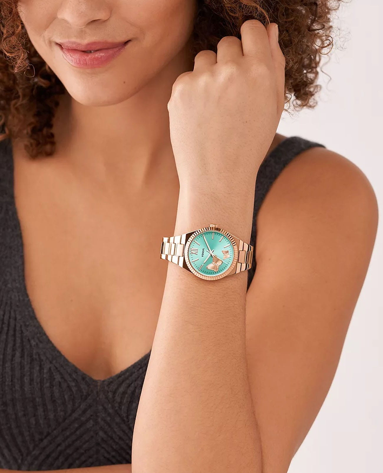 Женские американские часы с минеральным стекломМинеральное стеклоМинеральное стекло представляет собой искусственно выращенный минерал кварца. Такое стекло отличается особой устойчивостью к повреждениям и царапинам. Уступает по некоторым качествам сапфировому стеклу. Fossil Scarlette ES5277, кварцевый механизм с высокой точностью. Корпус и браслет часов изготовлены из нержавеющей стали с IP-покрытиемIP-покрытиеМетод ионного напыления. Демонстрирует повышенную устойчивость к истиранию, окислению и химическим веществам. Под воздействием высокого давления и температуры около 1500°C молекулы металла надёжно соединяются с частицами корпуса часов.. Циферблат украшен объемным изображением бабочек. Метки в виде штрихов и римской цифры. Рифленая заводная головка с защитой. Класс водозащиты: 50 метров, позволит защитить корпус от случайных брызг или капель дождя. Стальной браслет на раскладной застёжкеРаскладная застёжкаТакой тип застёжки используется только на браслетах из металла. Она никогда не раскрывается полностью, происходит разделение на 2 и более частей. Раскладывающая застёжка снизит вероятность потери часов к минимуму..
