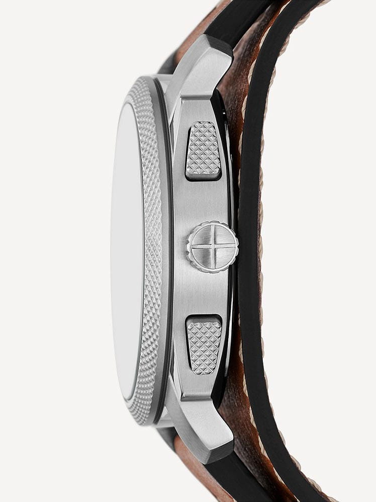 Мужские американские часы-хронографХронографФункция позволяет измерять отрезки времени с особой точностью: часы, минуты, секунды. Верным признаком хронографа является наличие на циферблате 3 дополнительных окошек-счётчиков. с секундомеромСекундомерСекундоме́р — прибор, способный измерять интервалы времени с точностью до долей секунды. Fossil Machine FS5962, кварцевый механизм с высокой точностью. Класс водозащиты: 50 метров, позволит защитить корпус от случайных брызг или капель дождя. Корпус часов изготовлен из стали. Метки в виде штрихов. Окошко даты находится между часовыми отметками 4 и 5. Рифленая заводная головка. Ремешок из эко-кожи с классической застежкой. Рифленая заводная головка и безельБезельВнешний ободок, закрепляющий стекло. В спортивных часах так называется поворотное кольцо с делениями на циферблате, выполняет роль таймера – замеряет отрезки времени на шкале. Неподвижный безель – элемент декора. Однонаправленно вращающийся безель на дайверских часах позволяет фиксировать моменты погружения и выныривания на поверхность..