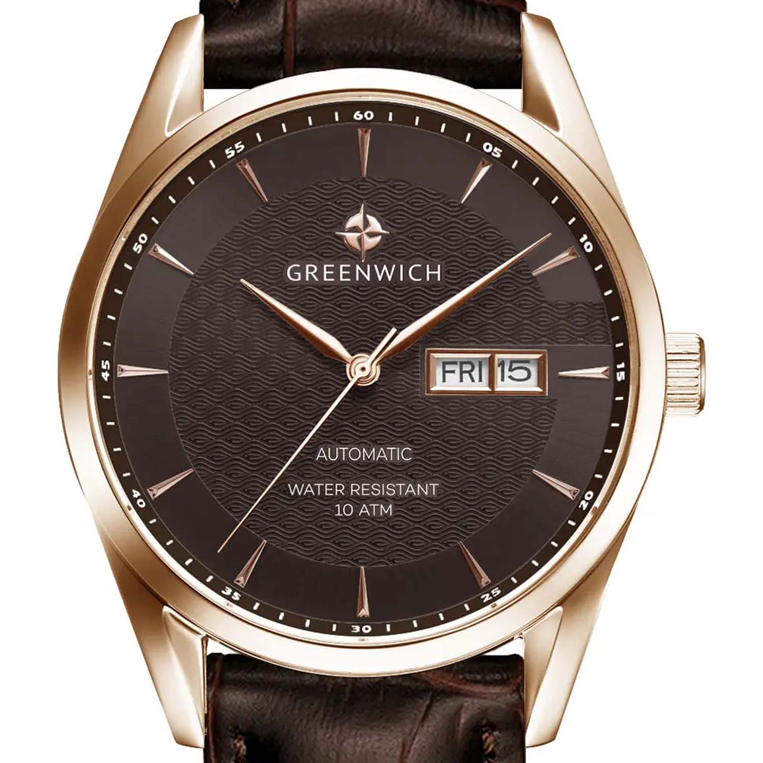 Мужские часы с минеральным стекломМинеральное стеклоМинеральное стекло представляет собой искусственно выращенный минерал кварца. Такое стекло отличается особой устойчивостью к повреждениям и царапинам. Уступает по некоторым качествам сапфировому стеклу. Greenwich Good Luck Classic GW 074.42.32, представляют собой классический вариант для повседневной носки. В центральной части циферблата — отличительная черта моделей этой серии: гильоше, объемные линии которого напоминают волны. Обратите внимание на форму пластины, где крепятся накладные риски: она сделана в форме латинской буквы G, первой буквы в названии бренда. Часы характеризуются традиционными формами, лаконичным исполнением, что делает модель элегантным дополнением к деловому костюму. Сквозь прозрачную заднюю крышку вы увидите детали механизма TMI с декорированным ротором: на нем выгравировано изображение символа английских моряков — парусника. Ремешок на стандартной застёжке выполнен из натуральной кожи с прошивкой в тон. Дизайн, актуальный для любого современного образа, и надежность используемых материалов делают автоматические часы Greenwich удобным и стильным аксессуаром на каждый день. Окошко даты и дня недели находится в положении 3 часа. Класс водозащиты: 100 метров, позволит плавать, нырять и заниматься другими водными видами спорта. Корпус с PVD-покрытиемPVDУльтратонкое покрытие наносится в технике вакуумного напыления, сочетает в себе нитрид титана особой прочности со слоем золота или оксида хрома. Несёт в себе декоративную или защитную функцию..