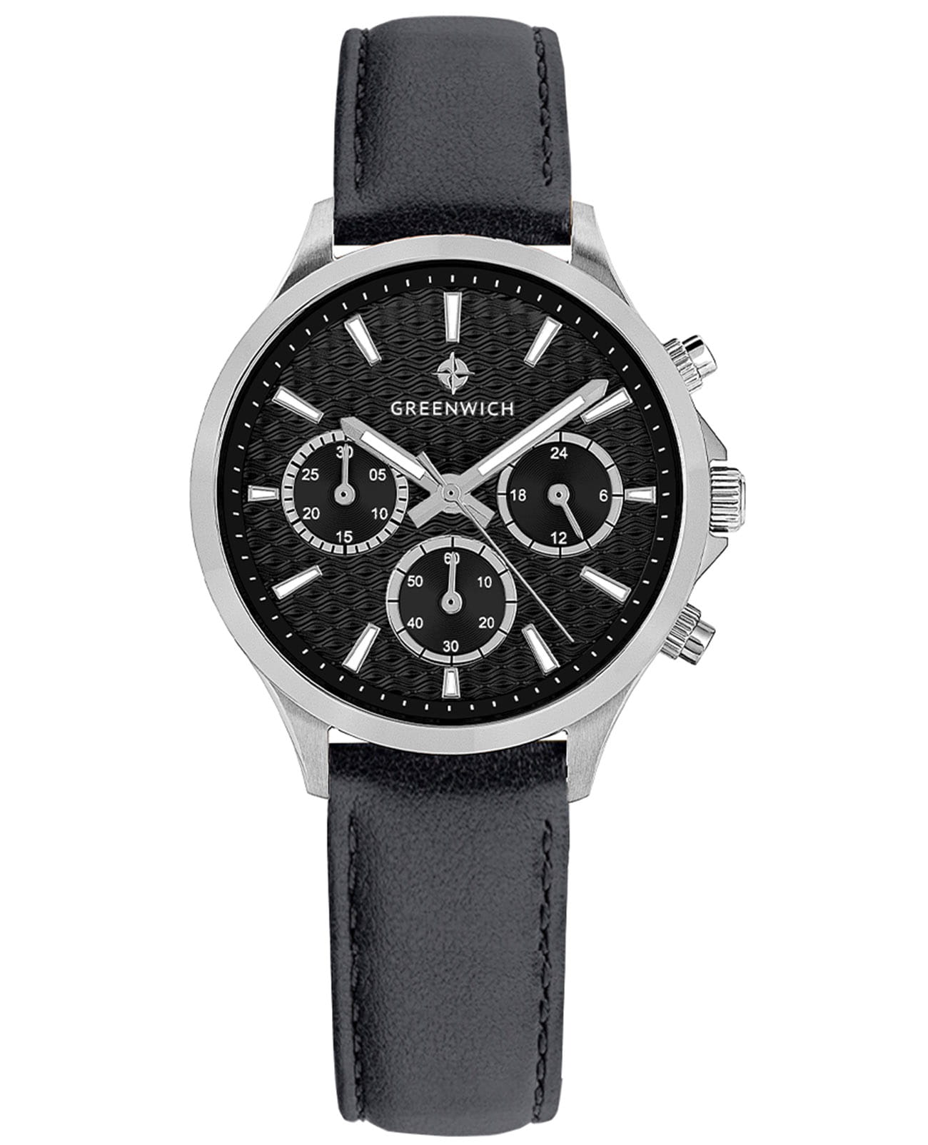 Женские кварцевые часы Greenwich из коллекции Mermaid — это сочетание элегантности и функциональности. Корпус диаметром 35 мм выполнен из нержавеющей стали. Циферблат чёрного цвета оформлен с эффектом гильоше в виде волнообразных линий, придающим ему объём и глубину. На циферблате расположены субциферблаты хронографа (секундомер на 60 секунд и 30 минут) и индикатор 24-часового формата. Все индикаторы выделены рамками с зеркальной полировкой. Стрелки и метки с люминесцентным покрытиемЛюминесцентное покрытиеПозволяет считывать показания времени в темноте. Производители наносят на стрелки, часовые индексы, безель или поверхность циферблата светонакопительный состав, дающий холодное свечение., обеспечивающим хорошую читаемость в темноте. Циферблат защищён минеральным стекломМинеральное стеклоМинеральное стекло представляет собой искусственно выращенный минерал кварца. Такое стекло отличается особой устойчивостью к повреждениям и царапинам. Уступает по некоторым качествам сапфировому стеклу.. Механизм — кварцевый калибр Miyota с функцией хронографа. Часы оснащены кожаным ремешком чёрного цвета с классической пряжкой из нержавеющей стали. Водонепроницаемость 100 м позволяет использовать часы для плавания и повседневного ношения. Гарантия — 24 месяца. Идеальный выбор для тех, кто ценит стиль, точность и надёжность.
