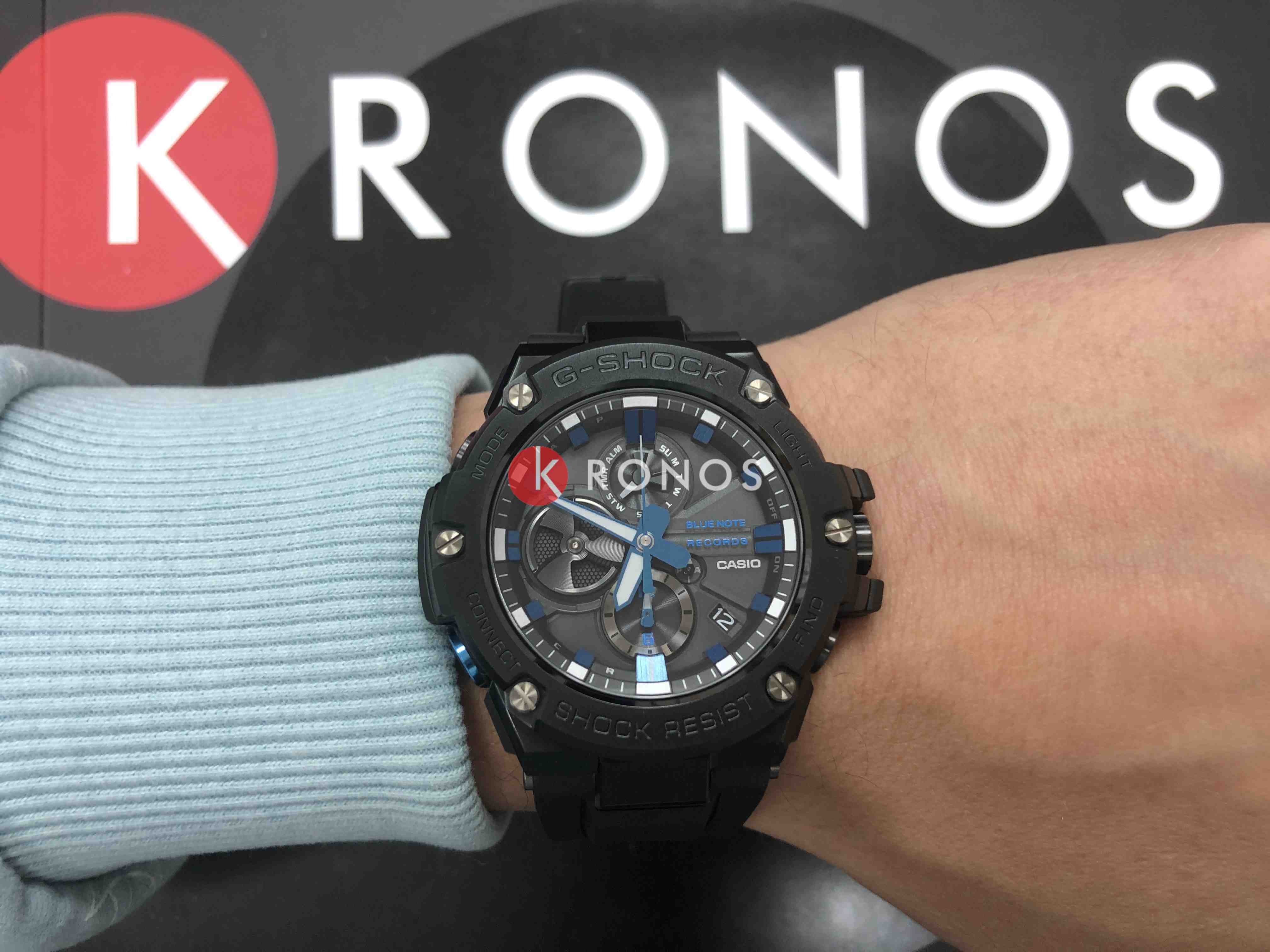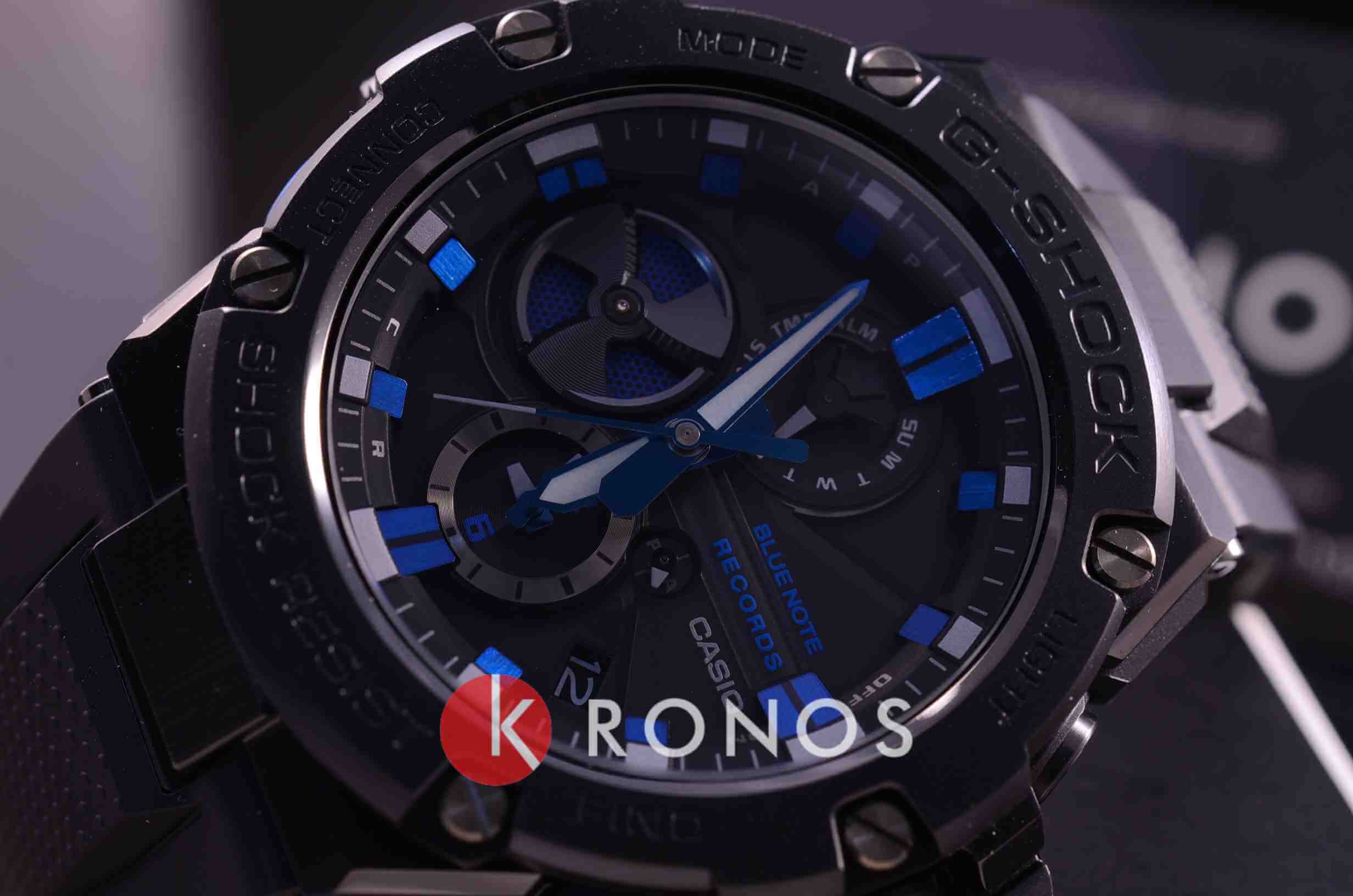 Наручные часы обладают одним из самых тонких корпусов среди стальных моделей G-Shock. Чёрное матовое исполнение имеет яркие акценты в виде синей металлической застёжки и деталей циферблата. Премиальный аксессуар особенно подойдёт тем, кто неравнодушен к оригинальным предметам и любит создавать эксклюзивные образы. Модель оснащена солнечной батарейкой - , индикатор заряда батарейки показывает состояние аккумулятора. Противоударный корпусУдаропрочный корпусМеханизм заключён в корпус, выполненный из современных материалов, устойчивых к ударам, механическим повреждениям и падению с высоты: инновационный пластик, карбон, нержавеющая сталь, титан. из пластика и нержавеющей стали 316L с IP-покрытиемIP-покрытиеМетод ионного напыления. Демонстрирует повышенную устойчивость к истиранию, окислению и химическим веществам. Под воздействием высокого давления и температуры около 1500°C молекулы металла надёжно соединяются с частицами корпуса часов.. Минеральное стекло. Задняя крышка с логотипом Blue Note Records. СветодиоднаяСветодиодная подсветкаСветодиодная или LED-подсветка обеспечивает появление яркого холодного свечения за счёт LED-элементов - маленьких лампочек. Они потребляют минимальное количество энергии, чаще всего можно встретить 1 светодиод, в нижней части циферблата. и люминесцентная подсветкаЛюминесцентное покрытиеПозволяет считывать показания времени в темноте. Производители наносят на стрелки, часовые индексы, безель или поверхность циферблата светонакопительный состав, дающий холодное свечение.. Ремешок из полимерного материала. Завинчивающаяся заводная головка. Технология BluetoothBluetoothСовременная технология, позволяющая синхронизировать часы с телефоном и переносить данные. Часы с Bluetooth расширяют возможности вашего смартфона и делают его использование ещё более удобным., секундомер, будильник, хронографХронографФункция позволяет измерять отрезки времени с особой точностью: часы, минуты, секунды. Верным признаком хронографа является наличие на циферблате 3 дополнительных окошек-счётчиков., мировое времяМировое время Полезное часовое усложнение, отображающее время в основных городах и известных областях по всему миру, оно связано с часовыми поясами, удобно для путешественников и бизнесменов. , автоматический календарь, таймер. Габариты: 58,1 x 53,8 x 14,1 мм.