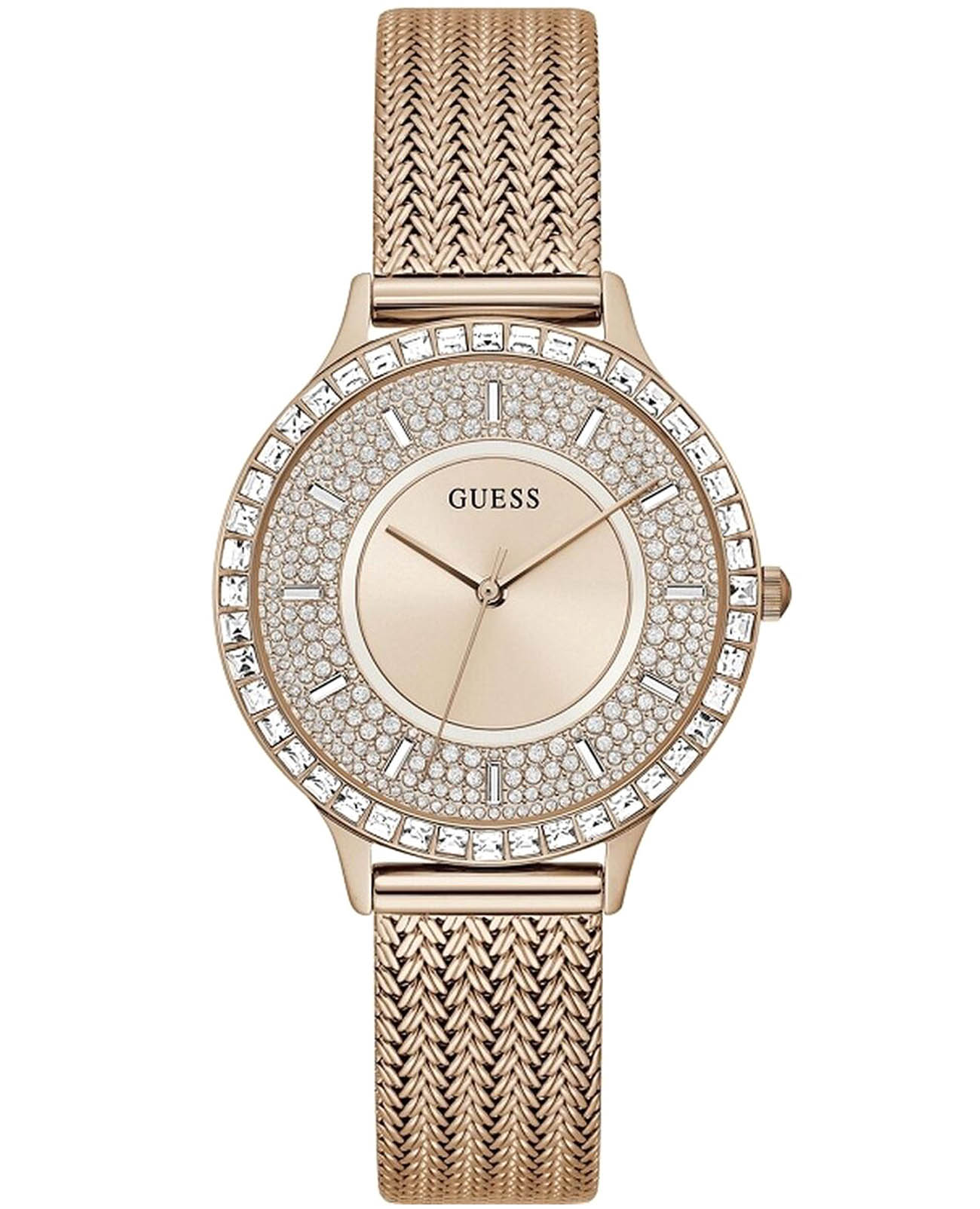 Наручные часы Guess Dress Steel GW0402L3 — изысканный аксессуар, сочетающий в себе элегантность и современный стиль. Круглый корпус диаметром 38 мм из стали с IP-покрытиемIP-покрытиеМетод ионного напыления. Демонстрирует повышенную устойчивость к истиранию, окислению и химическим веществам. Под воздействием высокого давления и температуры около 1500°C молекулы металла надёжно соединяются с частицами корпуса часов. цвета розового золота придает часам прочность и устойчивость к износу, обеспечивая их привлекательный внешний вид на долгие годы. Циферблат и безельБезельВнешний ободок, закрепляющий стекло. В спортивных часах так называется поворотное кольцо с делениями на циферблате, выполняет роль таймера – замеряет отрезки времени на шкале. Неподвижный безель – элемент декора. Однонаправленно вращающийся безель на дайверских часах позволяет фиксировать моменты погружения и выныривания на поверхность. украшены кристаллами, что придает часам утонченность и изысканность. Минеральное стеклоМинеральное стеклоМинеральное стекло представляет собой искусственно выращенный минерал кварца. Такое стекло отличается особой устойчивостью к повреждениям и царапинам. Уступает по некоторым качествам сапфировому стеклу. защищает циферблат от царапин и других повреждений. Рифленая заводная головка обеспечивает удобство в использовании и подчеркивает внимание к деталям. Часы оснащены стальным браслетом с золотистым IP-покрытиемIP-покрытиеМетод ионного напыления. Демонстрирует повышенную устойчивость к истиранию, окислению и химическим веществам. Под воздействием высокого давления и температуры около 1500°C молекулы металла надёжно соединяются с частицами корпуса часов., который обеспечивает надежность и комфорт. Раскладная замокРаскладная застёжкаТакой тип застёжки используется только на браслетах из металла. Она никогда не раскрывается полностью, происходит разделение на 2 и более частей. Раскладывающая застёжка снизит вероятность потери часов к минимуму. гарантирует легкость и безопасность при ношении. Водозащита уровня 30WR защищает часы от случайных брызг, делая их подходящими для повседневного использования.