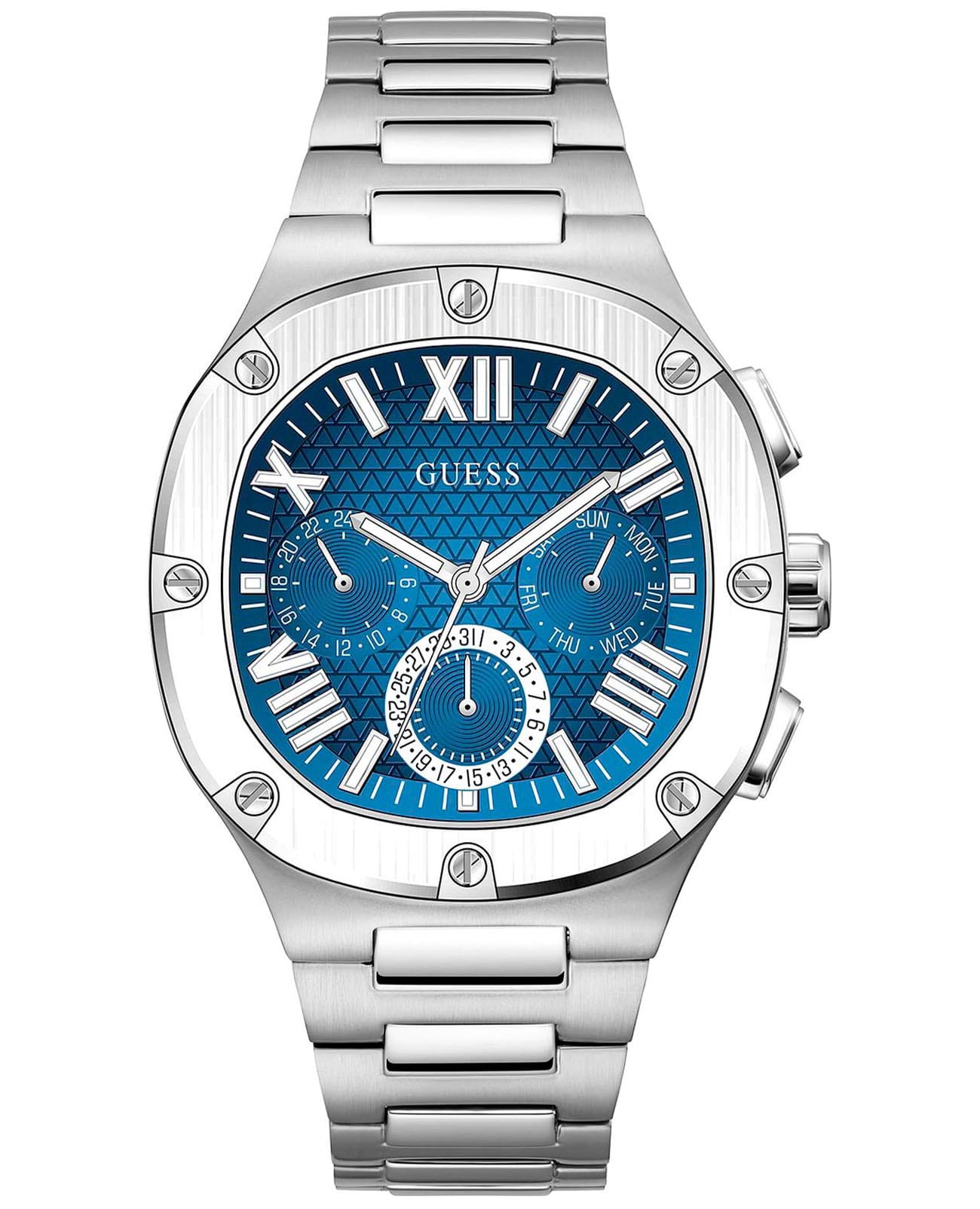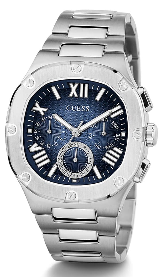 Мужские наручные часы Guess Headline GW0572G1 с минеральным стекломМинеральное стеклоМинеральное стекло представляет собой искусственно выращенный минерал кварца. Такое стекло отличается особой устойчивостью к повреждениям и царапинам. Уступает по некоторым качествам сапфировому стеклу., кварцевый механизм с высокой точностью. Класс водозащиты: 50 метров, позволит защитить корпус от случайных брызг или капель дождя. Стрелки с люминесцентным покрытиемЛюминесцентное покрытиеПозволяет считывать показания времени в темноте. Производители наносят на стрелки, часовые индексы, безель или поверхность циферблата светонакопительный состав, дающий холодное свечение.. Корпус часов и безельБезельВнешний ободок, закрепляющий стекло. В спортивных часах так называется поворотное кольцо с делениями на циферблате, выполняет роль таймера – замеряет отрезки времени на шкале. Неподвижный безель – элемент декора. Однонаправленно вращающийся безель на дайверских часах позволяет фиксировать моменты погружения и выныривания на поверхность. изготовлены из стали. Стальной браслет на раскладной застёжкеРаскладная застёжкаТакой тип застёжки используется только на браслетах из металла. Она никогда не раскрывается полностью, происходит разделение на 2 и более частей. Раскладывающая застёжка снизит вероятность потери часов к минимуму.. Рифленая заводная головка. Гильошированный циферблат. 24-х часовой формат времени, число и день недели отображаются на отдельных циферблатах. Метки в виде римских цифр и штрихов.