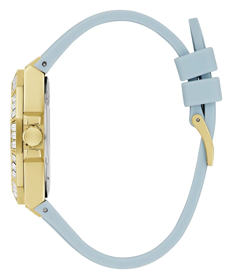 Женские наручные часы Guess GW0695L1 с минеральным стекломМинеральное стеклоМинеральное стекло представляет собой искусственно выращенный минерал кварца. Такое стекло отличается особой устойчивостью к повреждениям и царапинам. Уступает по некоторым качествам сапфировому стеклу., кварцевый механизм с высокой точностью. Корпус часов изготовлен из стали с IP-покрытиемIP-покрытиеМетод ионного напыления. Демонстрирует повышенную устойчивость к истиранию, окислению и химическим веществам. Под воздействием высокого давления и температуры около 1500°C молекулы металла надёжно соединяются с частицами корпуса часов.. Стрелки с люминесцентным покрытиемЛюминесцентное покрытиеПозволяет считывать показания времени в темноте. Производители наносят на стрелки, часовые индексы, безель или поверхность циферблата светонакопительный состав, дающий холодное свечение.. Класс водозащиты: 50 метров, позволит защитить корпус от случайных брызг или капель дождя. Силиконовый ремешок.