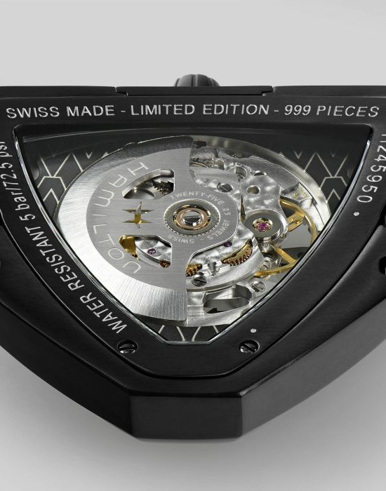 Мужские механические швейцарские часы из лимитированной серии в 999 экземпляров Hamilton Ventura Skeleton Auto H24595331, механический механизм (автоматический калибр) с высокой точностью. Сапфировое стекло устойчивое к появлению царапин, обладающее высокой прозрачностью. Класс водозащиты: 50 метров, позволит защитить корпус от случайных брызг или капель дождя. Корпус часов изготовлен из стали, черного цвета.