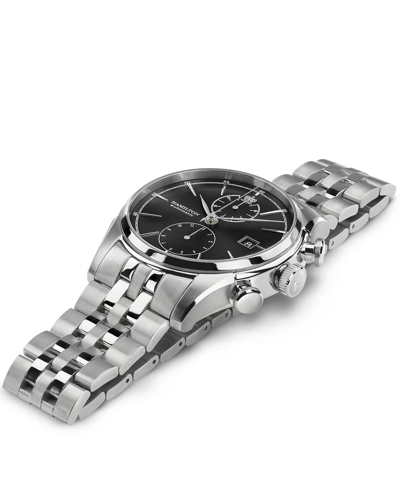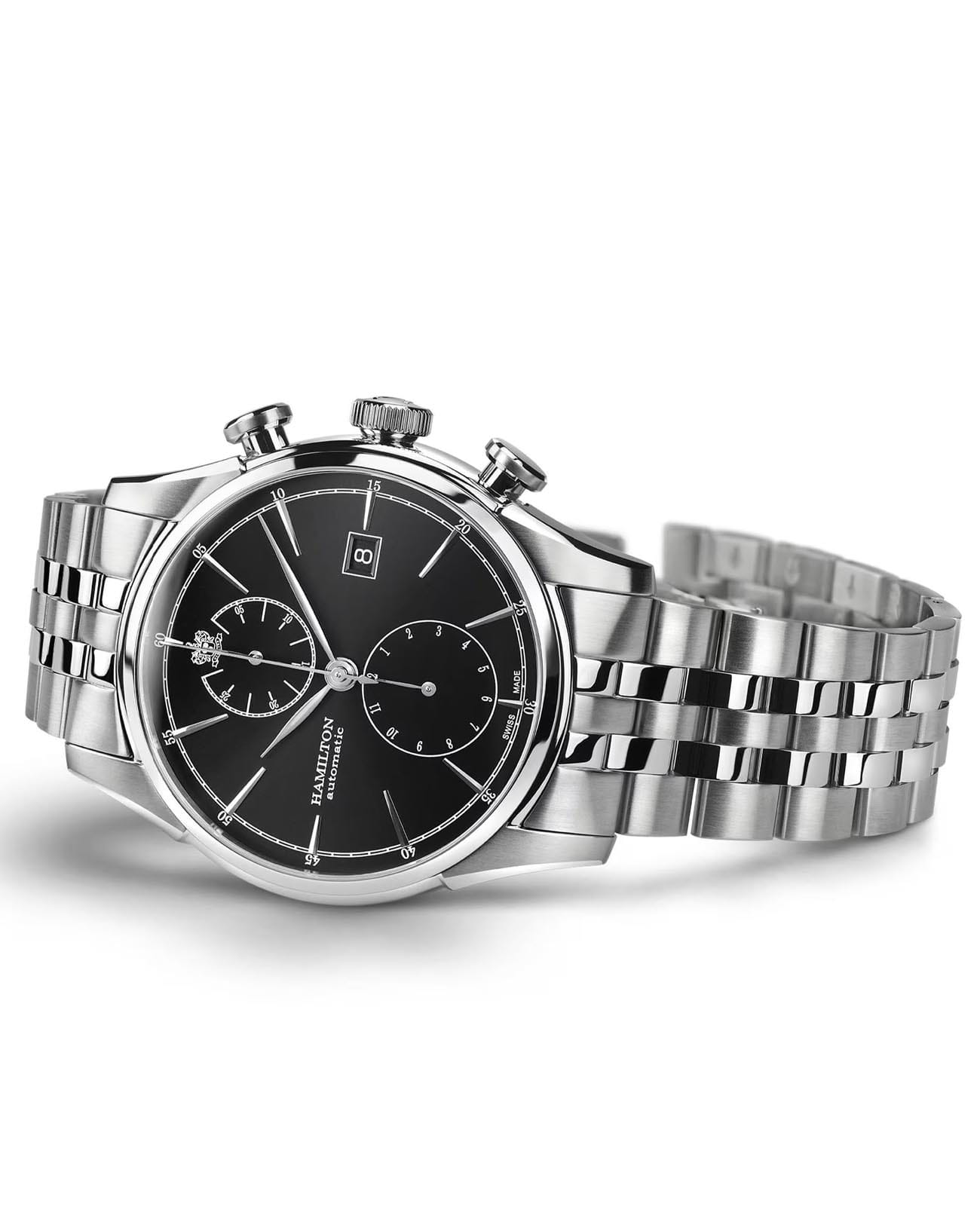 Мужские механические часы Hamilton American Classic Spirit of Liberty Auto Chrono H32416131 c хронографомХронографФункция позволяет измерять отрезки времени с особой точностью: часы, минуты, секунды. Верным признаком хронографа является наличие на циферблате 3 дополнительных окошек-счётчиков.. Сапфировое стеклоСапфировое стеклоПрочный и надёжный материал из кристалла сапфира синтетического происхождения, характеризующийся особой твёрдостью и устойчивостью к царапинам и повреждениям. устойчивое к появлению царапин, обладающее высокой прозрачностью. Класс водозащиты: 50 метров, позволит защитить корпус от случайных брызг или капель дождя. Корпус часов изготовлен из нержавеющей стали. Браслет на застёжке "Бабочка". Окошко даты находится в положении 3 часа.