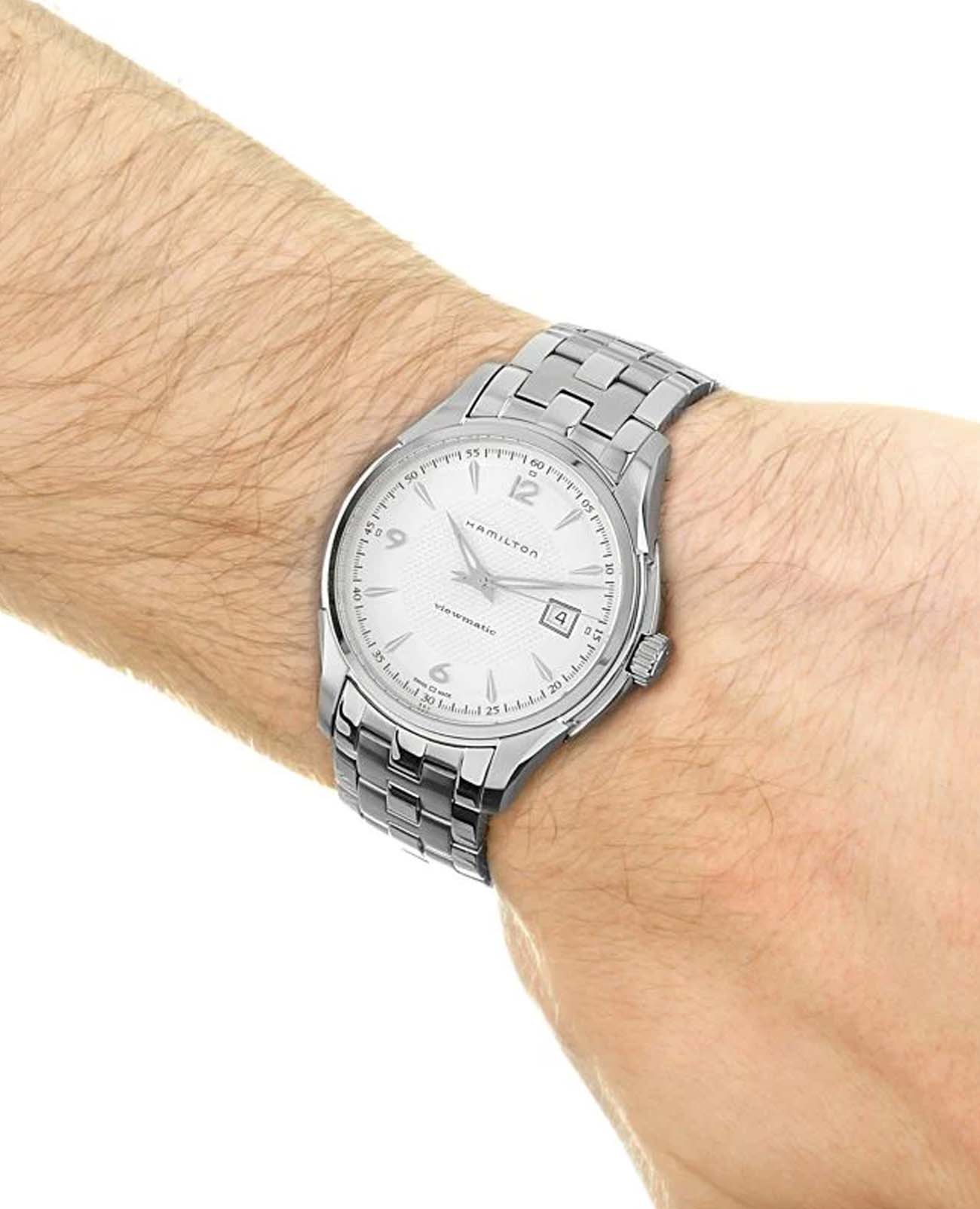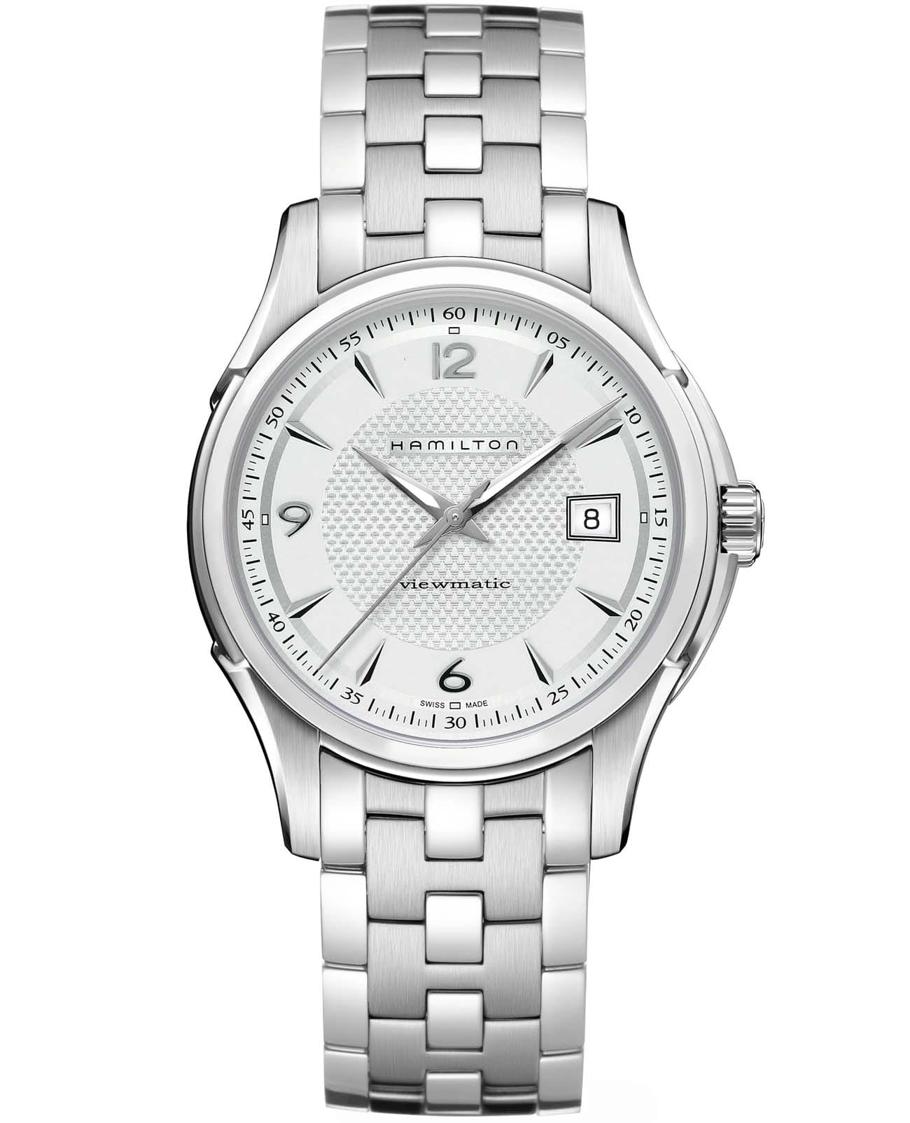 Мужские наручные часы Hamilton Jazzmaster Viewmatic Auto H32515155 с автоматическим механизмом. Корпус часов выполнен из нержавеющей стали. Стальной браслет на застёжке-бабочке с кнопкамиЗастёжка "бабочка"Такой вид застёжки дополняется предохранителями, помогающими избежать случайного раскрытия браслета. Обладают изящным исполнением. . Стрелки и метки с люминесцентным покрытиемЛюминесцентное покрытиеПозволяет считывать показания времени в темноте. Производители наносят на стрелки, часовые индексы, безель или поверхность циферблата светонакопительный состав, дающий холодное свечение.. Сапфировое стеклоСапфировое стеклоПрочный и надёжный материал из кристалла сапфира синтетического происхождения, характеризующийся особой твёрдостью и устойчивостью к царапинам и повреждениям. с антибликовым покрытием. Уровень влагозащиты: 50 метров, позволит защитить корпус от случайных брызг или капель дождя. Окошко даты находится в положении 3 часа.