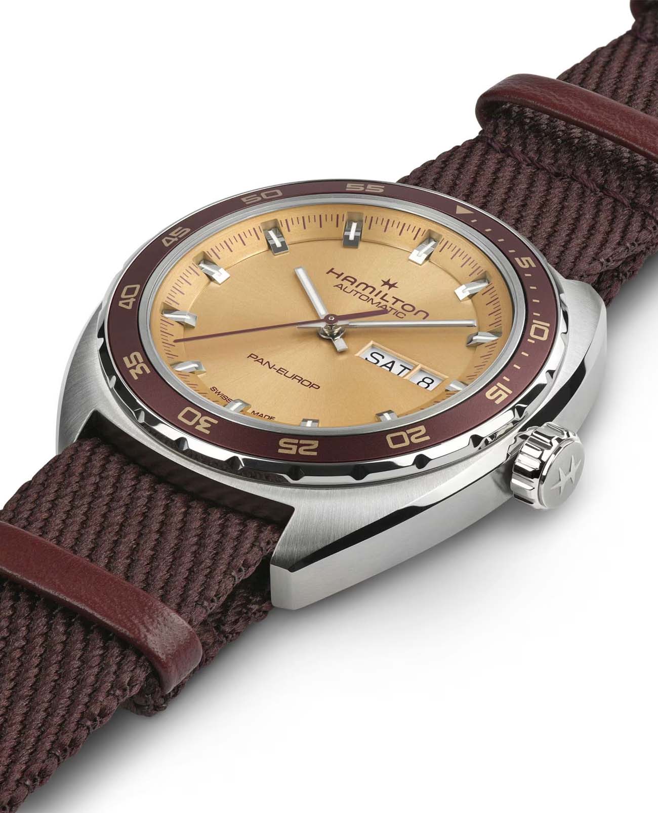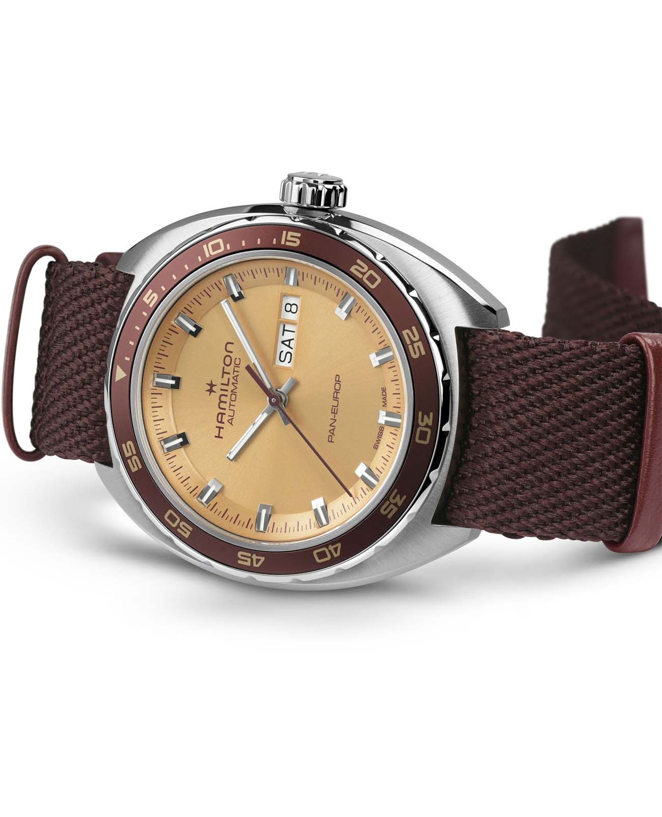 Мужские часы Hamilton American Classic Pan Europ Day Date Auto H35435820. Механизм с автоматическим подзаводом Сапфировое стеклоСапфировое стеклоПрочный и надёжный материал из кристалла сапфира синтетического происхождения, характеризующийся особой твёрдостью и устойчивостью к царапинам и повреждениям. устойчивое к появлению царапин, обладающее высокой прозрачностью. Класс водозащиты: 50 метров, позволит защитить корпус от случайных брызг или капель дождя. Корпус часов изготовлен из нержавеющей стали. Кожаный ремешок с раскладной застёжкойРаскладная застёжкаТакой тип застёжки используется только на браслетах из металла. Она никогда не раскрывается полностью, происходит разделение на 2 и более частей. Раскладывающая застёжка снизит вероятность потери часов к минимуму.. БезельБезельВнешний ободок, закрепляющий стекло. В спортивных часах так называется поворотное кольцо с делениями на циферблате, выполняет роль таймера – замеряет отрезки времени на шкале. Неподвижный безель – элемент декора. Однонаправленно вращающийся безель на дайверских часах позволяет фиксировать моменты погружения и выныривания на поверхность. с PVD-покрытиемPVDУльтратонкое покрытие наносится в технике вакуумного напыления, сочетает в себе нитрид титана особой прочности со слоем золота или оксида хрома. Несёт в себе декоративную или защитную функцию.. В комплект входит сменный тканевый ремешок. Стрелки и метки с люминесцентным покрытиемЛюминесцентное покрытиеПозволяет считывать показания времени в темноте. Производители наносят на стрелки, часовые индексы, безель или поверхность циферблата светонакопительный состав, дающий холодное свечение..