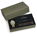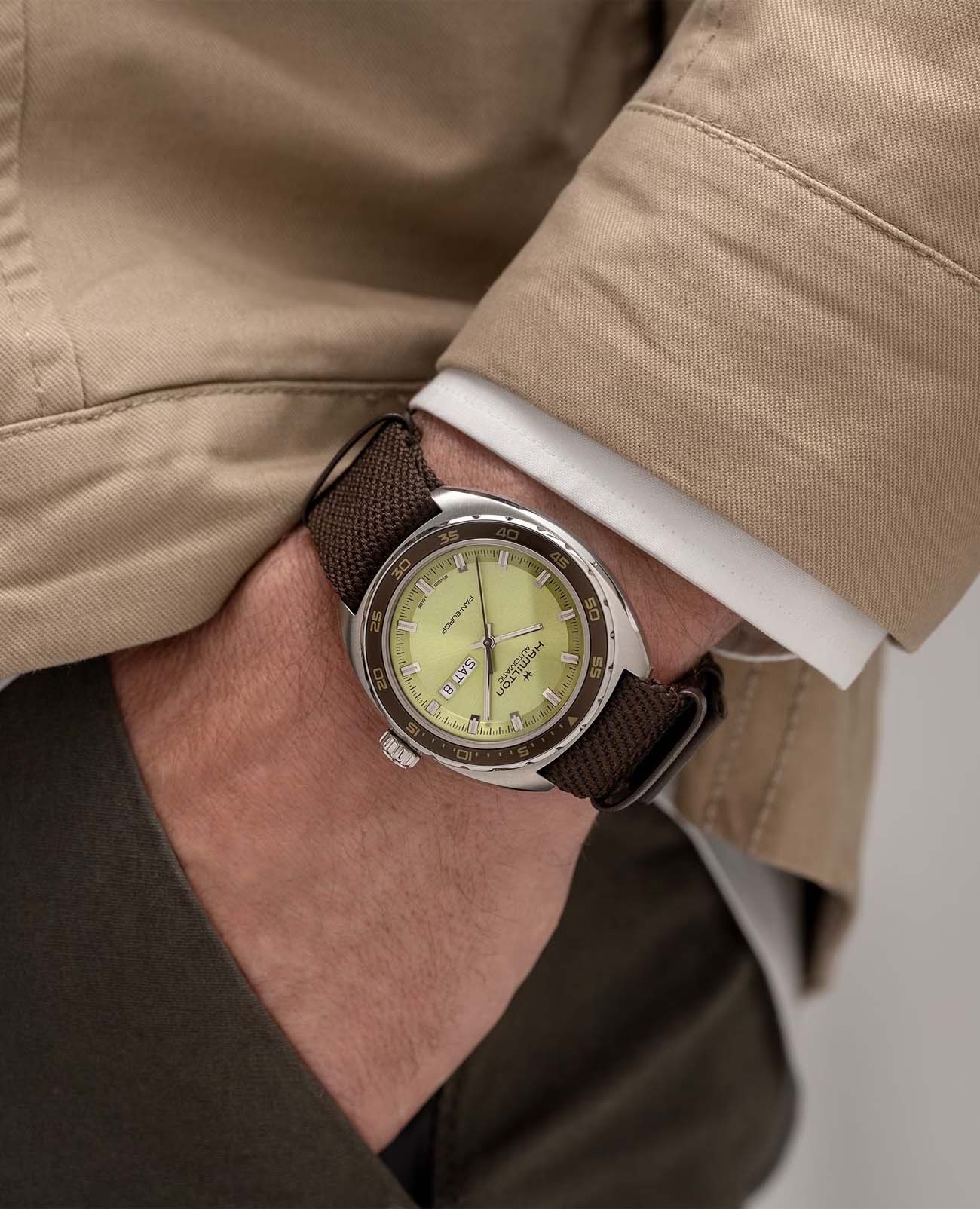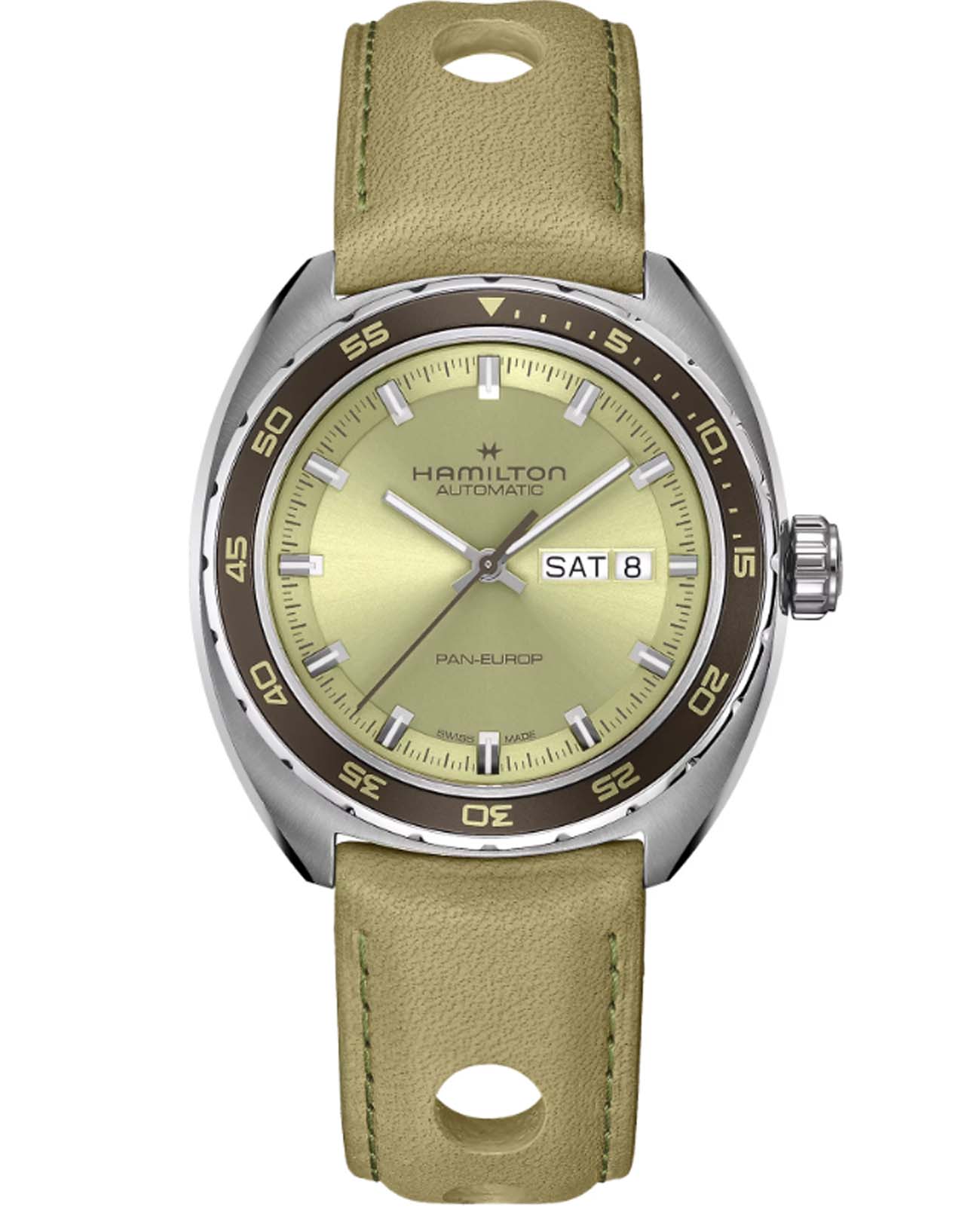 Мужские часы Hamilton American Classic Pan Europ Day Date Auto H35445860. Механизм с автоматическим подзаводом Сапфировое стеклоСапфировое стеклоПрочный и надёжный материал из кристалла сапфира синтетического происхождения, характеризующийся особой твёрдостью и устойчивостью к царапинам и повреждениям. устойчивое к появлению царапин, обладающее высокой прозрачностью. Класс водозащиты: 50 метров, позволит защитить корпус от случайных брызг или капель дождя. Корпус часов изготовлен из нержавеющей стали. Кожаный ремешок с раскладной застёжкойРаскладная застёжкаТакой тип застёжки используется только на браслетах из металла. Она никогда не раскрывается полностью, происходит разделение на 2 и более частей. Раскладывающая застёжка снизит вероятность потери часов к минимуму.. БезельБезельВнешний ободок, закрепляющий стекло. В спортивных часах так называется поворотное кольцо с делениями на циферблате, выполняет роль таймера – замеряет отрезки времени на шкале. Неподвижный безель – элемент декора. Однонаправленно вращающийся безель на дайверских часах позволяет фиксировать моменты погружения и выныривания на поверхность. с PVD-покрытиемPVDУльтратонкое покрытие наносится в технике вакуумного напыления, сочетает в себе нитрид титана особой прочности со слоем золота или оксида хрома. Несёт в себе декоративную или защитную функцию.. В комплект входит сменный тканевый ремешок. Стрелки и метки с люминесцентным покрытиемЛюминесцентное покрытиеПозволяет считывать показания времени в темноте. Производители наносят на стрелки, часовые индексы, безель или поверхность циферблата светонакопительный состав, дающий холодное свечение..