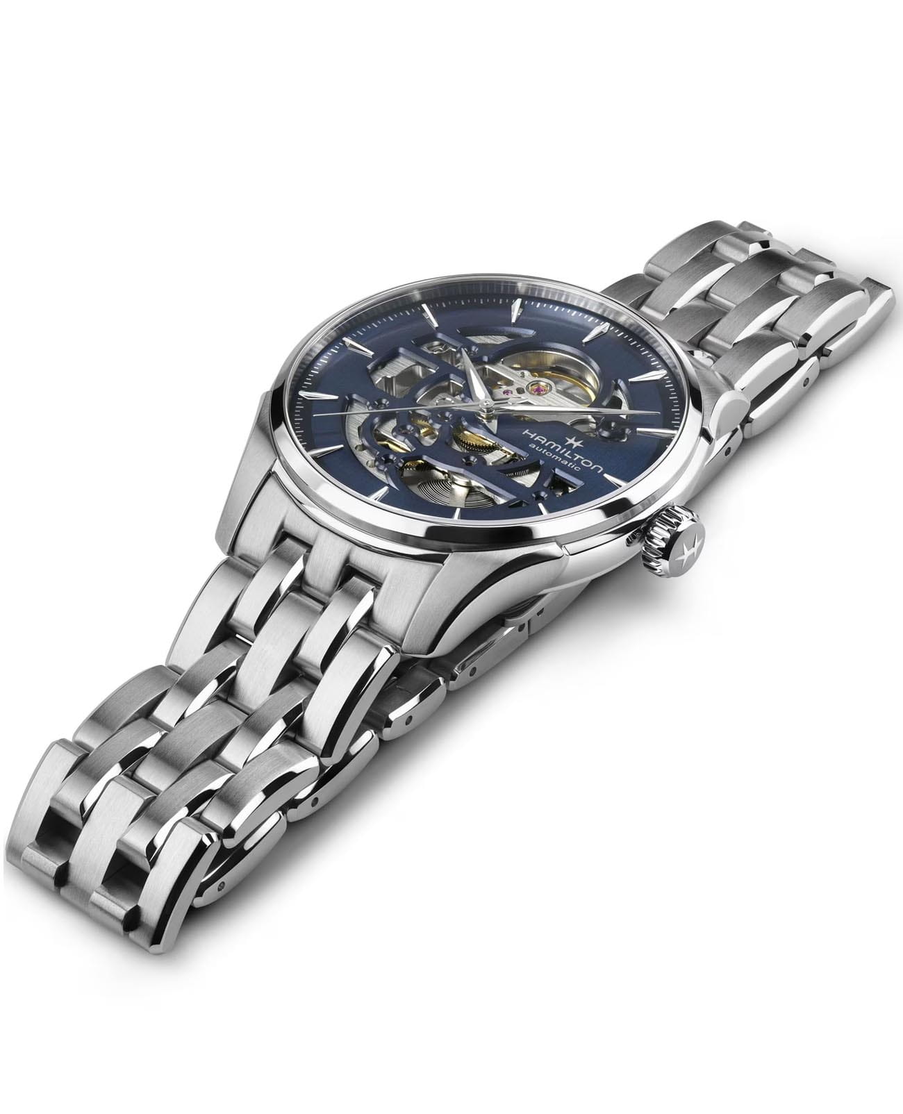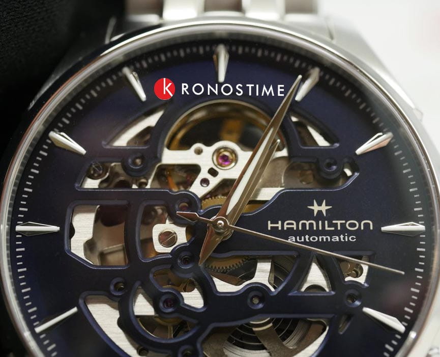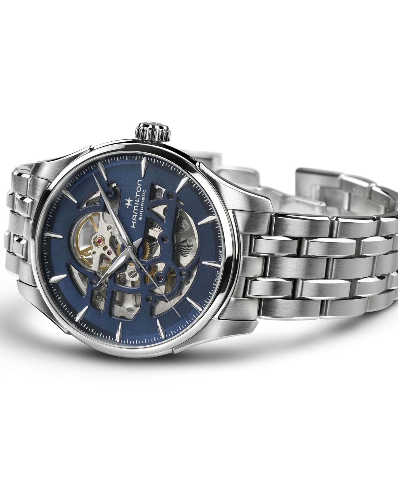 Мужские наручные часы-скелетоны Hamilton Jazzmaster Skeleton Auto H42535141 с надежным автоматическим механизмом. Корпус часов изготовлен из нержавеющей стали. Стальной браслет на раскладной застёжкеРаскладная застёжкаТакой тип застёжки используется только на браслетах из металла. Она никогда не раскрывается полностью, происходит разделение на 2 и более частей. Раскладывающая застёжка снизит вероятность потери часов к минимуму.. Сапфировое стеклоСапфировое стеклоПрочный и надёжный материал из кристалла сапфира синтетического происхождения, характеризующийся особой твёрдостью и устойчивостью к царапинам и повреждениям. с антибликовым покрытием. Стрелки и метки с люминесцентным покрытиемЛюминесцентное покрытиеПозволяет считывать показания времени в темноте. Производители наносят на стрелки, часовые индексы, безель или поверхность циферблата светонакопительный состав, дающий холодное свечение.. Уровень влагозащиты: 50 метров, позволит защитить корпус от случайных брызг или капель дождя.