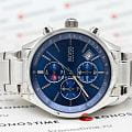 Мужские часы Hugo Boss Grand Prix HB1513478 представлены в 44-мм корпусе из нержавеющей стали с серебристым покрытием. Модель оснащена кварцевым механизмом с функцией хронографаХронографФункция позволяет измерять отрезки времени с особой точностью: часы, минуты, секунды. Верным признаком хронографа является наличие на циферблате 3 дополнительных окошек-счётчиков., тахиметраТахиметрРазмеченная шкала, располагается на ободке или безеле часов. Тахиметр позволяет рассчитать скорость на определённом участке пути, расстояние измеряется в километрах или милях. и секундомераСекундомерСекундоме́р — прибор, способный измерять интервалы времени с точностью до долей секунды., а также окошком даты на позиции 3 часа. Синий циферблат со штриховыми метками защищен устойчивым к царапинам минеральным стекломМинеральное стеклоМинеральное стекло представляет собой искусственно выращенный минерал кварца. Такое стекло отличается особой устойчивостью к повреждениям и царапинам. Уступает по некоторым качествам сапфировому стеклу.. Стальной браслет из нержавеющей стали дополнен раскладной застёжкойРаскладная застёжкаТакой тип застёжки используется только на браслетах из металла. Она никогда не раскрывается полностью, происходит разделение на 2 и более частей. Раскладывающая застёжка снизит вероятность потери часов к минимуму.. Водонепроницаемость WR30 (3 ATM) обеспечивает защиту от брызг воды и дождя.