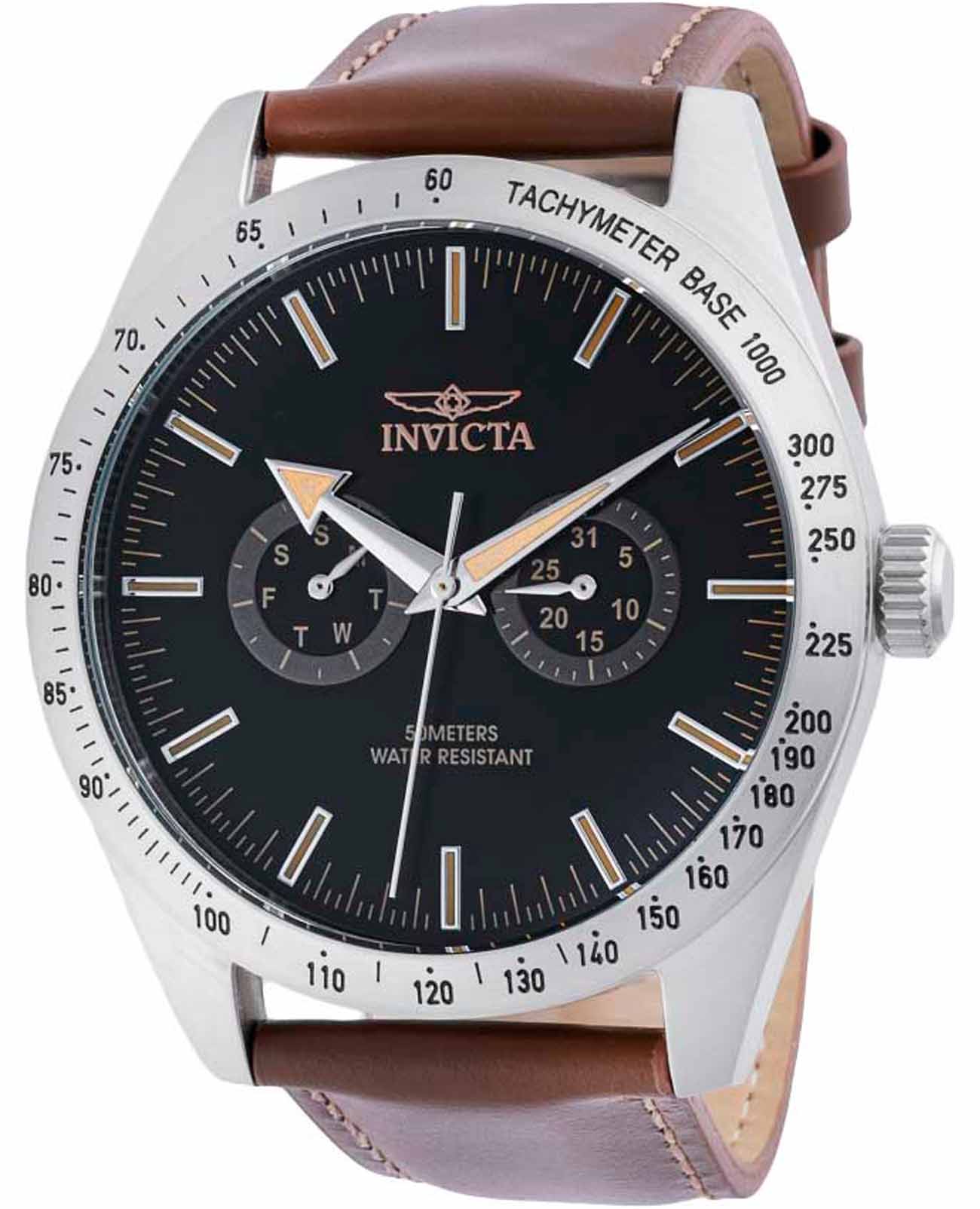 Мужские наручные часы Invicta Specialty IN45973 из коллекции Specialty сочетают в себе спортивный дизайн и надежность современных технологий. Модель обладает круглым корпусом диаметром 44 мм, выполненным из нержавеющей стали, что обеспечивает высокую устойчивость к внешним воздействиям. БезельБезельВнешний ободок, закрепляющий стекло. В спортивных часах так называется поворотное кольцо с делениями на циферблате, выполняет роль таймера – замеряет отрезки времени на шкале. Неподвижный безель – элемент декора. Однонаправленно вращающийся безель на дайверских часах позволяет фиксировать моменты погружения и выныривания на поверхность. украшен тахиметрической шкалой, придающей часам дополнительную элегантность. Кожаный ремешок на стандартной застежке, гарантирует комфортное ношение и безопасность. Черный циферблат дополнен метками в виде штрихов и светящимися стрелками с люминесцентным покрытиемЛюминесцентное покрытиеПозволяет считывать показания времени в темноте. Производители наносят на стрелки, часовые индексы, безель или поверхность циферблата светонакопительный состав, дающий холодное свечение. Tritnite, которые обеспечивают отличную видимость даже в темноте . На циферблате также вынесены отдельные окна для даты, дня недели и индикация 12-ти и 24-х часового формата времени . Для защиты используется минеральное стеклоМинеральное стеклоМинеральное стекло представляет собой искусственно выращенный минерал кварца. Такое стекло отличается особой устойчивостью к повреждениям и царапинам. Уступает по некоторым качествам сапфировому стеклу. Flame Fusion, которое обеспечивает прочность и устойчивость к царапинам . Часы оснащены кварцевым механизмом калибра Seiko TMI VH64, что гарантирует точность хода без необходимости подзаводки . Водонепроницаемость часов достигает 50 метров (5 атмосфер), что позволяет использовать их во время мытья рук или плавания, однако не рекомендуется для глубоководного дайвинга . Сочетание практичности, надежности и стильного дизайна делает эту модель универсальным аксессуаром как для повседневной носки, так и для занятий спортом .