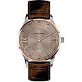 Классические наручные кварцевые мужские часы. Серый циферблат с позолоченными элементами дизайна. Корпус часов выполнен из высокопрочной стали с антикоррозийными свойствами с частичным IP покрытием. Минеральное стекло устойчиво к появлению царапин. Часы надежно удерживаются на руке ремешком из натуральной кожи, коричневого цвета. Водонепроницаемость 100М. Часы оснащены люминесцентной подсветкой стрелок и индексов.