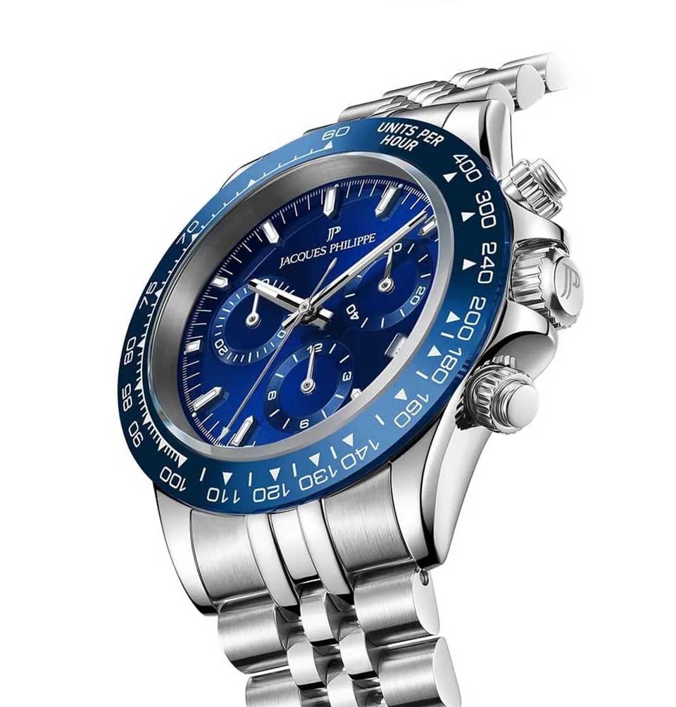 Швейцарские наручные часы Jacques Philippe JPQGC711336SBDB сочетают в себе современный дизайн, надежность и функциональность, это стильные швейцарские часы с функцией хронографаХронографФункция позволяет измерять отрезки времени с особой точностью: часы, минуты, секунды. Верным признаком хронографа является наличие на циферблате 3 дополнительных окошек-счётчиков. и секундомераСекундомерСекундоме́р — прибор, способный измерять интервалы времени с точностью до долей секунды.. Корпус круглой формы диаметром 39 мм выполнен из прочной нержавеющей стали, а безельБезельВнешний ободок, закрепляющий стекло. В спортивных часах так называется поворотное кольцо с делениями на циферблате, выполняет роль таймера – замеряет отрезки времени на шкале. Неподвижный безель – элемент декора. Однонаправленно вращающийся безель на дайверских часах позволяет фиксировать моменты погружения и выныривания на поверхность. с элегантным черным IP-покрытиемIP-покрытиеМетод ионного напыления. Демонстрирует повышенную устойчивость к истиранию, окислению и химическим веществам. Под воздействием высокого давления и температуры около 1500°C молекулы металла надёжно соединяются с частицами корпуса часов., а сапфировое стеклоСапфировое стеклоПрочный и надёжный материал из кристалла сапфира синтетического происхождения, характеризующийся особой твёрдостью и устойчивостью к царапинам и повреждениям. надежно защищает белый циферблат от царапин и повреждений. Модель оснащена точным кварцевым механизмом RONDA 5030.D-4H, а также дополнительными функциями — тахиметромТахиметрРазмеченная шкала, располагается на ободке или безеле часов. Тахиметр позволяет рассчитать скорость на определённом участке пути, расстояние измеряется в километрах или милях. и индикатором даты, что делает часы не только стильным аксессуаром, но и практичным помощником на каждый день. Серебристый браслет шириной 20 мм удобно фиксируется на запястье с помощью застежки «бабочка»Застёжка "бабочка"Такой вид застёжки дополняется предохранителями, помогающими избежать случайного раскрытия браслета. Обладают изящным исполнением. . Стрелки имеют люминесцентное покрытиеЛюминесцентное покрытиеПозволяет считывать показания времени в темноте. Производители наносят на стрелки, часовые индексы, безель или поверхность циферблата светонакопительный состав, дающий холодное свечение. для удобства чтения времени в темноте. Водозащита 5 АТМ позволяет не снимать часы при дожде и случайных контактах с водой.