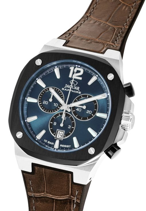 Мужские швейцарские часы Jaguar Rond Carre J1026/2 — это стильное сочетание элегантности и современного дизайна. Корпус из нержавеющей стали диаметром 43 мм идеально сбалансирован и элегантен. Сапфировое стеклоСапфировое стеклоПрочный и надёжный материал из кристалла сапфира синтетического происхождения, характеризующийся особой твёрдостью и устойчивостью к царапинам и повреждениям. с антибликовым покрытием защищает циферблат от царапин и обеспечивает отличную читаемость при любом освещении. Кожаный ремешок на застёжке-бабочке с кнопкамиЗастёжка "бабочка"Такой вид застёжки дополняется предохранителями, помогающими избежать случайного раскрытия браслета. Обладают изящным исполнением. идеально дополняют дизайн часов, обеспечивая комфортное ношение. Стрелки и метки на циферблате имеют люминесцентное покрытиеЛюминесцентное покрытиеПозволяет считывать показания времени в темноте. Производители наносят на стрелки, часовые индексы, безель или поверхность циферблата светонакопительный состав, дающий холодное свечение. позволяющее легко определять время даже в темноте. БезельБезельВнешний ободок, закрепляющий стекло. В спортивных часах так называется поворотное кольцо с делениями на циферблате, выполняет роль таймера – замеряет отрезки времени на шкале. Неподвижный безель – элемент декора. Однонаправленно вращающийся безель на дайверских часах позволяет фиксировать моменты погружения и выныривания на поверхность. с PVD-покрытиемPVDУльтратонкое покрытие наносится в технике вакуумного напыления, сочетает в себе нитрид титана особой прочности со слоем золота или оксида хрома. Несёт в себе декоративную или защитную функцию.. Часы обладают впечатляющей водонепроницаемостью до 10 бар (100 метров), что делает их идеальными для плавания, ныряния и погружений с аквалангом. В часах есть функция хронографаХронографФункция позволяет измерять отрезки времени с особой точностью: часы, минуты, секунды. Верным признаком хронографа является наличие на циферблате 3 дополнительных окошек-счётчиков., с помощью которой вы сможете измерять время с высокой точностью.