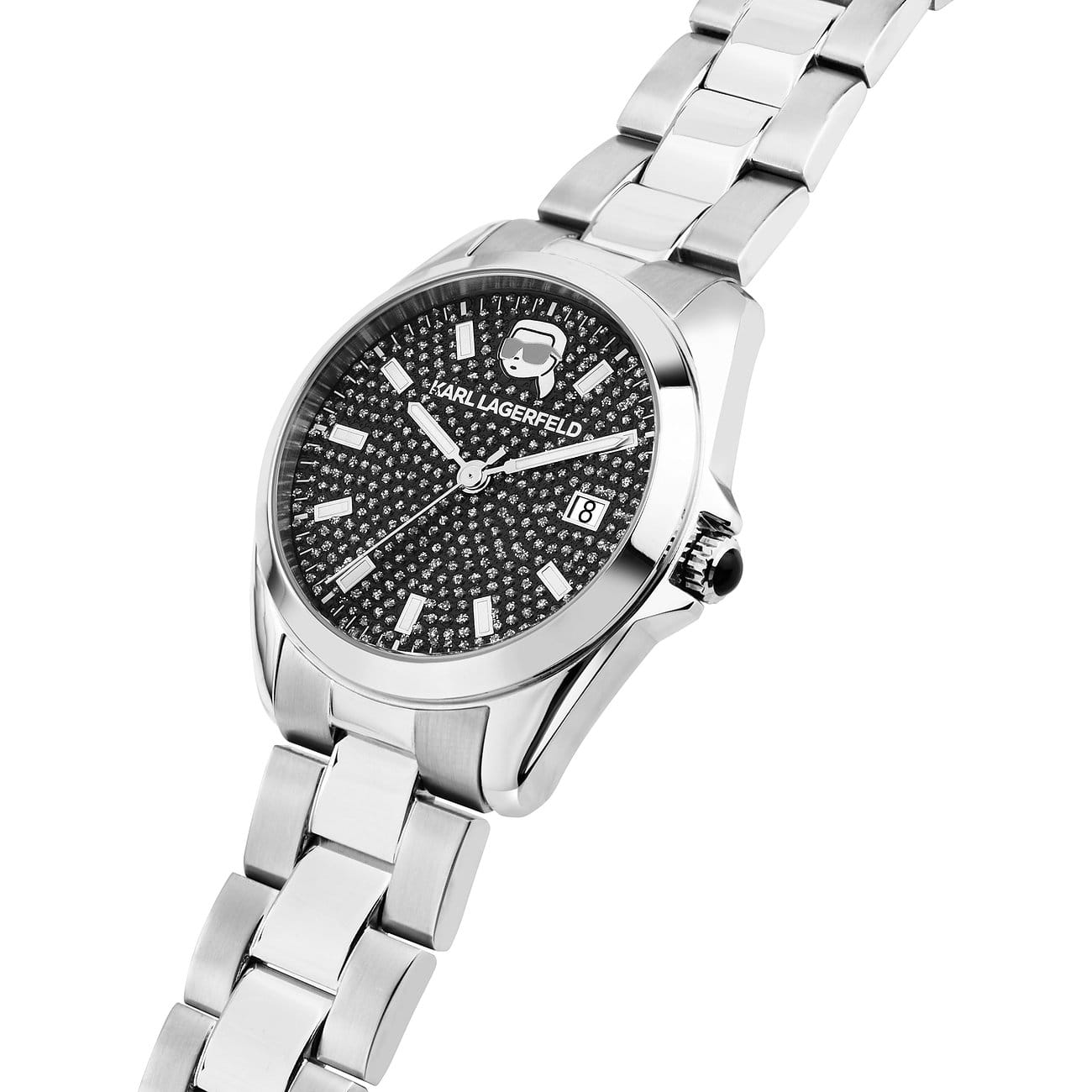 Женские элегантные часы Karl Lagerfeld Round Essentials R0553101515, кварцевый механизм с высокой точностью. Минеральное стеклоМинеральное стеклоМинеральное стекло представляет собой искусственно выращенный минерал кварца. Такое стекло отличается особой устойчивостью к повреждениям и царапинам. Уступает по некоторым качествам сапфировому стеклу. устойчивое к появлению царапин, обладающее высокой прозрачностью. Изысканный корпус изготовлен из нержавеющей стали. Лаконичные центральные часовая, минутная и секундная стрелки. Водонепроницаемость 5 АТМ позволяет использовать часы в повседневных условиях — при мытье рук или под лёгким дождём. Стальной браслет c раскладной застёжкойРаскладная застёжкаТакой тип застёжки используется только на браслетах из металла. Она никогда не раскрывается полностью, происходит разделение на 2 и более частей. Раскладывающая застёжка снизит вероятность потери часов к минимуму., обеспечивающей комфорт и уверенную фиксацию на запястье, а также добавляя завершающий штрих к этому стильному аксессуару. Стрелки и метки оснащены люминесцентным покрытиемЛюминесцентное покрытиеПозволяет считывать показания времени в темноте. Производители наносят на стрелки, часовые индексы, безель или поверхность циферблата светонакопительный состав, дающий холодное свечение., обеспечивающим хорошую читаемость в темноте. Циферблат с кристаллами подчёркивает изысканный характер часов, создавая универсальный образ, подходящий как для повседневных ситуаций, так и для особых случаев. Аккуратное окошко даты на отметке «3 часов».
