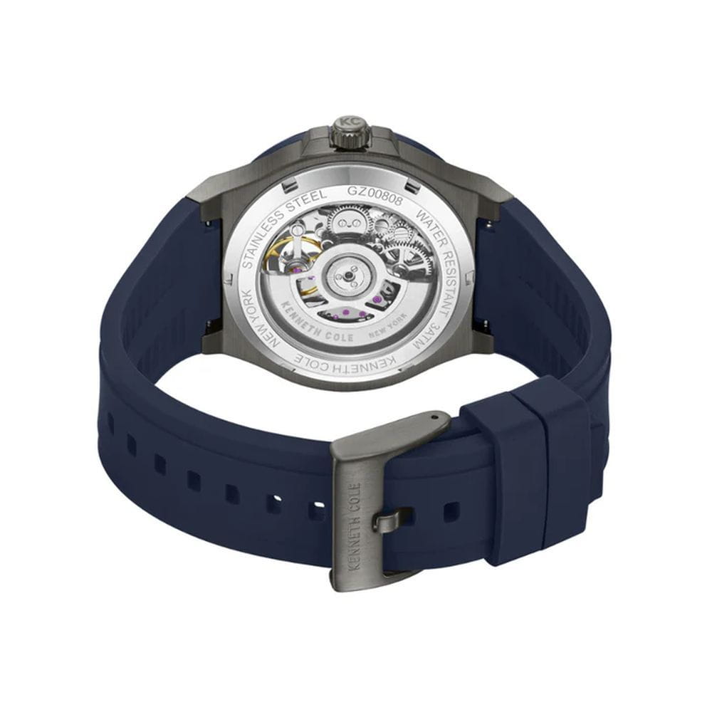 Kenneth Cole KCWGZ0080803 — мужская механическая модель с мощным дизайном и открытым скелетонизированным циферблатом. Круглый корпус из нержавеющей стали выполнен с тёмным PVDPVDУльтратонкое покрытие наносится в технике вакуумного напыления, сочетает в себе нитрид титана особой прочности со слоем золота или оксида хрома. Несёт в себе декоративную или защитную функцию.-покрытием и декорирован винтами на безелеБезельВнешний ободок, закрепляющий стекло. В спортивных часах так называется поворотное кольцо с делениями на циферблате, выполняет роль таймера – замеряет отрезки времени на шкале. Неподвижный безель – элемент декора. Однонаправленно вращающийся безель на дайверских часах позволяет фиксировать моменты погружения и выныривания на поверхность., что подчёркивает индустриальный характер часов. Циферблат открывает вид на работу механизма, создавая эффект глубины и технической изысканности. Метки и стрелки покрыты люминесцентным покрытиемЛюминесцентное покрытиеПозволяет считывать показания времени в темноте. Производители наносят на стрелки, часовые индексы, безель или поверхность циферблата светонакопительный состав, дающий холодное свечение., обеспечивающим читаемость даже в условиях слабого освещения. Защитную функцию выполняет минеральное стеклоМинеральное стеклоМинеральное стекло представляет собой искусственно выращенный минерал кварца. Такое стекло отличается особой устойчивостью к повреждениям и царапинам. Уступает по некоторым качествам сапфировому стеклу., стойкое к повседневным повреждениям. Часы комплектуются силиконовым ремешком с классической застёжкой, который обеспечивает комфорт и стильное сочетание с массивным корпусом. Модель объединяет выразительный скелетон-дизайн и современный характер, становясь эффектным акцентом в мужском образе.