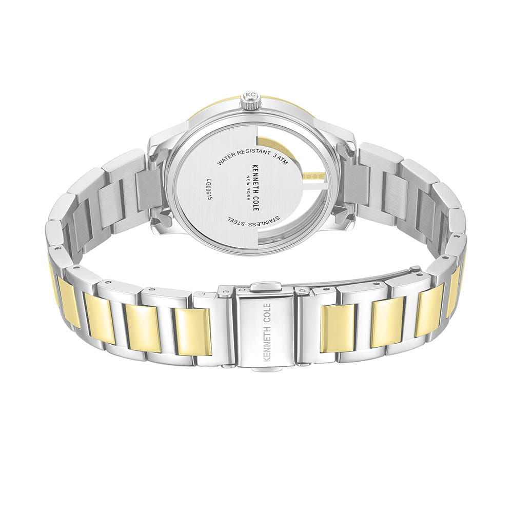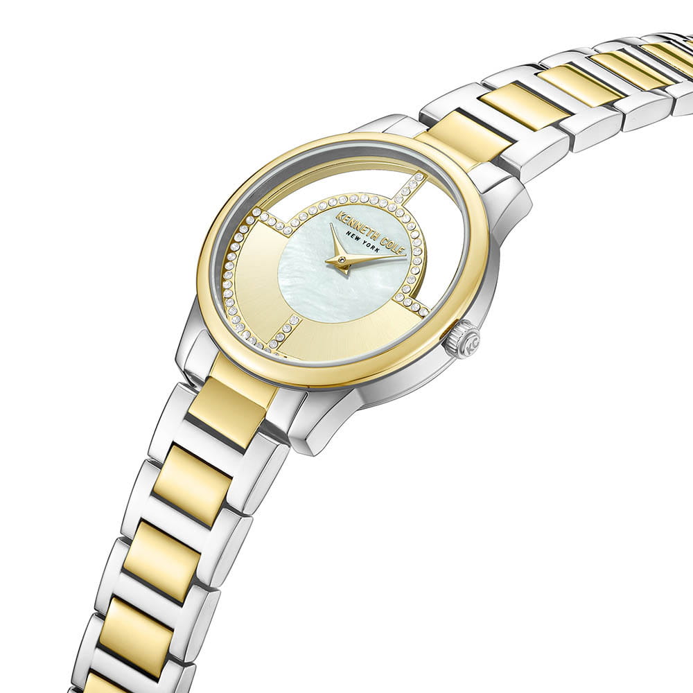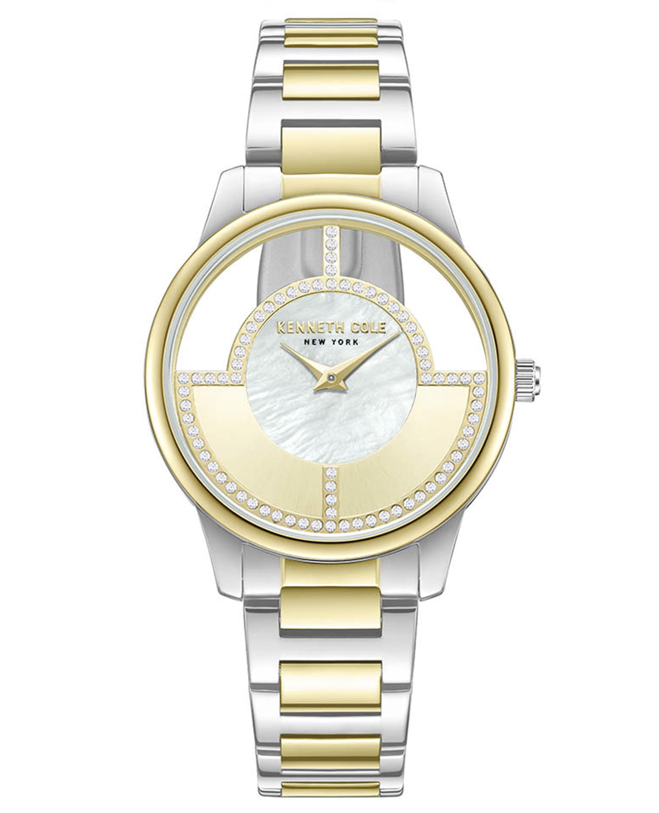 Женские кварцевые часы Kenneth Cole KCWLG0061502 — это изысканный аксессуар, сочетающий элегантность и современный дизайн. Корпус диаметром 34 мм выполнен из нержавеющей стали. Безель с IP-покрытиемIP-покрытиеМетод ионного напыления. Демонстрирует повышенную устойчивость к истиранию, окислению и химическим веществам. Под воздействием высокого давления и температуры около 1500°C молекулы металла надёжно соединяются с частицами корпуса часов. золотого цвета. Циферблат белого цвета украшен вставками из перламутра и стразов из стекла, придающими сияние и глубину. Индексы на циферблате отсутствуют, что подчёркивает минималистичный и чистый образ. Циферблат защищён минеральным стекломМинеральное стеклоМинеральное стекло представляет собой искусственно выращенный минерал кварца. Такое стекло отличается особой устойчивостью к повреждениям и царапинам. Уступает по некоторым качествам сапфировому стеклу.. Особенностью модели является прозрачный корпус, добавляющий оригинальность и визуальную лёгкость дизайну. Часы оснащены стальным браслетом с IP-покрытиемIP-покрытиеМетод ионного напыления. Демонстрирует повышенную устойчивость к истиранию, окислению и химическим веществам. Под воздействием высокого давления и температуры около 1500°C молекулы металла надёжно соединяются с частицами корпуса часов. на раскладной застёжкеРаскладная застёжкаТакой тип застёжки используется только на браслетах из металла. Она никогда не раскрывается полностью, происходит разделение на 2 и более частей. Раскладывающая застёжка снизит вероятность потери часов к минимуму.. Водонепроницаемость 30 м позволяет использовать часы в повседневных условиях, защищая от случайных брызг и капель дождя. Утончённый стиль и необычные детали делают эти часы идеальным выбором для тех, кто ценит индивидуальность.