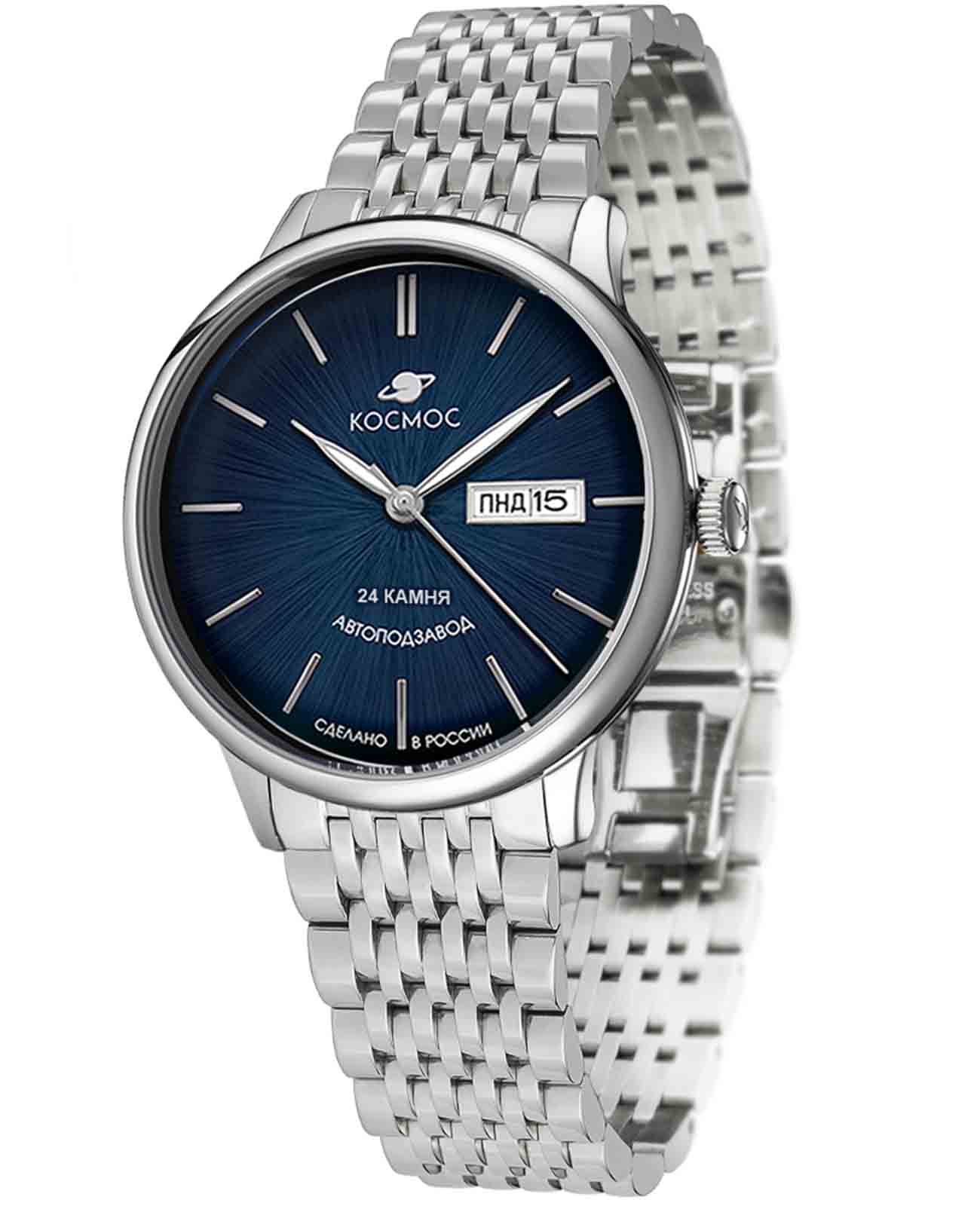 Российские мужские механические часы Космос из коллекции Юпитер оснащены механизмом TMI с автоподзаводом. Круглый корпус из нержавеющей стали диаметром 41 мм защищен минеральным стекломМинеральное стеклоМинеральное стекло представляет собой искусственно выращенный минерал кварца. Такое стекло отличается особой устойчивостью к повреждениям и царапинам. Уступает по некоторым качествам сапфировому стеклу.. Циферблат дополнен функциями отображения даты и дня недели. Часы имеют водонепроницаемость 50 метров, позволит защитить корпус от случайных брызг или капель дождя. Модель комплектуется стальным браслетом на застёжке-бабочке с кнопкамиЗастёжка "бабочка"Такой вид застёжки дополняется предохранителями, помогающими избежать случайного раскрытия браслета. Обладают изящным исполнением. . Прочный корпус и надежный механизм делают эти часы универсальным аксессуаром для повседневного использования. Уникальный дизайн и высокое качество материалов подчеркивают индивидуальность владельца.