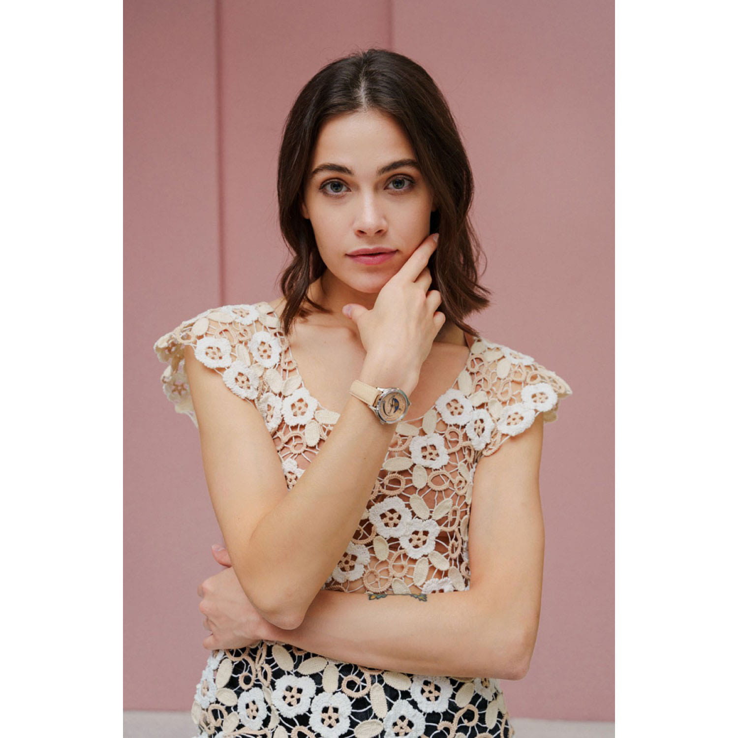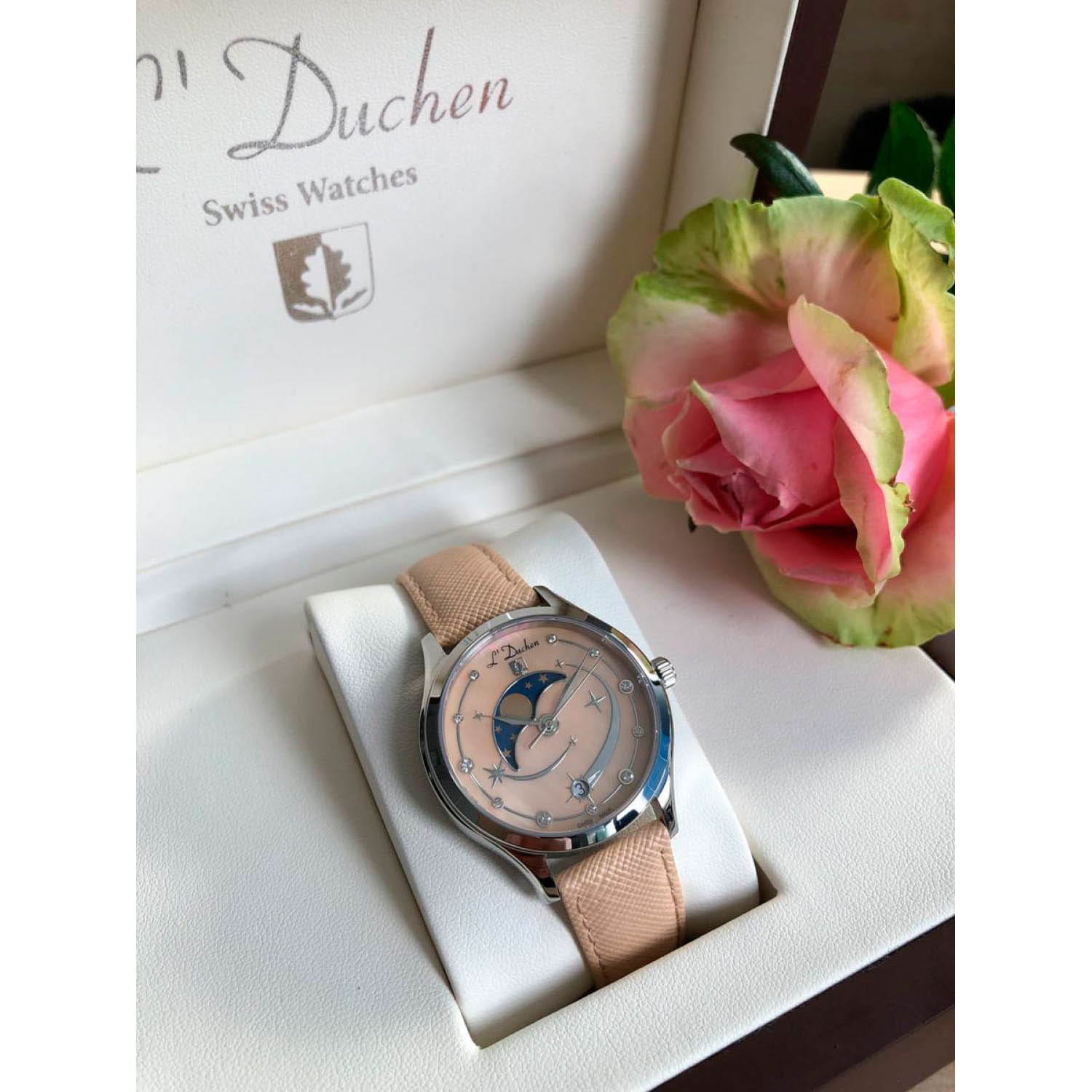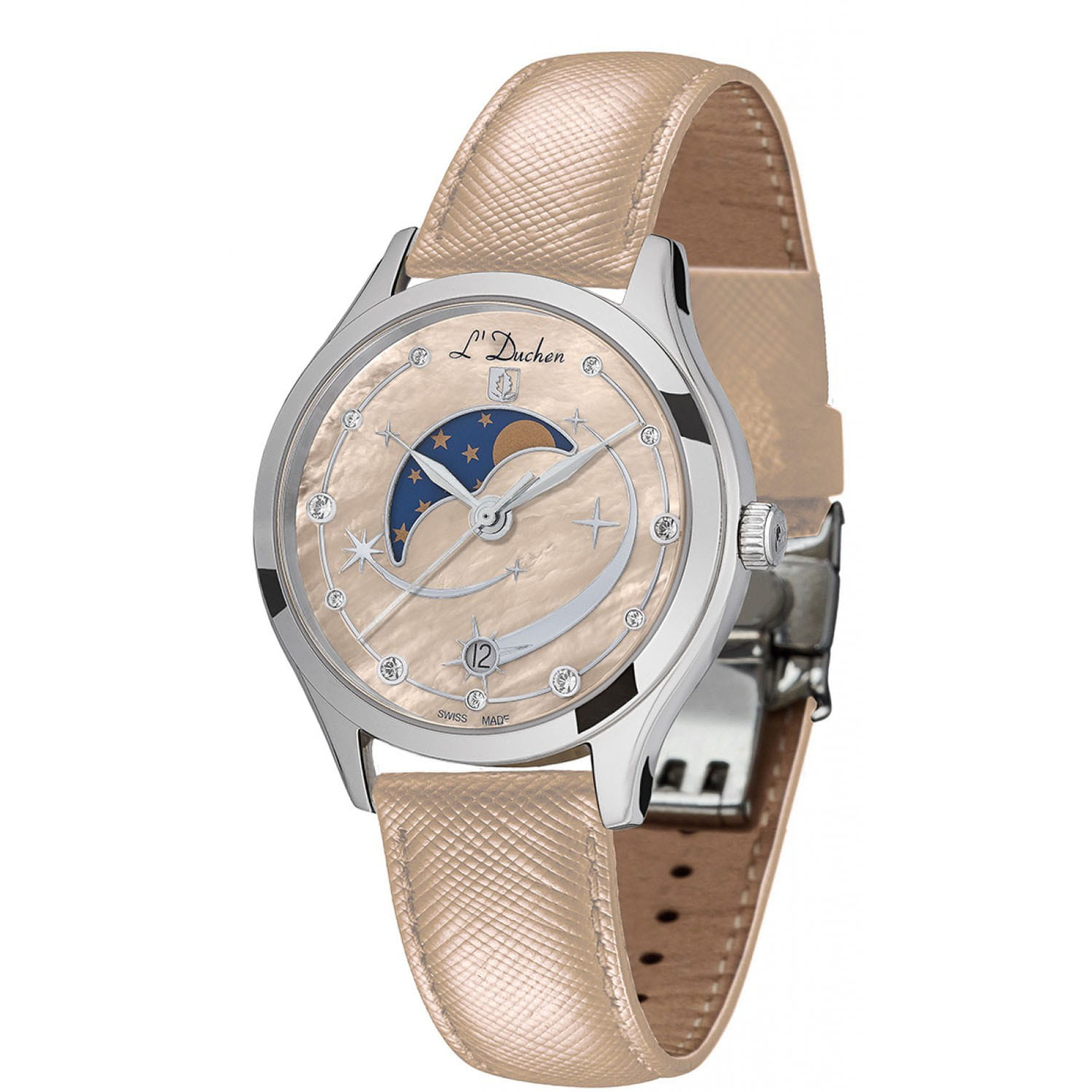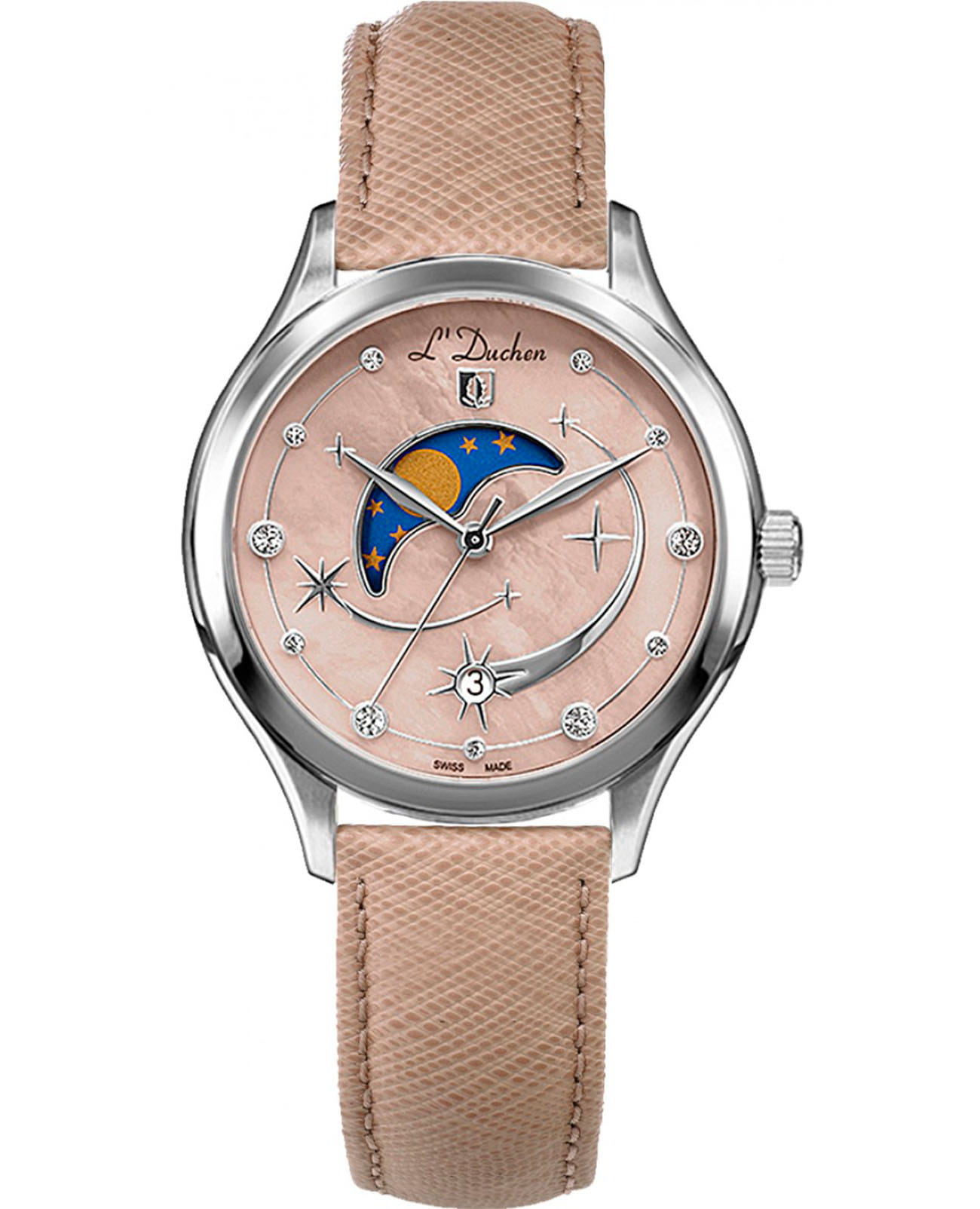 Женские кварцевые часы L'Duchen из коллекции Perseides — это волшебный аксессуар, вдохновлённый космическим зрелищем метеорного потока. Корпус диаметром 34 мм выполнен из нержавеющей стали 316L с эффектным чередованием полированных и матовых поверхностей. Циферблат нежного бежевого цвета изготовлен из натурального перламутра, природная текстура которого создаёт уникальный фон. Центральная композиция украшена накладными элементами и фианитами разного размера, символизирующими падающие звёзды метеорного потока Персеиды. Окошко даты в верхней части циферблата оформлено в виде звезды, а указатель фазы луны элегантно выделен металлической рамкой. Циферблат защищён сапфировым стекломСапфировое стеклоПрочный и надёжный материал из кристалла сапфира синтетического происхождения, характеризующийся особой твёрдостью и устойчивостью к царапинам и повреждениям.. Часы оснащены ремешком из натуральной кожи бежевого цвета и застёжкой «бабочка» с кнопкамиЗастёжка "бабочка"Такой вид застёжки дополняется предохранителями, помогающими избежать случайного раскрытия браслета. Обладают изящным исполнением. , украшенной логотипом бренда — дубовым листом, символом мудрости и долговечности. Заводная головка и задняя крышка также декорированы фирменным тиснением. Водонепроницаемость 50 м позволяет использовать часы в повседневных условиях.