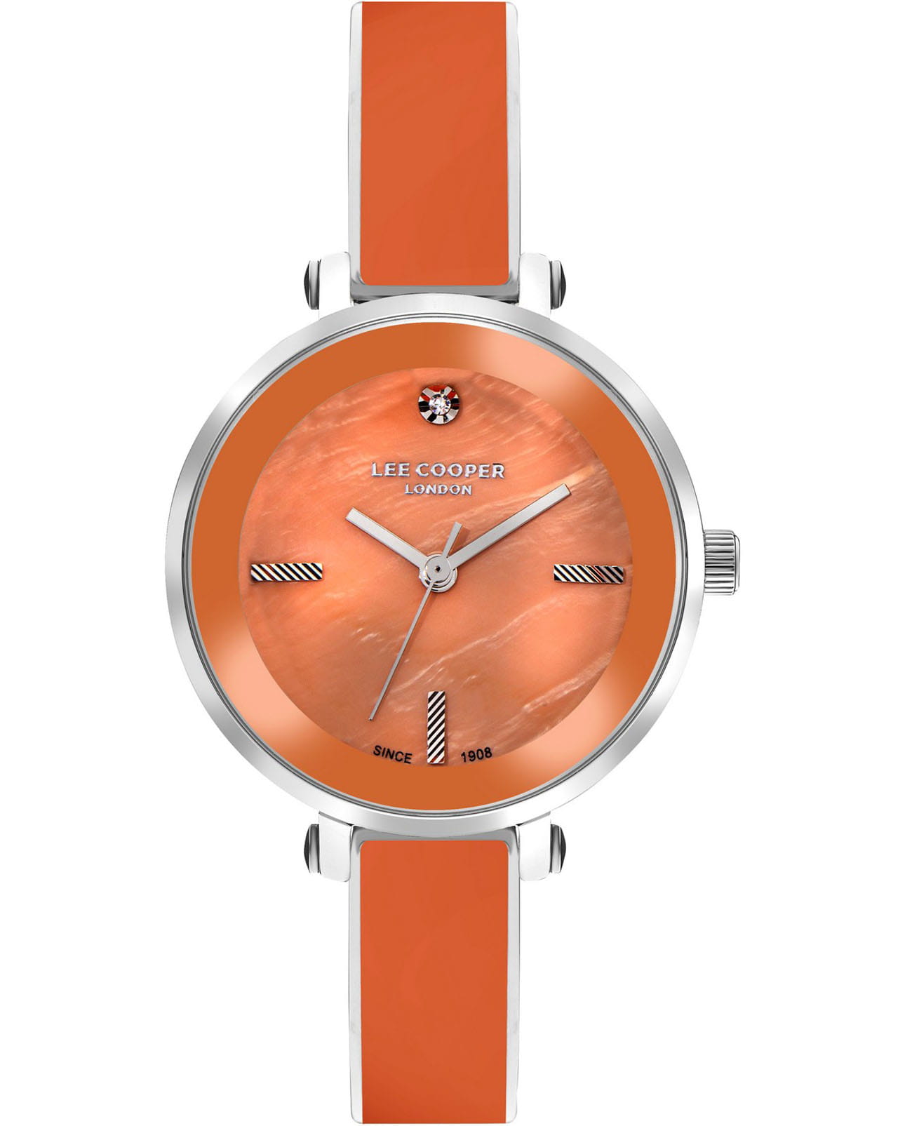 Женские часы Lee Cooper LC07813.380 выполнены в классическом стиле и сочетают строгий дизайн с надёжным механизмом. Модель оснащена кварцевым механизмом, обеспечивающим точность хода и минимальное обслуживание. Корпус круглой формы имеет размер 32 мм, изготовлен из суперметалла, гарантирует комфорт при ношении. Циферблат оранжевого цвета дополнен индексами для чёткого отсчёта времени. Защиту циферблата обеспечивает минеральное стеклоМинеральное стеклоМинеральное стекло представляет собой искусственно выращенный минерал кварца. Такое стекло отличается особой устойчивостью к повреждениям и царапинам. Уступает по некоторым качествам сапфировому стеклу., устойчивое к мелким механическим повреждениям. Изысканный стальной браслет с керамическими вставками на раскладной застёжкеРаскладная застёжкаТакой тип застёжки используется только на браслетах из металла. Она никогда не раскрывается полностью, происходит разделение на 2 и более частей. Раскладывающая застёжка снизит вероятность потери часов к минимуму. гарантирует комфортную посадку на запястье. Водозащита 3 АТМ позволяет использовать часы в повседневных условиях без риска повреждения от случайных брызг воды. В комплекте к часам идет дополнительный браслет в цвет часов. Это сочетание классического дизайна, прочности материалов и качества исполнения для уверенных в себе женщин.