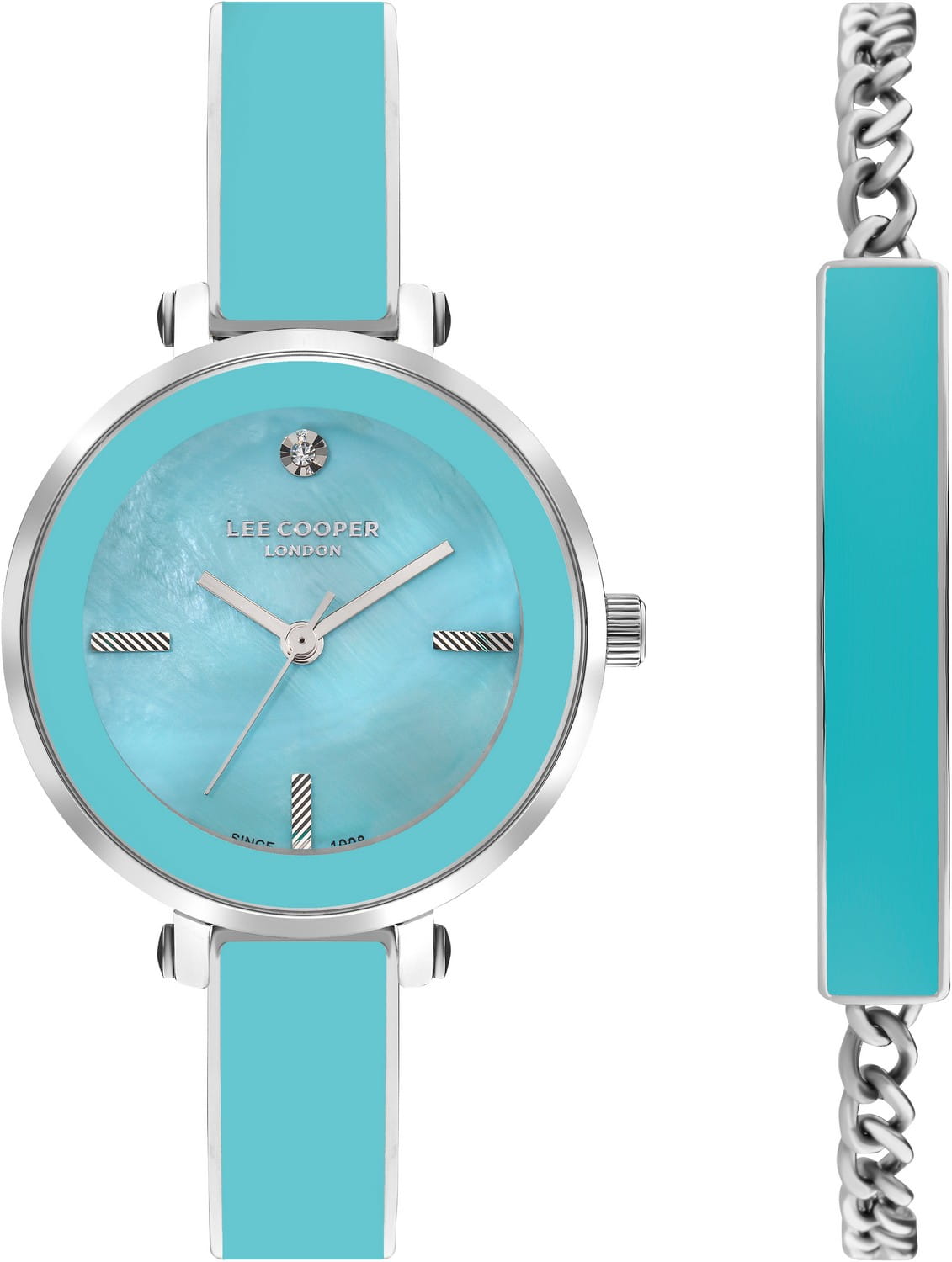 Женские часы Lee Cooper LC07813.390 выполнены в классическом стиле и сочетают строгий дизайн с надёжным механизмом. Модель оснащена кварцевым механизмом, обеспечивающим точность хода и минимальное обслуживание. Корпус круглой формы имеет размер 32 мм, изготовлен из суперметалла, гарантирует комфорт при ношении. Циферблат голубого цвета дополнен индексами для чёткого отсчёта времени. Защиту циферблата обеспечивает минеральное стеклоМинеральное стеклоМинеральное стекло представляет собой искусственно выращенный минерал кварца. Такое стекло отличается особой устойчивостью к повреждениям и царапинам. Уступает по некоторым качествам сапфировому стеклу., устойчивое к мелким механическим повреждениям. Изысканный стальной браслет с керамическими вставками на раскладной застёжкеРаскладная застёжкаТакой тип застёжки используется только на браслетах из металла. Она никогда не раскрывается полностью, происходит разделение на 2 и более частей. Раскладывающая застёжка снизит вероятность потери часов к минимуму. гарантирует комфортную посадку на запястье. Водозащита 3 АТМ позволяет использовать часы в повседневных условиях без риска повреждения от случайных брызг воды. В комплекте к часам идет дополнительный браслет в цвет часов. Это сочетание классического дизайна, прочности материалов и качества исполнения для уверенных в себе женщин.