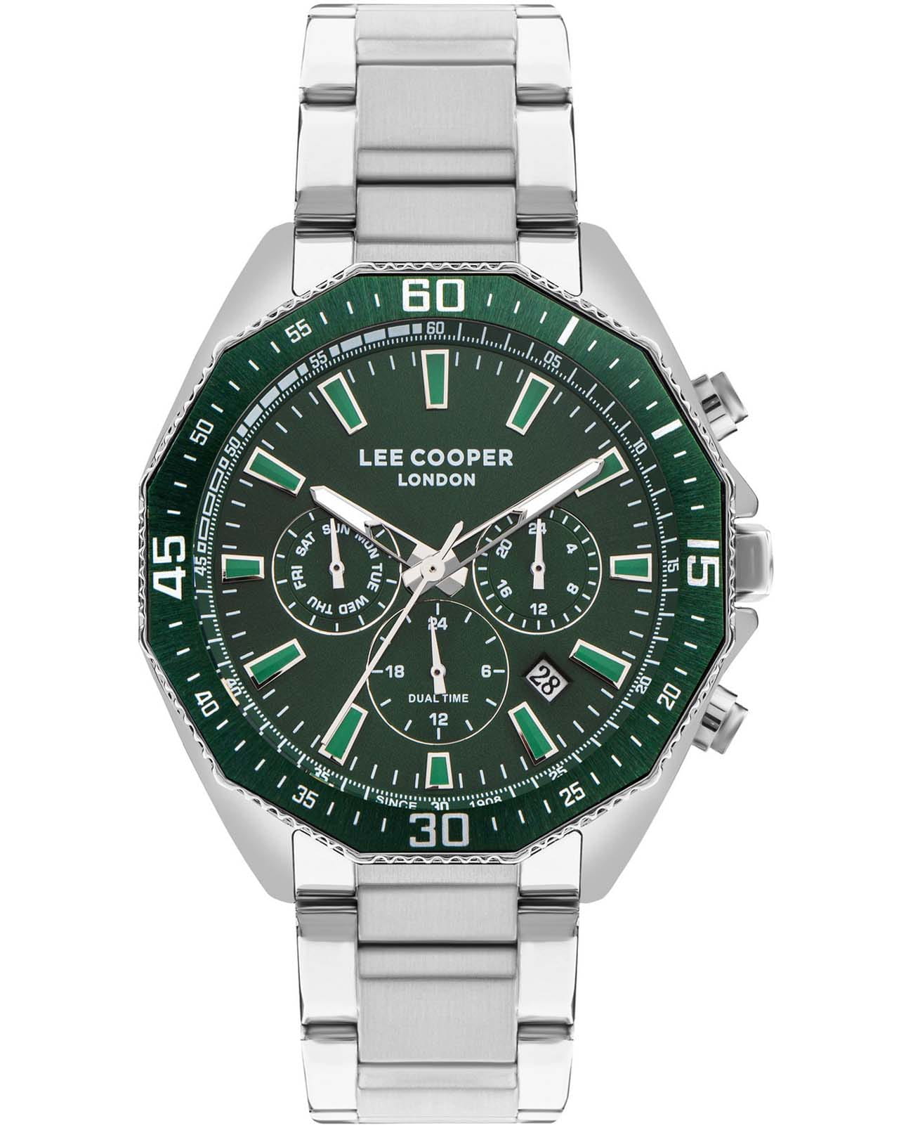 Мужские часы Lee Cooper LC07847.370 выполнены в классическом стиле и сочетают строгий дизайн с надёжным механизмом. Модель оснащена кварцевым механизмом, обеспечивающим точность хода и минимальное обслуживание. Корпус имеет размер 45 мм, изготовлен из суперметалла с поворотным безелемБезельВнешний ободок, закрепляющий стекло. В спортивных часах так называется поворотное кольцо с делениями на циферблате, выполняет роль таймера – замеряет отрезки времени на шкале. Неподвижный безель – элемент декора. Однонаправленно вращающийся безель на дайверских часах позволяет фиксировать моменты погружения и выныривания на поверхность. с IP-покрытиемIP-покрытиеМетод ионного напыления. Демонстрирует повышенную устойчивость к истиранию, окислению и химическим веществам. Под воздействием высокого давления и температуры около 1500°C молекулы металла надёжно соединяются с частицами корпуса часов.. Циферблат зеленого цвета дополнен индексами для чёткого отсчёта времени, а также функциями отображения даты, дня недели, 24-часового индикатора и второго часового поясаВторой часовой поясФункция, позволяющая отображать время двух часовых поясов одновременно.. Защиту циферблата обеспечивает минеральное стеклоМинеральное стеклоМинеральное стекло представляет собой искусственно выращенный минерал кварца. Такое стекло отличается особой устойчивостью к повреждениям и царапинам. Уступает по некоторым качествам сапфировому стеклу., устойчивое к мелким механическим повреждениям. Циферблат украшен стрелками и метками с люминесцентным покрытиемЛюминесцентное покрытиеПозволяет считывать показания времени в темноте. Производители наносят на стрелки, часовые индексы, безель или поверхность циферблата светонакопительный состав, дающий холодное свечение., гармонично дополняющим общий дизайн модели. Браслет из стали оснащен раскладной застёжкойРаскладная застёжкаТакой тип застёжки используется только на браслетах из металла. Она никогда не раскрывается полностью, происходит разделение на 2 и более частей. Раскладывающая застёжка снизит вероятность потери часов к минимуму., обеспечивающим комфортное и безопасное ношение. Водозащита 5 АТМ позволяет использовать часы в повседневных условиях без риска повреждения от случайных брызг воды. Это сочетание классического дизайна, прочности материалов и качества исполнения для уверенных в себе мужчин.