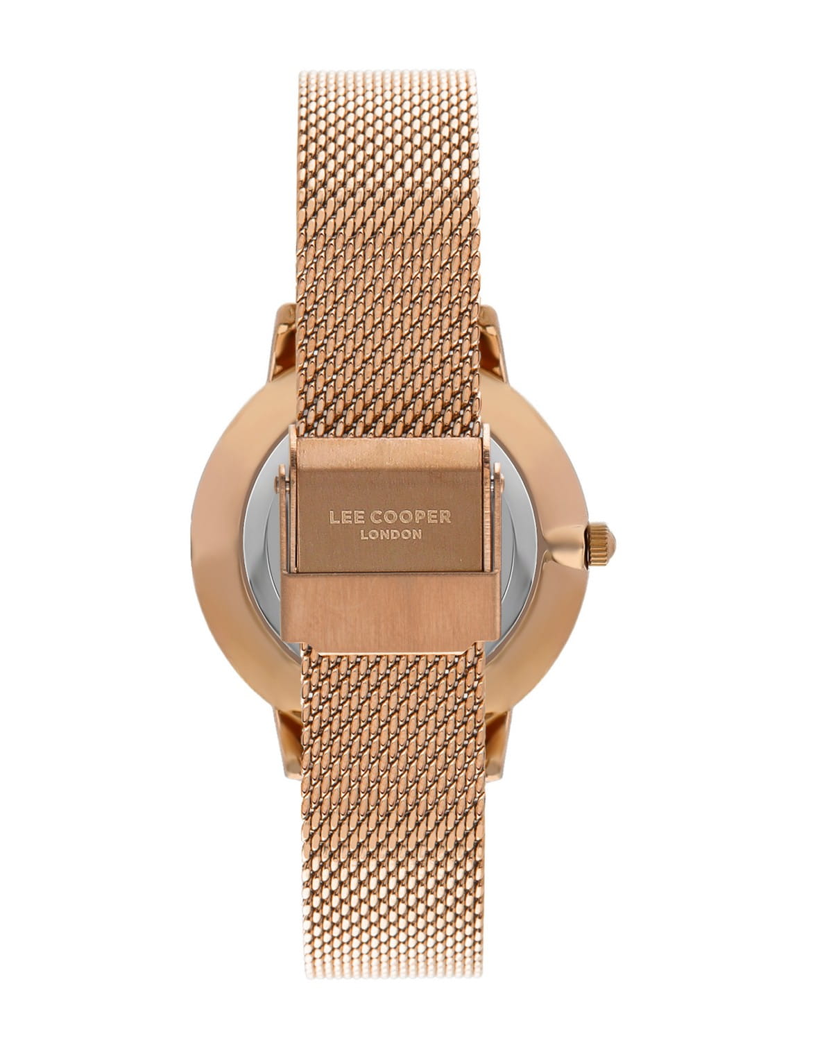Женские часы Lee Cooper LC07875.410 — это стильное сочетание элегантности и современного дизайна. Изящный корпус выполнен из суперметалла с IP-покрытиемIP-покрытиеМетод ионного напыления. Демонстрирует повышенную устойчивость к истиранию, окислению и химическим веществам. Под воздействием высокого давления и температуры около 1500°C молекулы металла надёжно соединяются с частицами корпуса часов. золотого цвета. Изысканный циферблат инкрустирован цирконами, что придает модели особый блеск и защищен минеральным стекломМинеральное стеклоМинеральное стекло представляет собой искусственно выращенный минерал кварца. Такое стекло отличается особой устойчивостью к повреждениям и царапинам. Уступает по некоторым качествам сапфировому стеклу., обеспечивающим устойчивость к царапинам. Центральные часовая, минутная стрелки. Часы оснащены надежным кварцевым механизмом. Стальной браслет с IP-покрытиемIP-покрытиеМетод ионного напыления. Демонстрирует повышенную устойчивость к истиранию, окислению и химическим веществам. Под воздействием высокого давления и температуры около 1500°C молекулы металла надёжно соединяются с частицами корпуса часов. с застежкой, выполненной в виде раскладного замкаРаскладной замокДанный вариант застежки используется только на часах с металлическим браслетом. Отличительная особенность такого крепления в том, что длина браслета становится универсальной и вы можете самостоятельно отрегулировать нужный вам размер – застежка просто двигается по браслету часов., гарантирующего комфортное и безопасное ношение. Водозащита 30 метров защищает модель от случайных брызг и дождя. Lee Cooper  — отличный выбор для тех, кто ценит утонченность и качество.