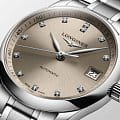 Швейцарские механические часы Longines Master Collection L2.357.4.07.6. Сапфировое стеклоСапфировое стеклоПрочный и надёжный материал из кристалла сапфира синтетического происхождения, характеризующийся особой твёрдостью и устойчивостью к царапинам и повреждениям. устойчивое к появлению царапин, обладающее высокой прозрачностью. Корпус часов изготовлен из нержавеющей стали. Циферблат с 13 бриллиантами группы Top Wesselton VS-SI общим весом 0.059 карата. Окошко даты в положении 3 часа. Автоматический механизм с частотой баланса 25 200 полуколебаний в час и запасом хода, которого хватает примерно на 72 часа работы. Класс водозащиты: 30 метров, позволит защитить корпус от случайных брызг или капель дождя. Стальной браслет  на застёжке «бабочка» с кнопкамиЗастёжка "бабочка"Такой вид застёжки дополняется предохранителями, помогающими избежать случайного раскрытия браслета. Обладают изящным исполнением. .