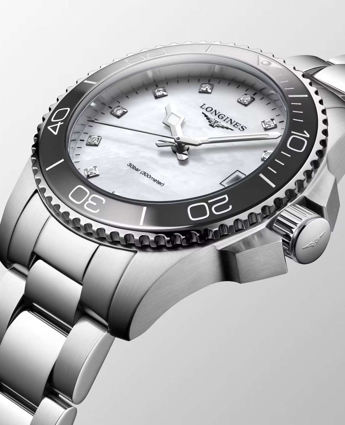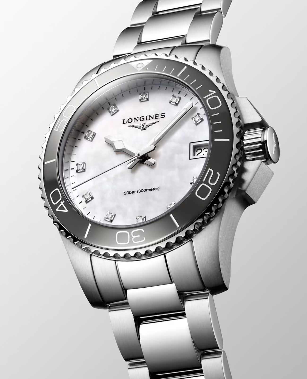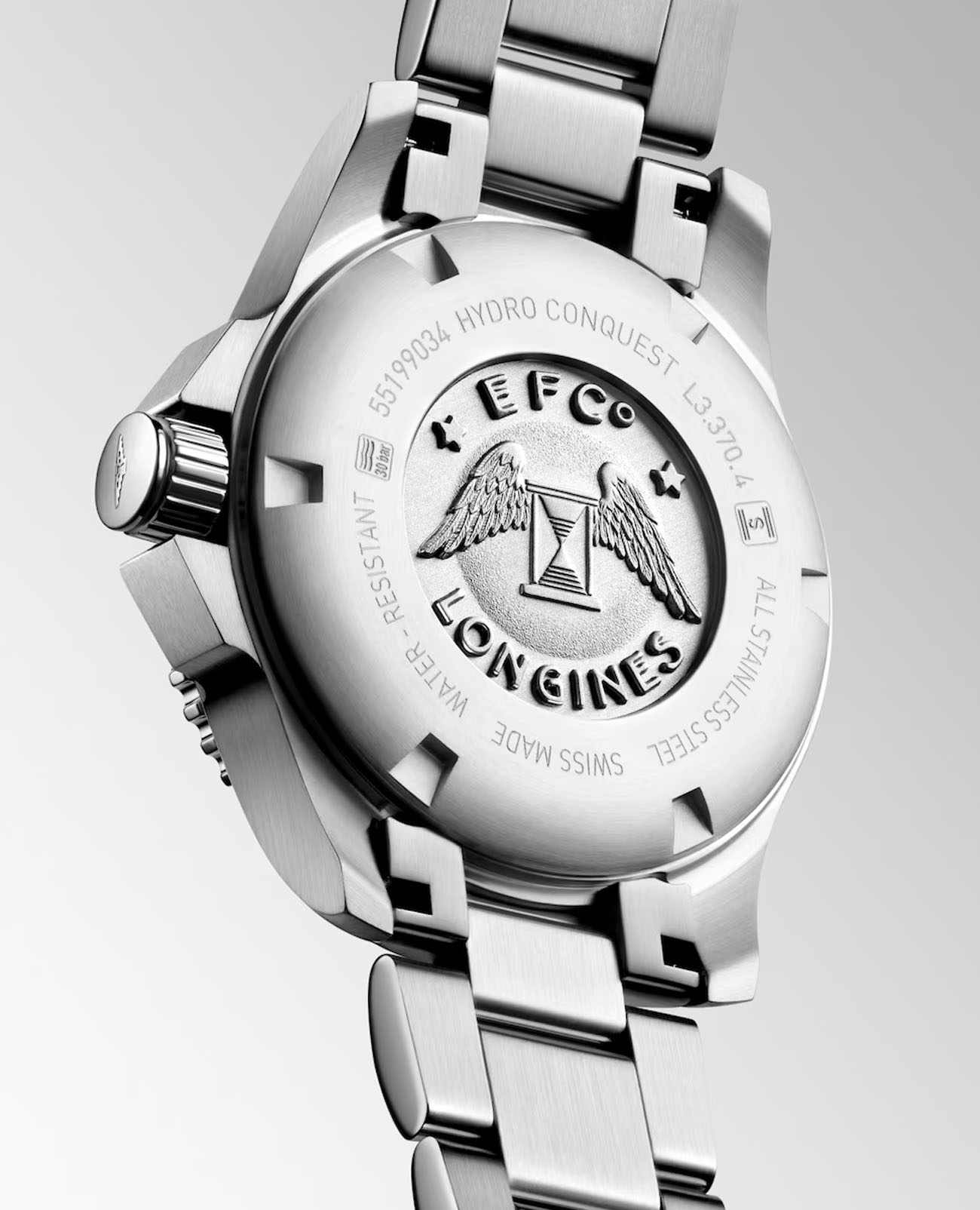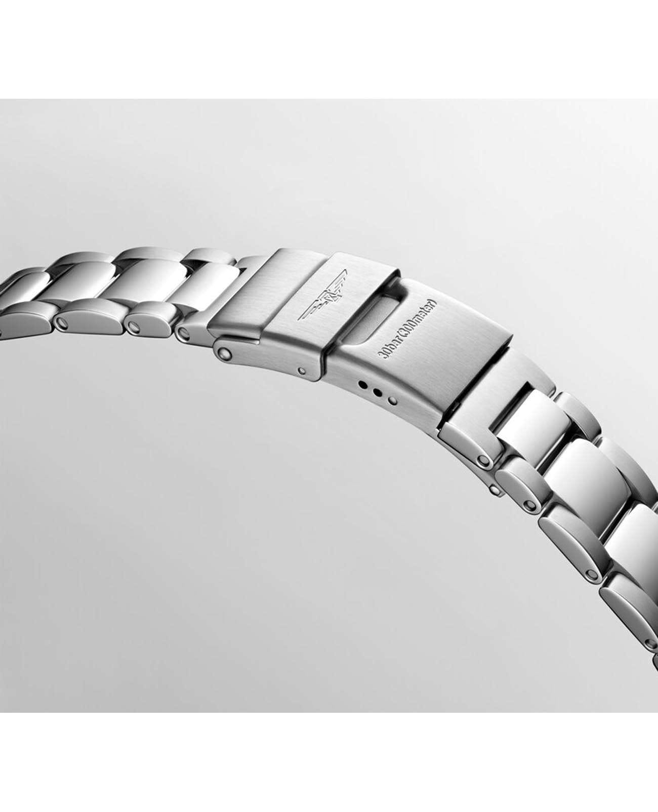 Швейцарские часы для дайвинга Longines HydroConquest L3.370.4.87.6, кварцевый механизм с высокой точностью. Сапфировое стеклоСапфировое стеклоПрочный и надёжный материал из кристалла сапфира синтетического происхождения, характеризующийся особой твёрдостью и устойчивостью к царапинам и повреждениям. с многослойным антибликовым покрытием с обеих сторон, устойчивое к появлению царапин, обладающее высокой прозрачностью. Корпус часов изготовлен из стали. Вращающийся безельБезельВнешний ободок, закрепляющий стекло. В спортивных часах так называется поворотное кольцо с делениями на циферблате, выполняет роль таймера – замеряет отрезки времени на шкале. Неподвижный безель – элемент декора. Однонаправленно вращающийся безель на дайверских часах позволяет фиксировать моменты погружения и выныривания на поверхность. из стали и керамики, защищенный от царапин, никогда не изнашивается и не выцветает. Циферблат с 11 бриллиантами группы Top Wesselton VS-SI общим весом 0.044 карата. Стрелки и метки с люминесцентным покрытиемЛюминесцентное покрытиеПозволяет считывать показания времени в темноте. Производители наносят на стрелки, часовые индексы, безель или поверхность циферблата светонакопительный состав, дающий холодное свечение.. Окошко даты находится в положении 3 часов. Класс водозащиты: 300 метров, позволит плавать, нырять и заниматься другими водными видами спорта. Стальной на раскладной застёжкеРаскладная застёжкаТакой тип застёжки используется только на браслетах из металла. Она никогда не раскрывается полностью, происходит разделение на 2 и более частей. Раскладывающая застёжка снизит вероятность потери часов к минимуму..