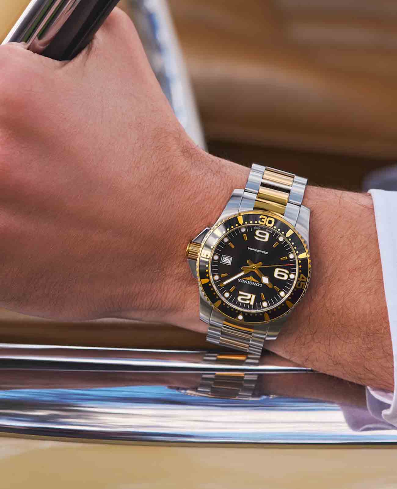 Мужсике швейцарские часы Longines Hydroconquest L3.740.3.56.7, кварцевый механизм с высокой точностью. Сапфировое стеклоСапфировое стеклоПрочный и надёжный материал из кристалла сапфира синтетического происхождения, характеризующийся особой твёрдостью и устойчивостью к царапинам и повреждениям. устойчивое к появлению царапин, обладающее высокой прозрачностью. Корпус часов изготовлен из нержавеющей стали. Вращающийся безельБезельВнешний ободок, закрепляющий стекло. В спортивных часах так называется поворотное кольцо с делениями на циферблате, выполняет роль таймера – замеряет отрезки времени на шкале. Неподвижный безель – элемент декора. Однонаправленно вращающийся безель на дайверских часах позволяет фиксировать моменты погружения и выныривания на поверхность. с PVD-покрытиемPVDУльтратонкое покрытие наносится в технике вакуумного напыления, сочетает в себе нитрид титана особой прочности со слоем золота или оксида хрома. Несёт в себе декоративную или защитную функцию.. Окошко даты в положении 3 часа. Стрелки и метки с люминесцентным покрытиемЛюминесцентное покрытиеПозволяет считывать показания времени в темноте. Производители наносят на стрелки, часовые индексы, безель или поверхность циферблата светонакопительный состав, дающий холодное свечение.. Класс водозащиты: 300 метров, позволит плавать, нырять и заниматься другими водными видами спорта. Стальной браслет с частичным PVD-покрытиемPVDУльтратонкое покрытие наносится в технике вакуумного напыления, сочетает в себе нитрид титана особой прочности со слоем золота или оксида хрома. Несёт в себе декоративную или защитную функцию. на раскладной застёжкеРаскладная застёжкаТакой тип застёжки используется только на браслетах из металла. Она никогда не раскрывается полностью, происходит разделение на 2 и более частей. Раскладывающая застёжка снизит вероятность потери часов к минимуму..