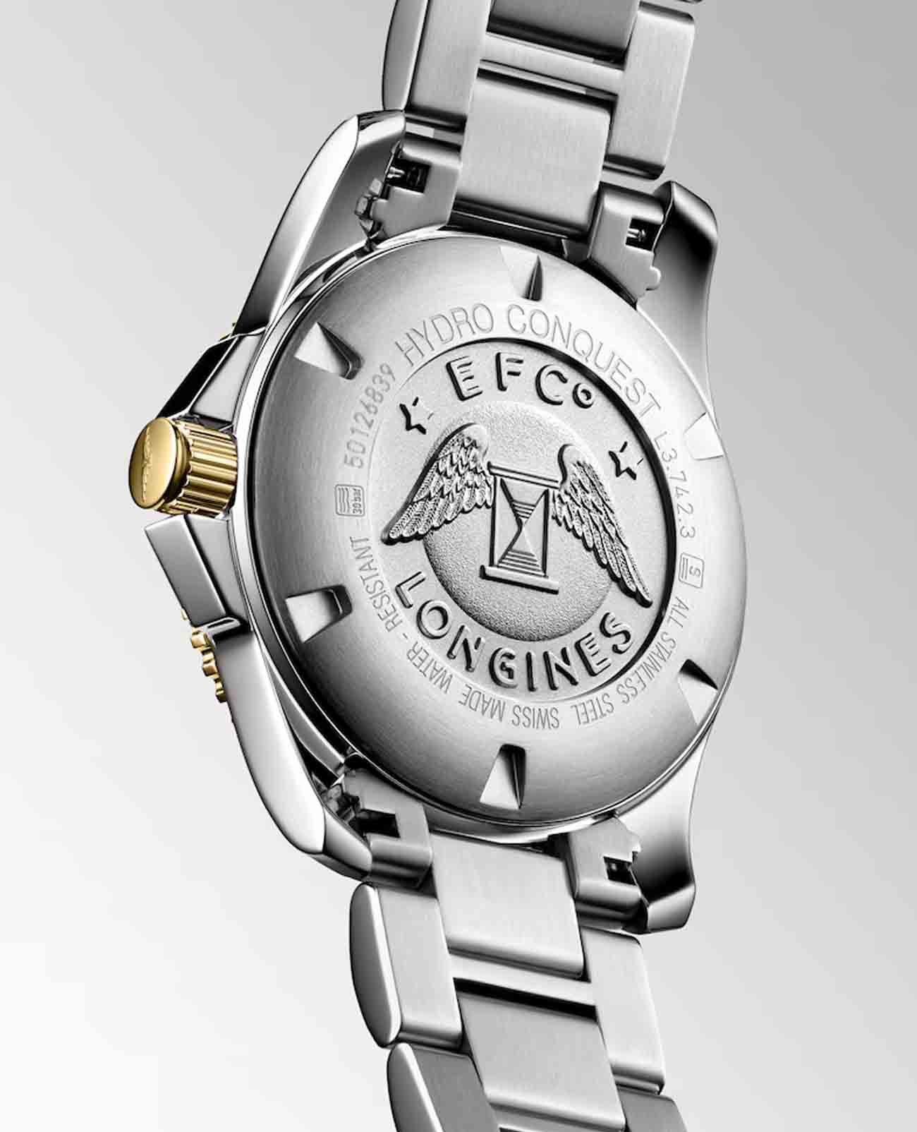 Мужские механические швейцарские часы Longines HydroConquest L3.742.3.96.7 – это настоящие титаны среди спортивных часов, способные выдержать любые испытания, возникающие под водой. Корпус из нержавеющей стали, оснащенный вращающимся стальным безелемБезельВнешний ободок, закрепляющий стекло. В спортивных часах так называется поворотное кольцо с делениями на циферблате, выполняет роль таймера – замеряет отрезки времени на шкале. Неподвижный безель – элемент декора. Однонаправленно вращающийся безель на дайверских часах позволяет фиксировать моменты погружения и выныривания на поверхность. SuperLumiNova, не знает компромиссов, когда речь идет о защите от коррозии и износа. Покрытие из нержавеющей стали с PVD-покрытиемPVDУльтратонкое покрытие наносится в технике вакуумного напыления, сочетает в себе нитрид титана особой прочности со слоем золота или оксида хрома. Несёт в себе декоративную или защитную функцию. и керамикой, объединенными для создания максимальной прочности, обеспечивает устойчивость к самым суровым условиям эксплуатации.