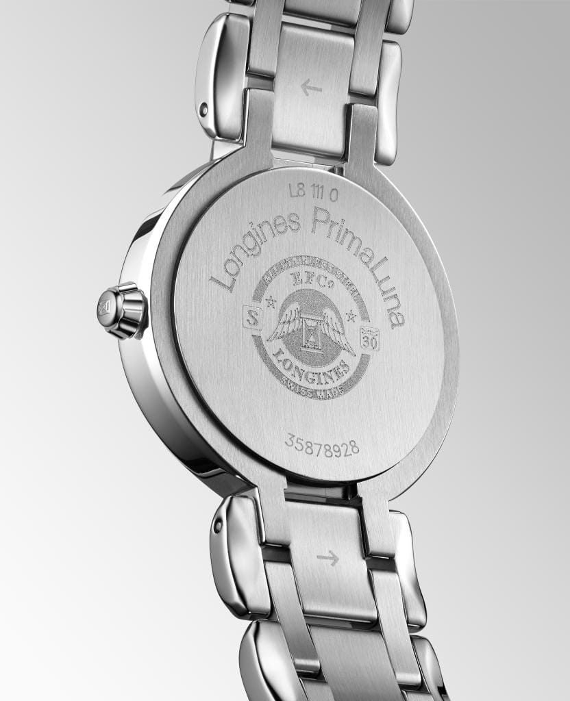 Женские швейцарские механические часы с автоподзаводом Longines PrimaLuna L8.111.0.87.6. Исключительно женственная коллекция. Округлые, нежные линии Longines Prima Luna - дань преклонения перед женственной Луной, символом переменчивости времени. Сапфировое стеклоСапфировое стеклоПрочный и надёжный материал из кристалла сапфира синтетического происхождения, характеризующийся особой твёрдостью и устойчивостью к царапинам и повреждениям. устойчивое к появлению царапин, обладающее высокой прозрачностью. Корпус часов изготовлен из нержавеющей стали. БезельБезельВнешний ободок, закрепляющий стекло. В спортивных часах так называется поворотное кольцо с делениями на циферблате, выполняет роль таймера – замеряет отрезки времени на шкале. Неподвижный безель – элемент декора. Однонаправленно вращающийся безель на дайверских часах позволяет фиксировать моменты погружения и выныривания на поверхность. и циферблат инкрустированы бриллиантами. Корпус с 44 бриллиантами группы Top Wesselton IF-VVS общим весом 0.299 карата. Циферблат с 11 бриллиантами группы Top Wesselton VS-SI общим весом 0.032 карата. Окошко даты в положении 3 часов. Класс водозащиты: 30 метров, позволит защитить корпус от случайных брызг или капель дождя. Стальной браслет на застёжке-бабочке с кнопкамиЗастёжка "бабочка"Такой вид застёжки дополняется предохранителями, помогающими избежать случайного раскрытия браслета. Обладают изящным исполнением. .