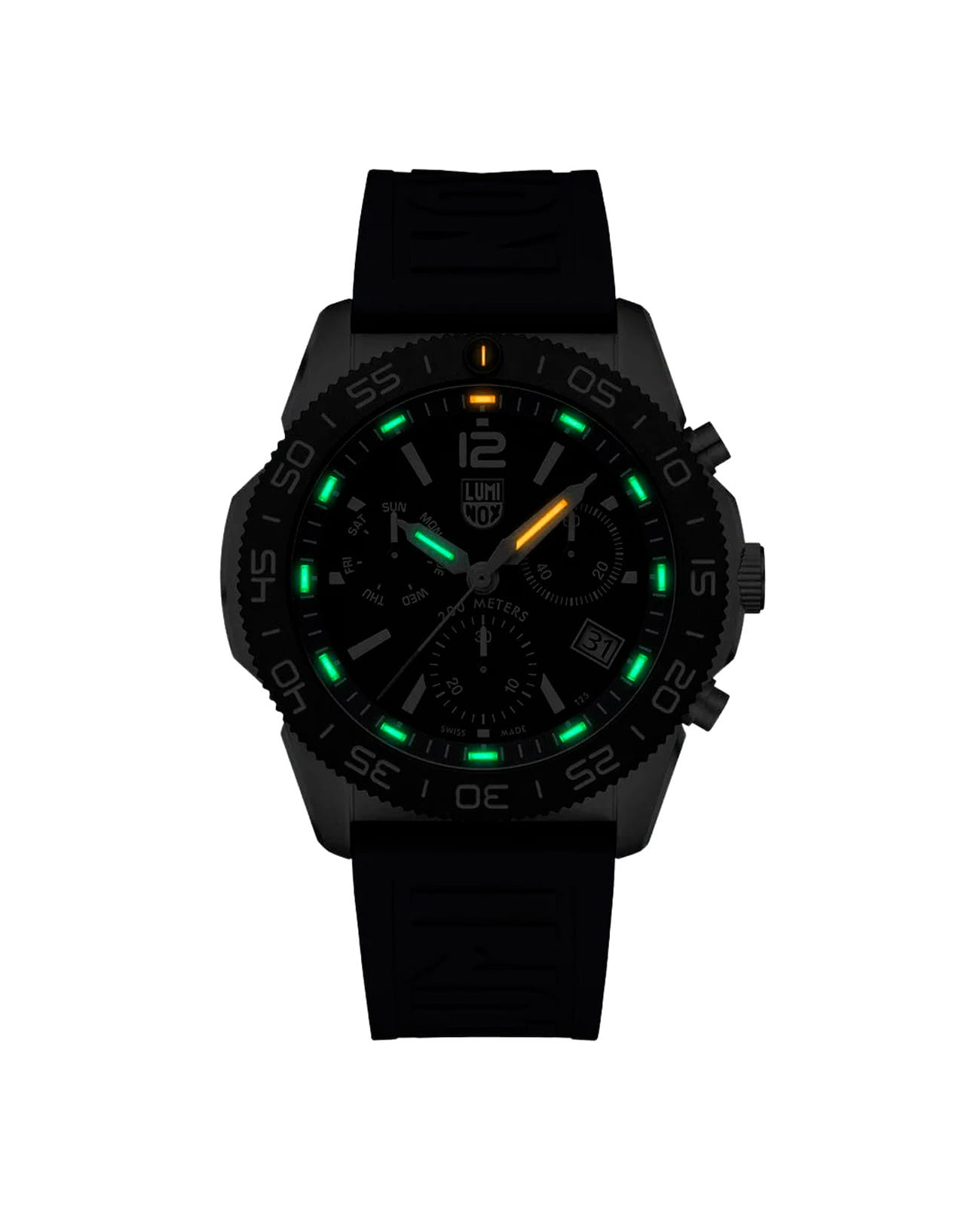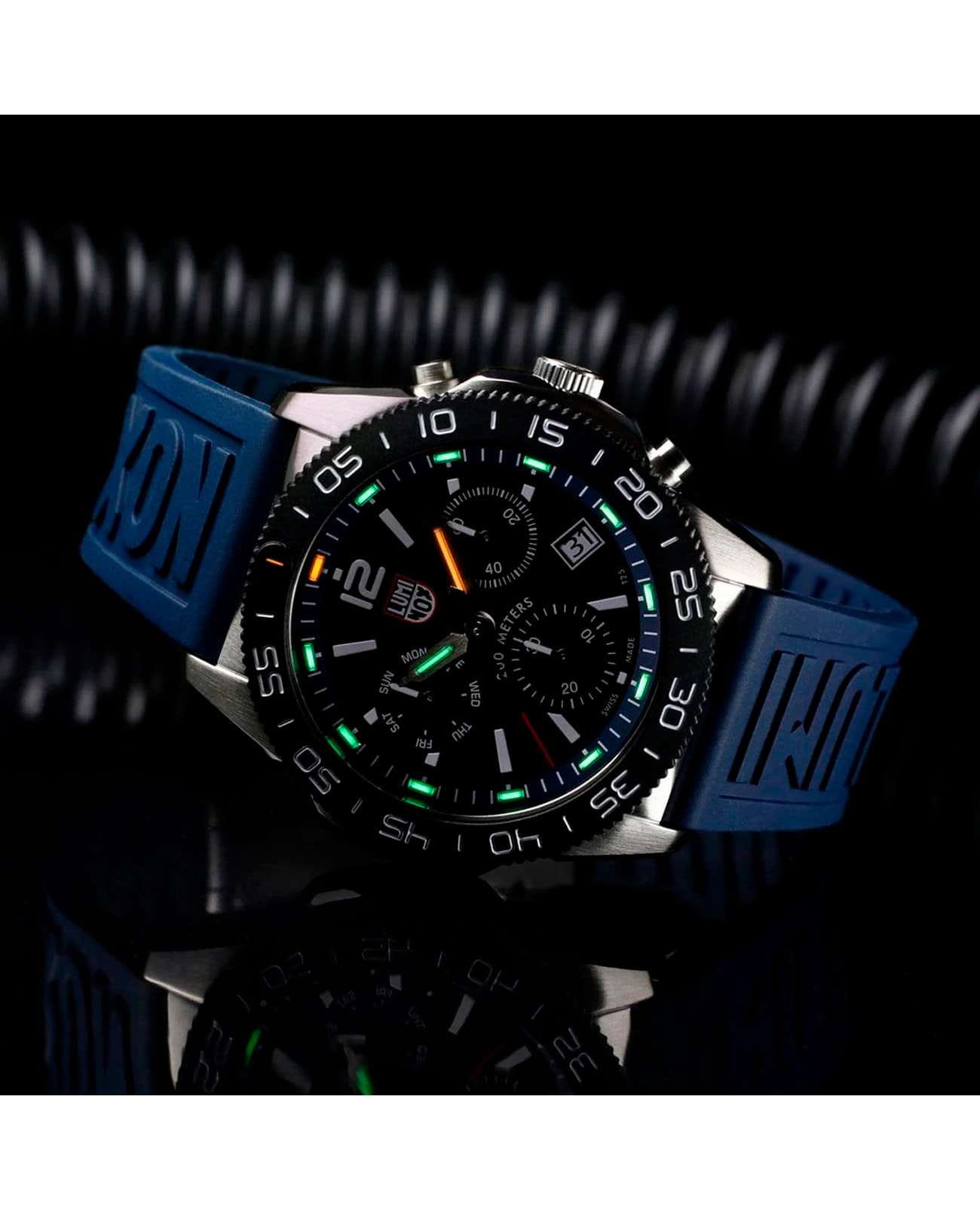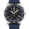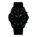 Мужские наручные часы-хронографХронографФункция позволяет измерять отрезки времени с особой точностью: часы, минуты, секунды. Верным признаком хронографа является наличие на циферблате 3 дополнительных окошек-счётчиков. Luminox XS.3143.SET из коллекции Pacific Diver сочетают в себе спортивный дизайн и надежность швейцарского качества . Модель обладает круглым корпусом диаметром 44 мм, изготовленным из нержавеющей стали, что обеспечивает высокую устойчивость к внешним воздействиям и долговечность . Циферблат черного цвета украшен контрастными метками и стрелками с люминесцентным покрытиемЛюминесцентное покрытиеПозволяет считывать показания времени в темноте. Производители наносят на стрелки, часовые индексы, безель или поверхность циферблата светонакопительный состав, дающий холодное свечение., гарантирующим постоянную видимость времени даже в условиях низкой освещенности благодаря системе LLTLLTLLT — это автономный механизм подсветки, основанный на использовании микроскопических газонаполненных элементов. Специальные герметичные капсулы из боросиликатного стекла, интегрированные в циферблат, генерируют свечение без необходимости подключения к внешним источникам энергии. Для их работы не требуется ни дополнительный свет, ни механическое воздействие (например, нажатие кнопки). Свечение возникает благодаря химическому процессу: реакция между тритием, заключенным в капсулах, и люминофорным покрытием создает стабильное автономное освещение. Технология обеспечивает энергетическую независимость и долговечность подсветки. (микрогазовые огни) . Часы оснащены кварцевым механизмом швейцарского производства Ronda 515, обеспечивающим точность хода ±15 секунд в месяц . Защиту циферблата обеспечивает прочное сапфировое стеклоСапфировое стеклоПрочный и надёжный материал из кристалла сапфира синтетического происхождения, характеризующийся особой твёрдостью и устойчивостью к царапинам и повреждениям. с антибликовым покрытиемАнтибликовое покрытиеСлой оксида металла в 0,13-0,3 микрон, благодаря которому стекло часов не бликует и не отражает свет. Антибликовое покрытие уменьшает отражение света в 10 раз, обеспечивая отличную читаемость показателей циферблата., устойчивое к царапинам и механическим повреждениям . Водонепроницаемость модели достигает 20 атмосфер (200 метров), что делает их подходящими для плавания и активного отдыха на воде, включая дайвинг . Модель также оснащена безелемБезельВнешний ободок, закрепляющий стекло. В спортивных часах так называется поворотное кольцо с делениями на циферблате, выполняет роль таймера – замеряет отрезки времени на шкале. Неподвижный безель – элемент декора. Однонаправленно вращающийся безель на дайверских часах позволяет фиксировать моменты погружения и выныривания на поверхность. с односторонним вращением, что добавляет функциональности при использовании в водных условиях . Ремешок выполнен из каучука, что обеспечивает комфортное ношение в течение дня и удобство в уходе . Дополнительно часы имеют окно даты в положении «3 часа», что делает их практичными для повседневного использования . Сочетание современных технологий, надежности и стильного дизайна делает Luminox XS.3143.SET идеальным выбором для ценителей качественных аксессуаров. В комплекте идет дополнительный черный каучуковый р