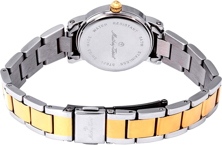 Женские кварцевые часы Mathey-Tissot City Metal D31186MBI — это стильное сочетание элегантности и современного дизайна. Изящный корпус выполнен из стали 316L с безелемБезельВнешний ободок, закрепляющий стекло. В спортивных часах так называется поворотное кольцо с делениями на циферблате, выполняет роль таймера – замеряет отрезки времени на шкале. Неподвижный безель – элемент декора. Однонаправленно вращающийся безель на дайверских часах позволяет фиксировать моменты погружения и выныривания на поверхность. с PVD-покрытиемPVDУльтратонкое покрытие наносится в технике вакуумного напыления, сочетает в себе нитрид титана особой прочности со слоем золота или оксида хрома. Несёт в себе декоративную или защитную функцию., что придаст образу женственности и романтизма. Изысканный циферблат с метками в виде штрихов придает модели особый блеск и защищен минеральным стекломМинеральное стеклоМинеральное стекло представляет собой искусственно выращенный минерал кварца. Такое стекло отличается особой устойчивостью к повреждениям и царапинам. Уступает по некоторым качествам сапфировому стеклу. с сапфировым покрытием, обеспечивающим устойчивость к царапинам. Центральные часовая, минутная стрелки. Часы оснащены надежным кварцевым механизмом. Окошко даты находится в положении 3 часа. Стальной браслет с частичным PVD-покрытиемPVDУльтратонкое покрытие наносится в технике вакуумного напыления, сочетает в себе нитрид титана особой прочности со слоем золота или оксида хрома. Несёт в себе декоративную или защитную функцию.  на раскладной застёжкеРаскладная застёжкаТакой тип застёжки используется только на браслетах из металла. Она никогда не раскрывается полностью, происходит разделение на 2 и более частей. Раскладывающая застёжка снизит вероятность потери часов к минимуму., гарантирующего комфортное и безопасное ношение. Класс водозащиты: 30 метров позволит защитить корпус от случайных брызг или капель дождя. Mathey-Tissot  — отличный выбор для тех, кто ценит утонченность и качество.