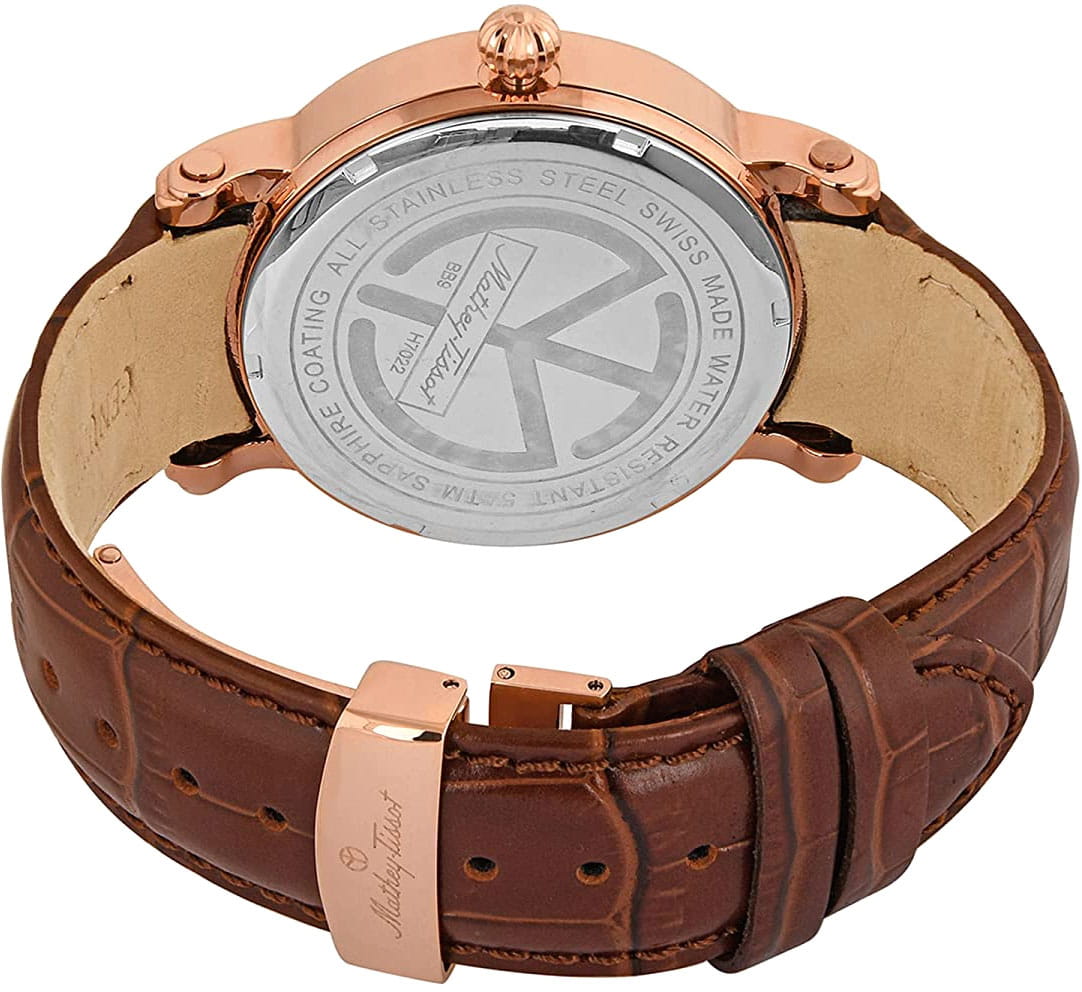 Mathey-Tissot Retrograde H7022PI — практичные часы с ярким дизайном и ретроградным указателем дня недели станут отличным вариантом на каждый день. Изящный корпус выполнен из нержавеющей стали с PVD-покрытиемPVDУльтратонкое покрытие наносится в технике вакуумного напыления, сочетает в себе нитрид титана особой прочности со слоем золота или оксида хрома. Несёт в себе декоративную или защитную функцию. цвета розового золота, диаметром 43 мм, что придаст образу элегантности и надежности. Изысканный циферблат с метками в виде штрихов придает модели особый блеск. Циферблат защищен минеральным стекломМинеральное стеклоМинеральное стекло представляет собой искусственно выращенный минерал кварца. Такое стекло отличается особой устойчивостью к повреждениям и царапинам. Уступает по некоторым качествам сапфировому стеклу., обеспечивает устойчивость к царапинам. Стрелки с люминесцентным покрытиемЛюминесцентное покрытиеПозволяет считывать показания времени в темноте. Производители наносят на стрелки, часовые индексы, безель или поверхность циферблата светонакопительный состав, дающий холодное свечение.. Окошко даты находится в положении 6 часов. Часы оснащены надежным кварцевым механизмом. Кожаный ремешок на раскладной застёжкеРаскладная застёжкаТакой тип застёжки используется только на браслетах из металла. Она никогда не раскрывается полностью, происходит разделение на 2 и более частей. Раскладывающая застёжка снизит вероятность потери часов к минимуму. гарантирует комфортное и безопасное ношение. Класс водозащиты: 50 метров позволит защитить корпус от случайных брызг или капель дождя. Mathey-Tissot  — отличный выбор для тех, кто ценит утонченность и качество.