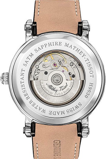 Mathey-Tissot Renaissance H9030AN — классический стиль в исполнении, надежность и качество - часы с мужским характером. Мужские механические часы с автоподзаводом. Изящный корпус выполнен из нержавеющей стали, диаметром 43 мм, что придаст образу элегантности и надежности. Изысканный циферблат с метками в виде римских цифр придает модели особый блеск. Циферблат защищен сапфировым стекломСапфировое стеклоПрочный и надёжный материал из кристалла сапфира синтетического происхождения, характеризующийся особой твёрдостью и устойчивостью к царапинам и повреждениям., обеспечивает устойчивость к царапинам. Стрелки с люминесцентным покрытиемЛюминесцентное покрытиеПозволяет считывать показания времени в темноте. Производители наносят на стрелки, часовые индексы, безель или поверхность циферблата светонакопительный состав, дающий холодное свечение.. Окошко даты находится в положении 3 часа. Кожаный ремешок на раскладной застёжкеРаскладная застёжкаТакой тип застёжки используется только на браслетах из металла. Она никогда не раскрывается полностью, происходит разделение на 2 и более частей. Раскладывающая застёжка снизит вероятность потери часов к минимуму. гарантирует комфортное и безопасное ношение. Класс водозащиты: 50 метров позволит защитить корпус от случайных брызг или капель дождя. Mathey-Tissot  — отличный выбор для тех, кто ценит утонченность и качество.