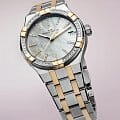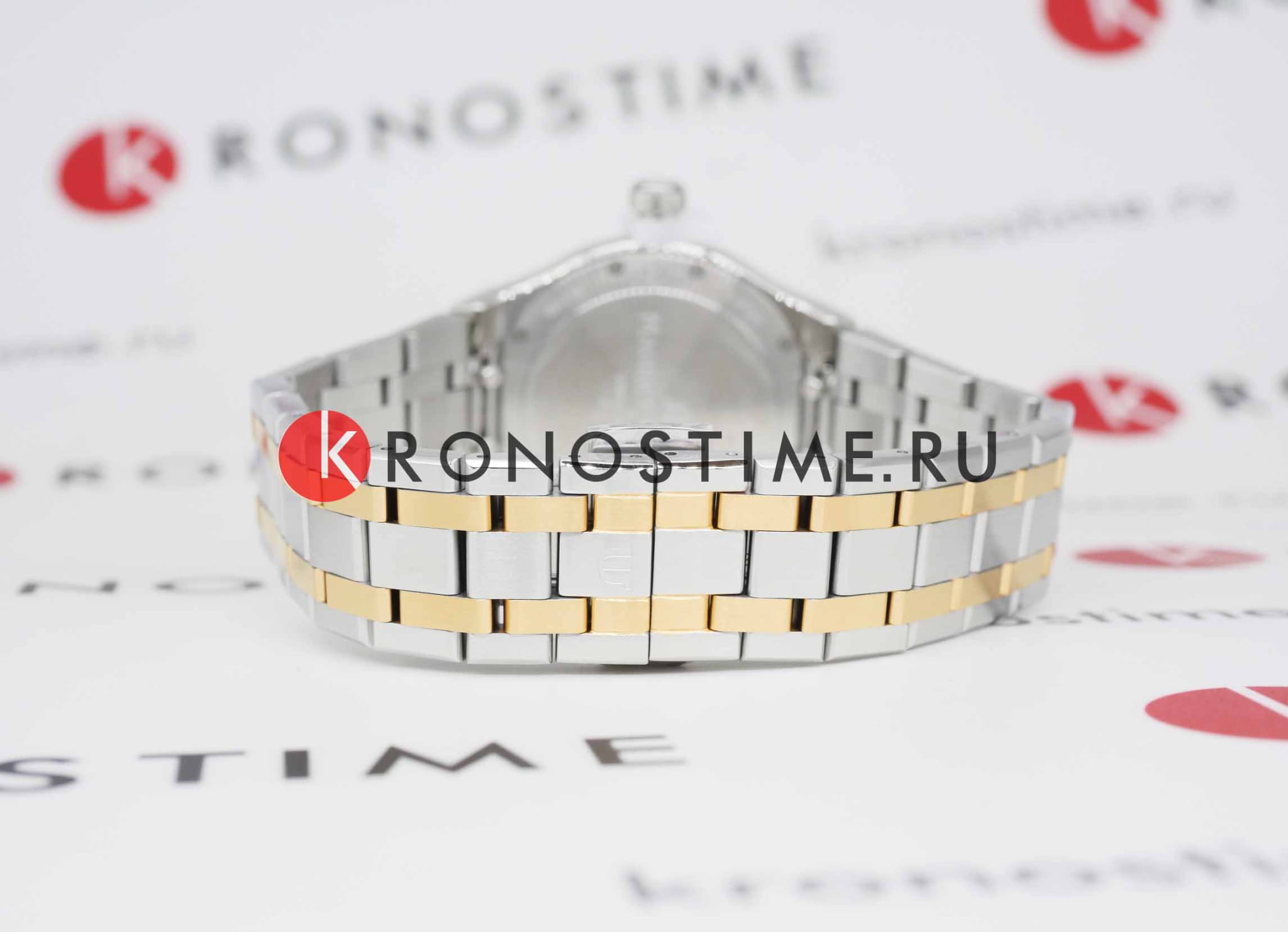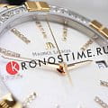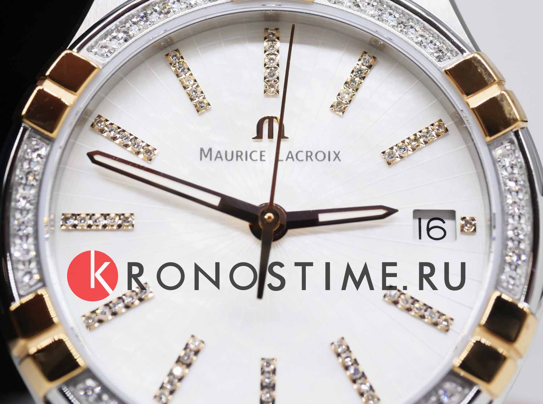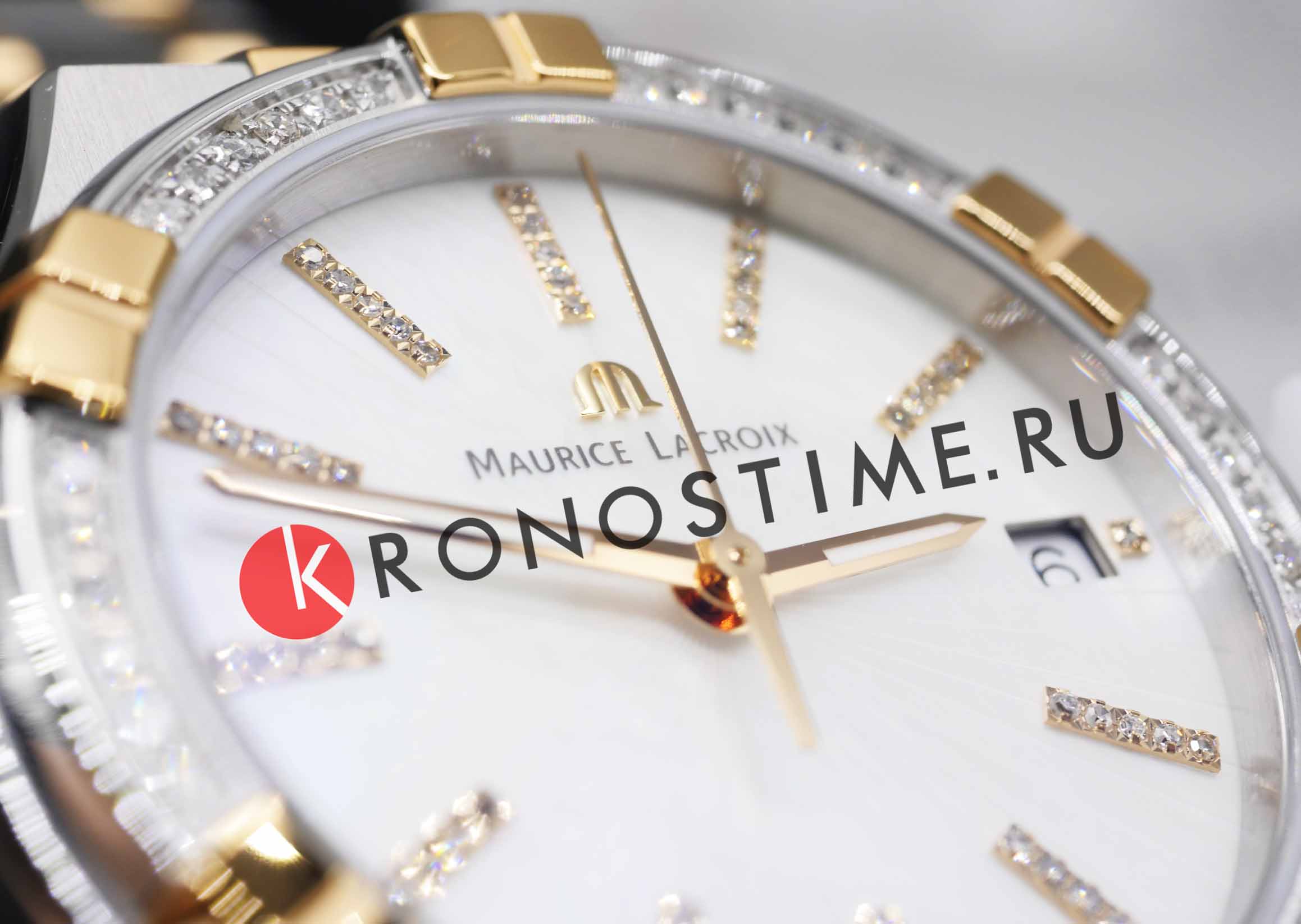 Мужские швейцарские кварцевые часы Maurice Lacroix Aikon Quartz AI1106-PVPD2-170-1. Сапфировое стеклоСапфировое стеклоПрочный и надёжный материал из кристалла сапфира синтетического происхождения, характеризующийся особой твёрдостью и устойчивостью к царапинам и повреждениям. устойчивое к появлению царапин, обладающее высокой прозрачностью. Перламутровый циферблат. Стрелки с люминесцентным покрытиемЛюминесцентное покрытиеПозволяет считывать показания времени в темноте. Производители наносят на стрелки, часовые индексы, безель или поверхность циферблата светонакопительный состав, дающий холодное свечение.. Метки на циферблате и безельБезельВнешний ободок, закрепляющий стекло. В спортивных часах так называется поворотное кольцо с делениями на циферблате, выполняет роль таймера – замеряет отрезки времени на шкале. Неподвижный безель – элемент декора. Однонаправленно вращающийся безель на дайверских часах позволяет фиксировать моменты погружения и выныривания на поверхность. украшены бриллиантами. Класс водозащиты: 100 метров, позволит плавать, нырять и заниматься другими водными видами спорта. Окошко даты находится в положении 3 часов. Корпус и браслет часов изготовлены из стали с частичным PVD-покрытиемPVDУльтратонкое покрытие наносится в технике вакуумного напыления, сочетает в себе нитрид титана особой прочности со слоем золота или оксида хрома. Несёт в себе декоративную или защитную функцию.. Браслет с застёжкой «бабочка» с кнопкамиЗастёжка "бабочка"Такой вид застёжки дополняется предохранителями, помогающими избежать случайного раскрытия браслета. Обладают изящным исполнением. .
