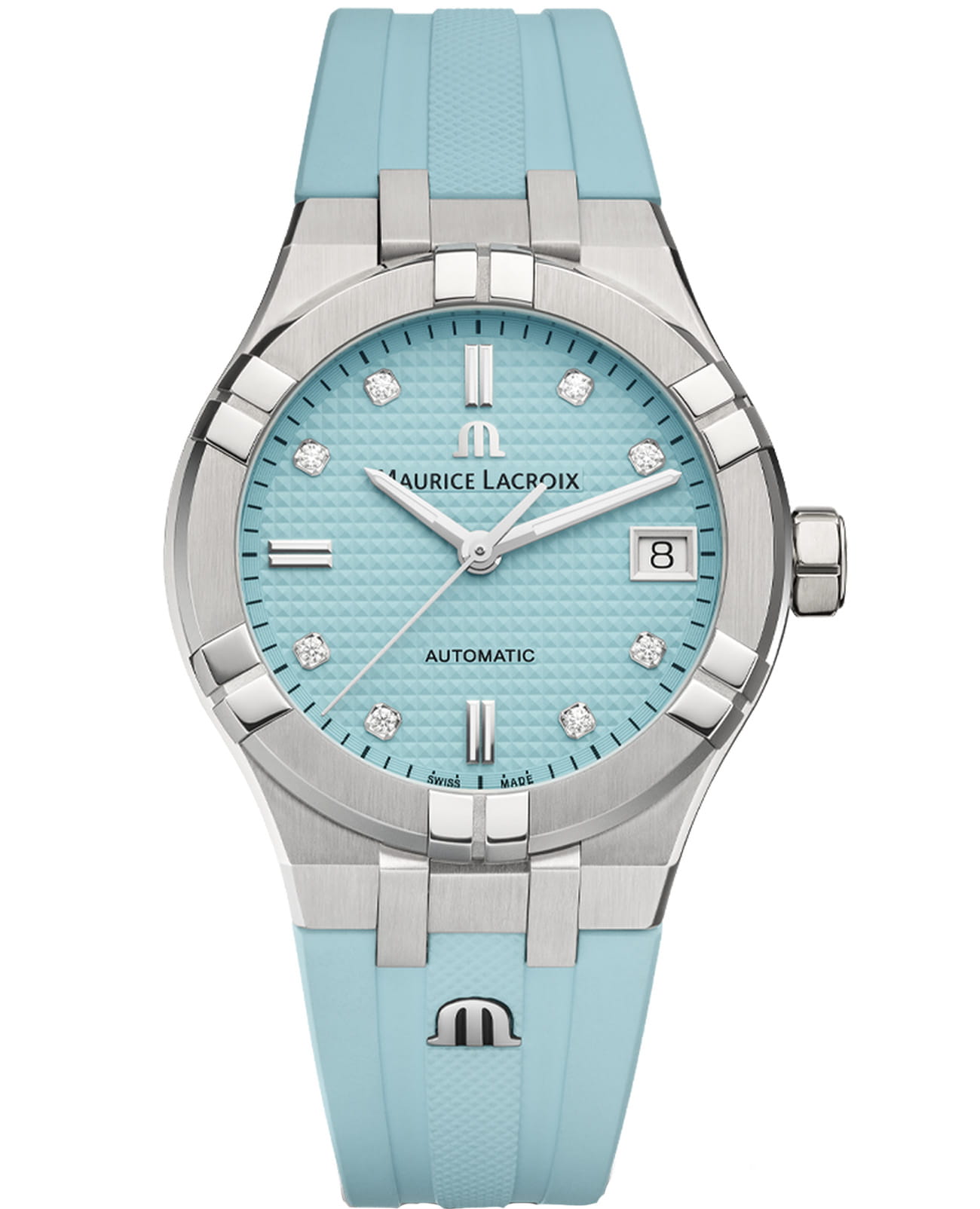 Часы Maurice Lacroix Aikon Automatic Limited Summer Edition 35 mm (AI6006-SS00F-451-C) из лимитированной коллекции отличаются элегантностью и современным стилем. Корпус диаметром 35 мм выполнен из нержавеющей стали с чередованием полированных и сатинированных поверхностей, а циферблат бирюзового цвета с узором "clous de Paris" украшен восьмью бриллиантами.