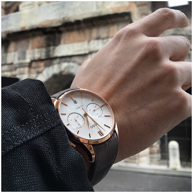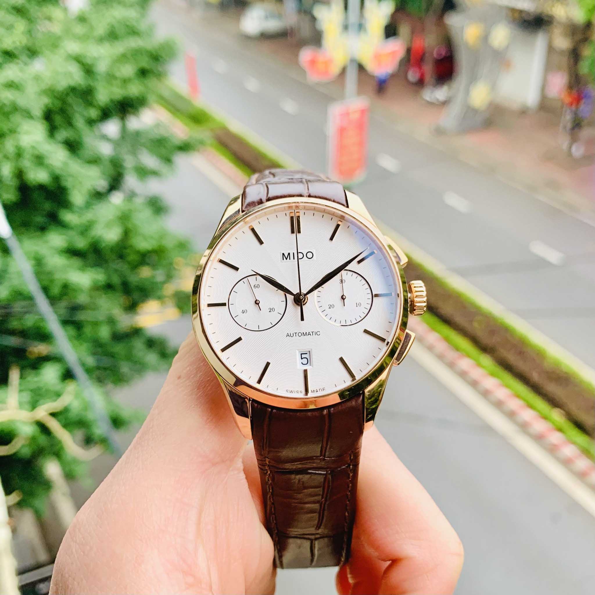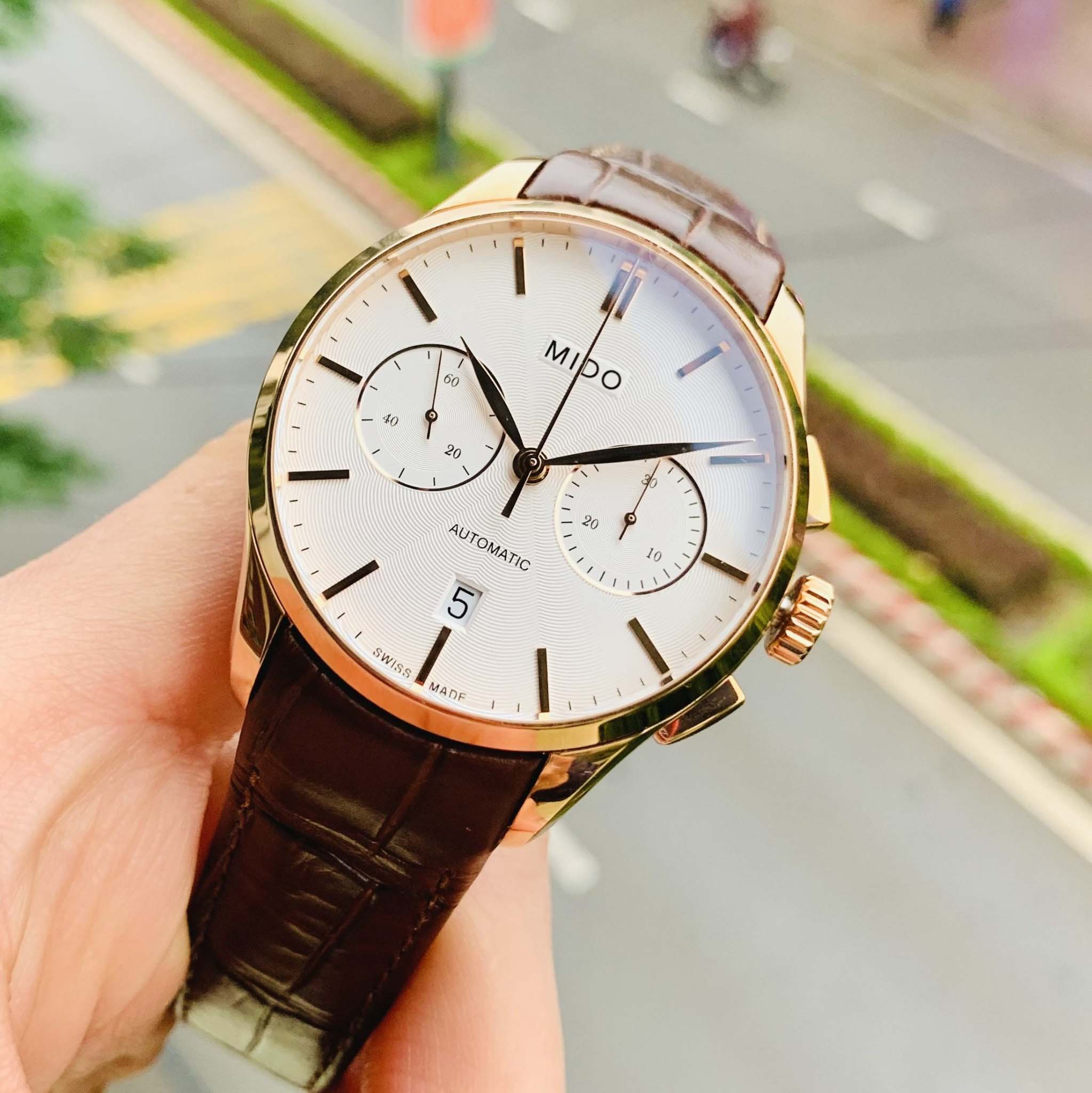 Мужские швейцарские механические часы Mido Belluna Sunray M024.427.36.031.00, оснащенные механизмом Caliber 60 часы Belluna Chronograph со стрелками и часовыми метками с PVD-покрытием цвета розового золота, прямоугольными кнопками и функцией хронографаХронографФункция позволяет измерять отрезки времени с особой точностью: часы, минуты, секунды. Верным признаком хронографа является наличие на циферблате 3 дополнительных окошек-счётчиков.. Посредством исключительно сложной технологии, на компоненты часов наносится PVDPVDУльтратонкое покрытие наносится в технике вакуумного напыления, сочетает в себе нитрид титана особой прочности со слоем золота или оксида хрома. Несёт в себе декоративную или защитную функцию. покрытие, которое обеспечивает длительную защиту металла от коррозии.