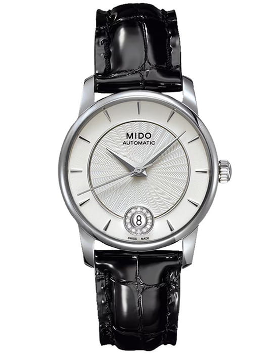 Женские швейцарские механические часы Mido Baroncelli Diamonds M007.207.16.036.00. Механический механизм (автоматический калибр) с высокой точностью. Сапфировое стеклоСапфировое стеклоПрочный и надёжный материал из кристалла сапфира синтетического происхождения, характеризующийся особой твёрдостью и устойчивостью к царапинам и повреждениям. с антибликовым покрытиемАнтибликовое покрытиеСлой оксида металла в 0,13-0,3 микрон, благодаря которому стекло часов не бликует и не отражает свет. Антибликовое покрытие уменьшает отражение света в 10 раз, обеспечивая отличную читаемость показателей циферблата. устойчивое к появлению царапин, обладающее высокой прозрачностью. Корпус выполнен из стали. Прозрачная задняя крышка. Класс водозащиты: 50 метров, позволит защитить корпус от случайных брызг или капель дождя. На циферблате 12 бриллиантов общим весом 0,03 карата, окантовывающих окошко даты. Гильошированный циферблат.
