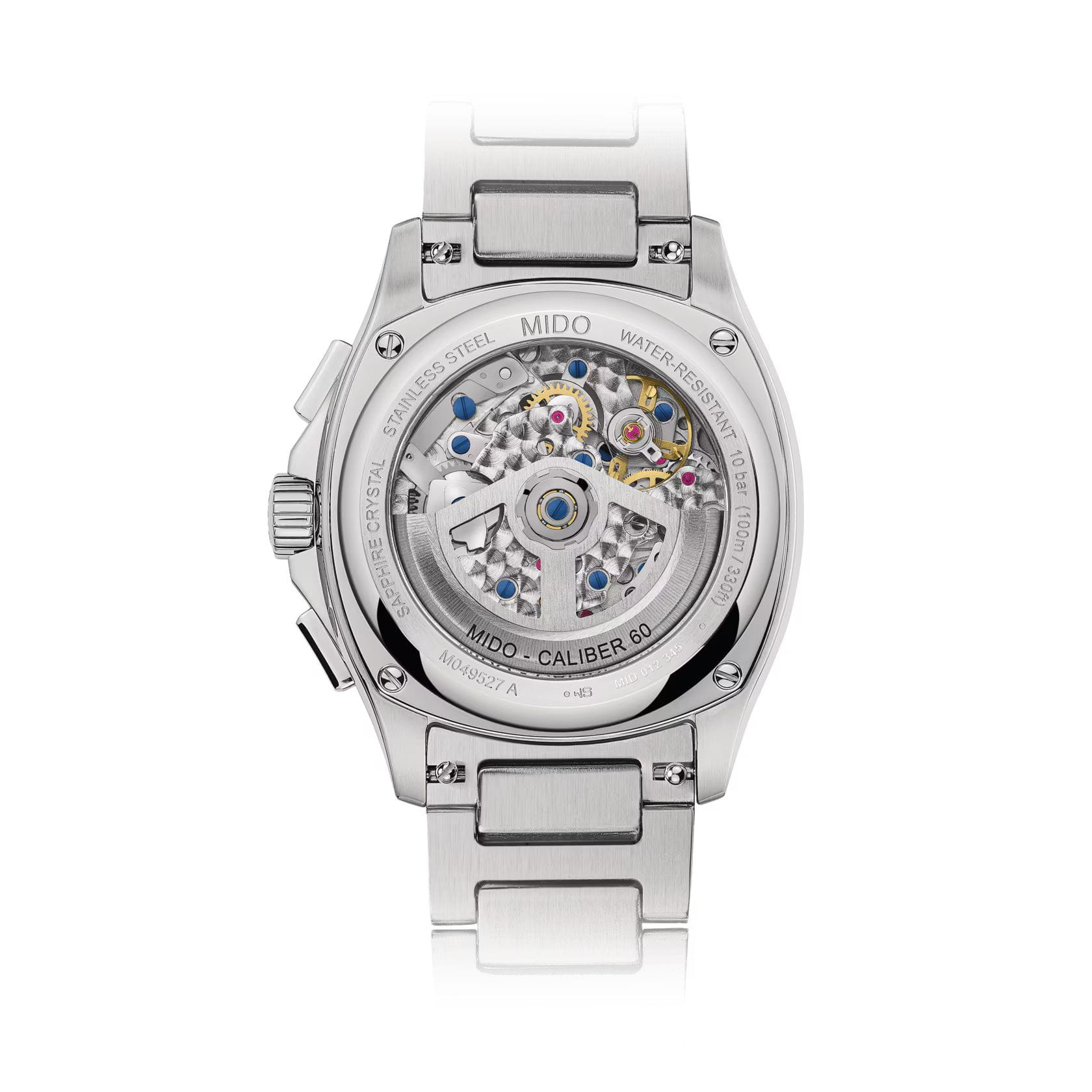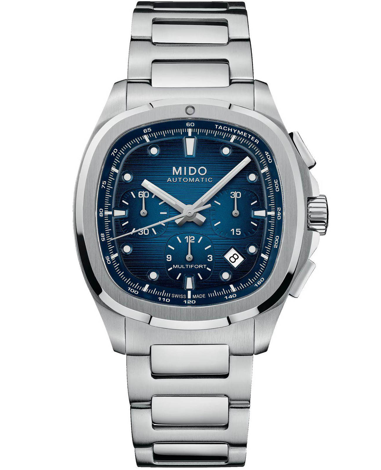 Мужские механические швейцарские часы Mido Multifort TV Chronograph M049.527.11.041.00, механический механизм с высокой точностью. Сапфировое стеклоСапфировое стеклоПрочный и надёжный материал из кристалла сапфира синтетического происхождения, характеризующийся особой твёрдостью и устойчивостью к царапинам и повреждениям. устойчивое к появлению царапин, обладающее высокой прозрачностью. Корпус часов изготовлен из нержавеющей стали. В механизм внедрена пружина баланса Nivachron™Nivachron™Специально разработанный инновационный сплав Nivachron™ повышает устойчивость часов к воздействию магнитных полей.. Стрелки с люминесцентным покрытиемЛюминесцентное покрытиеПозволяет считывать показания времени в темноте. Производители наносят на стрелки, часовые индексы, безель или поверхность циферблата светонакопительный состав, дающий холодное свечение.. Окошко даты в положении между 4 и 6 часами. Класс водозащиты: 100 метров, позволит плавать, нырять и заниматься другими водными видами спорта. Стальной браслет на раскладной застёжкеРаскладная застёжкаТакой тип застёжки используется только на браслетах из металла. Она никогда не раскрывается полностью, происходит разделение на 2 и более частей. Раскладывающая застёжка снизит вероятность потери часов к минимуму..Часы с функциями хронографаХронографФункция позволяет измерять отрезки времени с особой точностью: часы, минуты, секунды. Верным признаком хронографа является наличие на циферблате 3 дополнительных окошек-счётчиков. и тахиметраТахиметрРазмеченная шкала, располагается на ободке или безеле часов. Тахиметр позволяет рассчитать скорость на определённом участке пути, расстояние измеряется в километрах или милях.. Поставляются с дополнительным ремешком, что обеспечивает еще большую универсальность и комфорт.